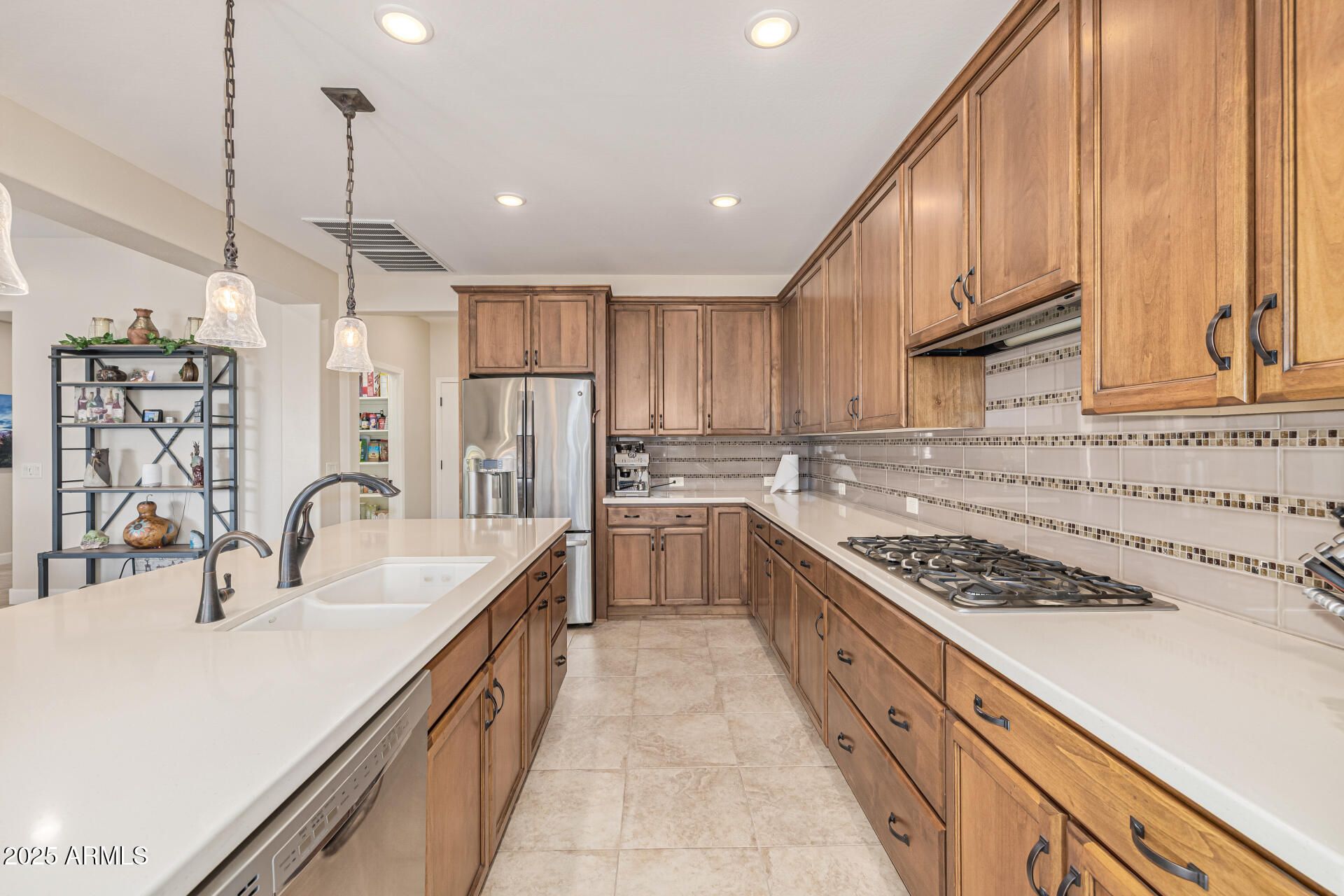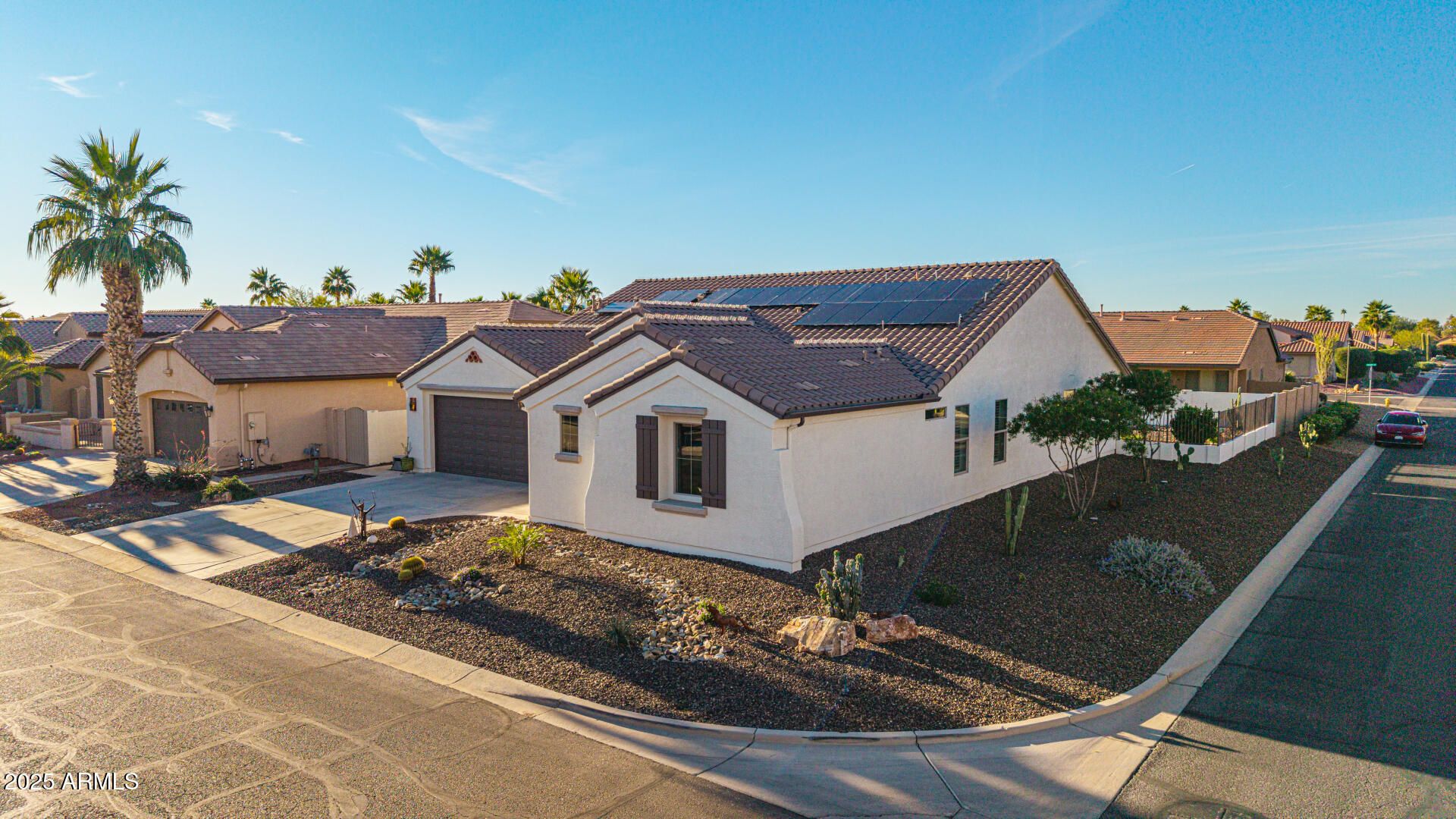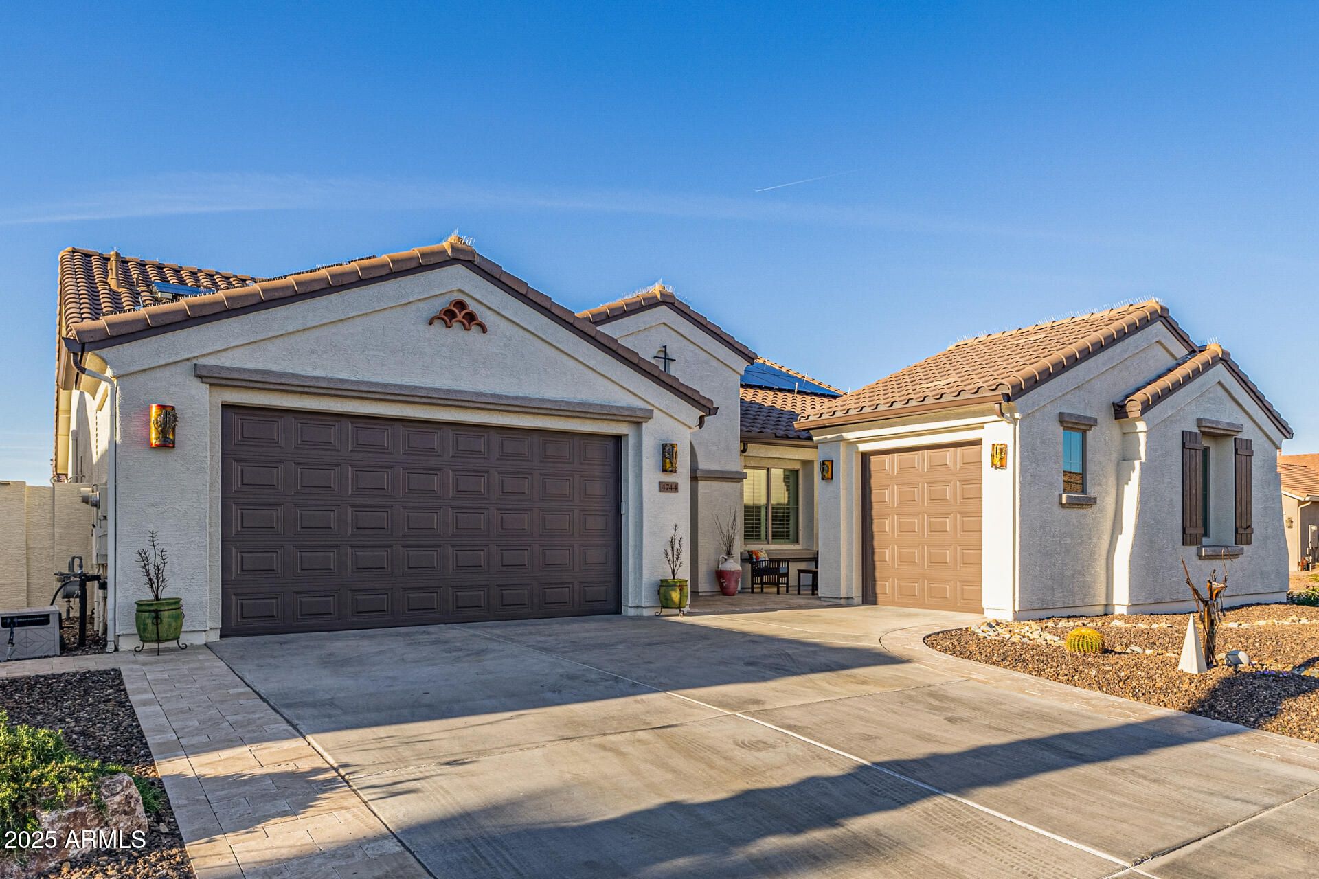 Experience comfort and style in this thoughtfully designed 2+bedroom home nestled on a PRIME corner lot! Many other upgrades and features make this the BEST house in Robson Ranch! This energy-efficient gem offers a 3+car garage with 8 ft doors and 4 ft extension where you can park your full-size truck. Harmonious open floor plan impresses with tile flooring and 12 ft sliding glass doors opening to the back patio. Well-appointed kitchen boasts a walk-in pantry, abundant cabinetry, tile backsplash, stainless steel appliances, quartz counters, and a prep island with a breakfast bar. Serene primary retreat showcases plush carpet, plantation shutters, a private ensuite with dual sinks, a soaking tub, and a walk-in closet. Flexible den with double doors is ideal for an office or study. PLUS! Large backyard includes a covered patio, pergola with convertible shade roof, green turf area, and 3 fruit trees. Did I mention the cost free Hot Tub? (removable if buyer desire) That's right with 22 Solar Panels 100% owned you are living energy free. Plus there is a hookup for your electric car to charge free overnight. Just ask for details...we have them. Hurry! A deal like this won't last!