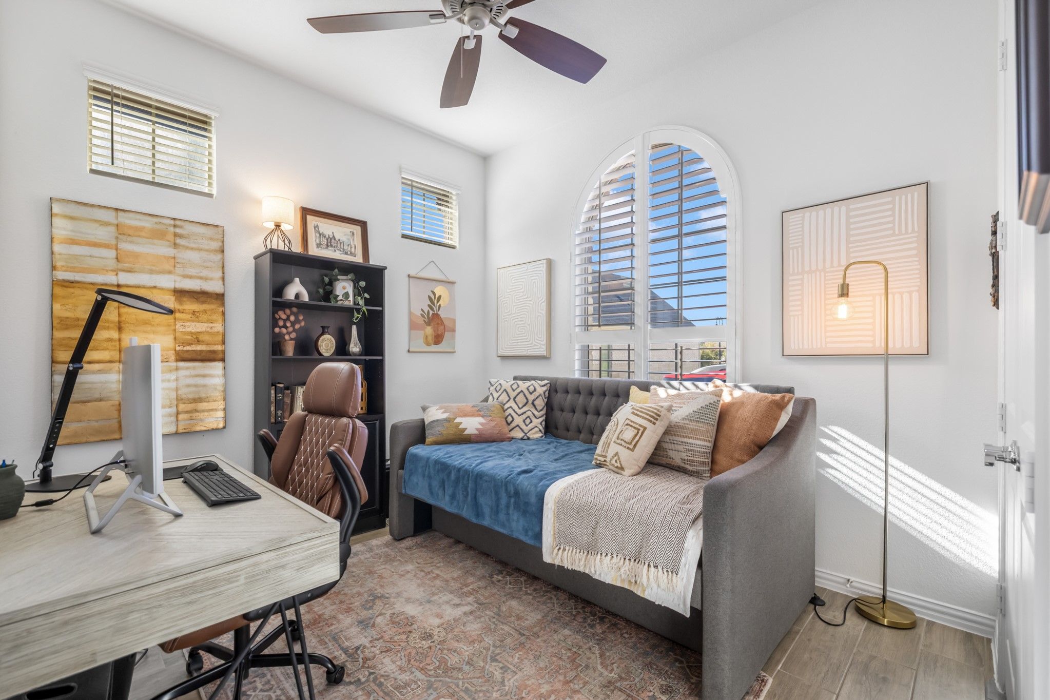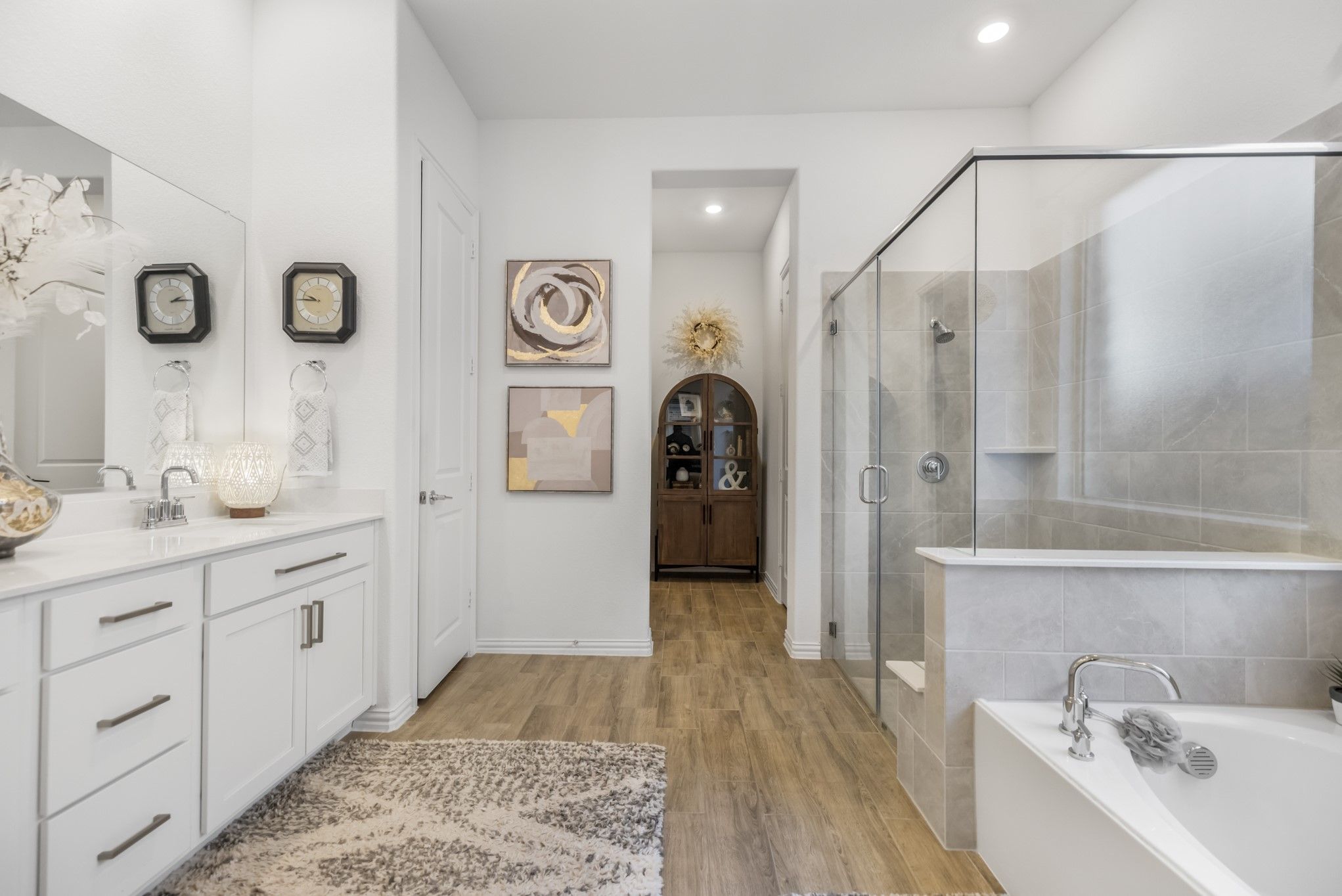 Welcome to this elegant one-story home in the over 55 section of sought-after Viridian community, where low-maintenance living meets modern design and thoughtful upgrades. The classic brick-and-stone exterior and manicured, maintenance-free landscaping create lasting curb appeal, complemented by stamped and stained concrete and keyless entry for everyday convenience. Inside, the open-concept layout is filled with natural light and highlighted by wood-look tile floors that flow seamlessly through the main living spaces. The inviting family room features a sleek fireplace and a wall of windows overlooking the private backyard. The chef’s kitchen impresses with a large quartz island with designer overhead lighting, stainless steel appliances, gas cooktop, double ovens, and under&over-cabinet lighting that enhances both function and style. The spacious primary suite provides a relaxing retreat with a tray ceiling and a luxurious ensuite bath featuring dual vanities, a soaking tub, a frameless glass shower, and an oversized master closet with built-ins. Secondary bedrooms offer comfort and flexibility for guests, hobbies, or office use. Step outside to enjoy the artificial turf yard, creating a private, low-maintenance outdoor oasis ideal for entertaining or relaxing under the covered patio. Additional features include garage storage with ceiling racks, keyless entry, and a fully fenced yard for privacy, making the home a safe place to relax after a long day. Residents of Viridian enjoy resort-style amenities including multiple pools, tennis and pickleball courts, the Lake Club, sailing center, parks, and miles of scenic trails—all just minutes from shopping, dining, and DFW Airport. This stylish home combines easy living, elegant design, and the unmatched lifestyle of Viridian.