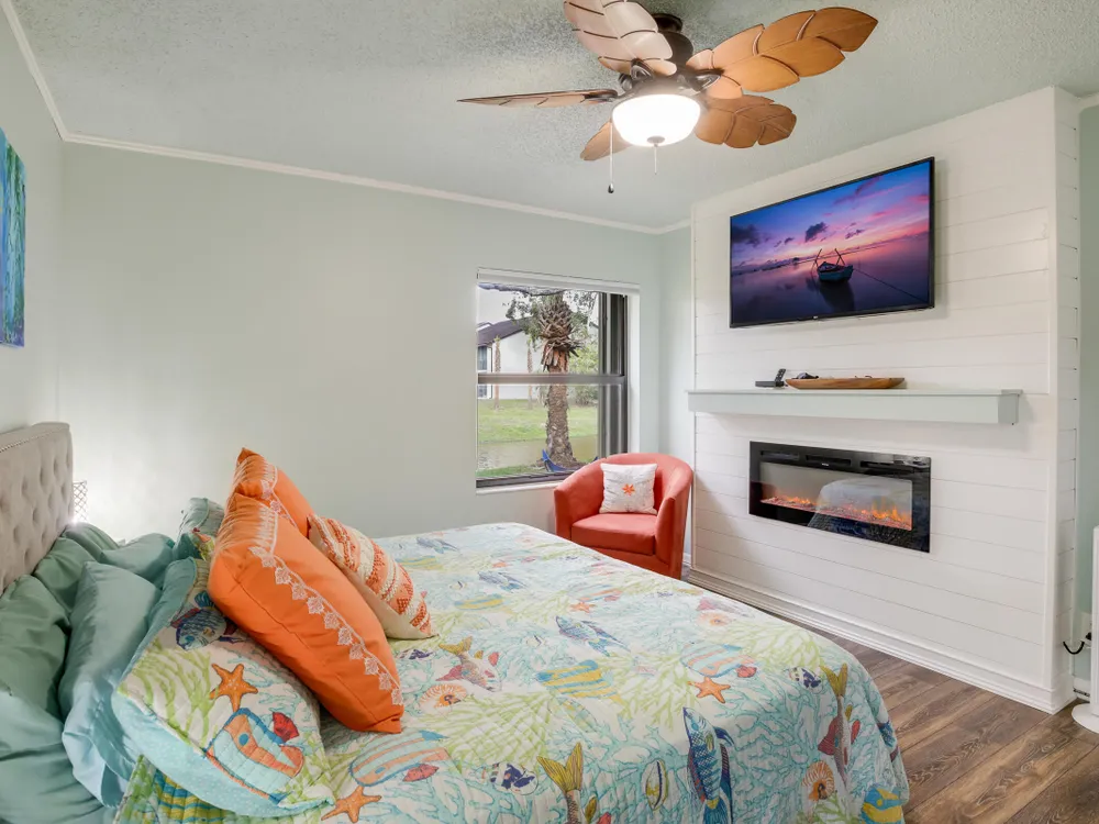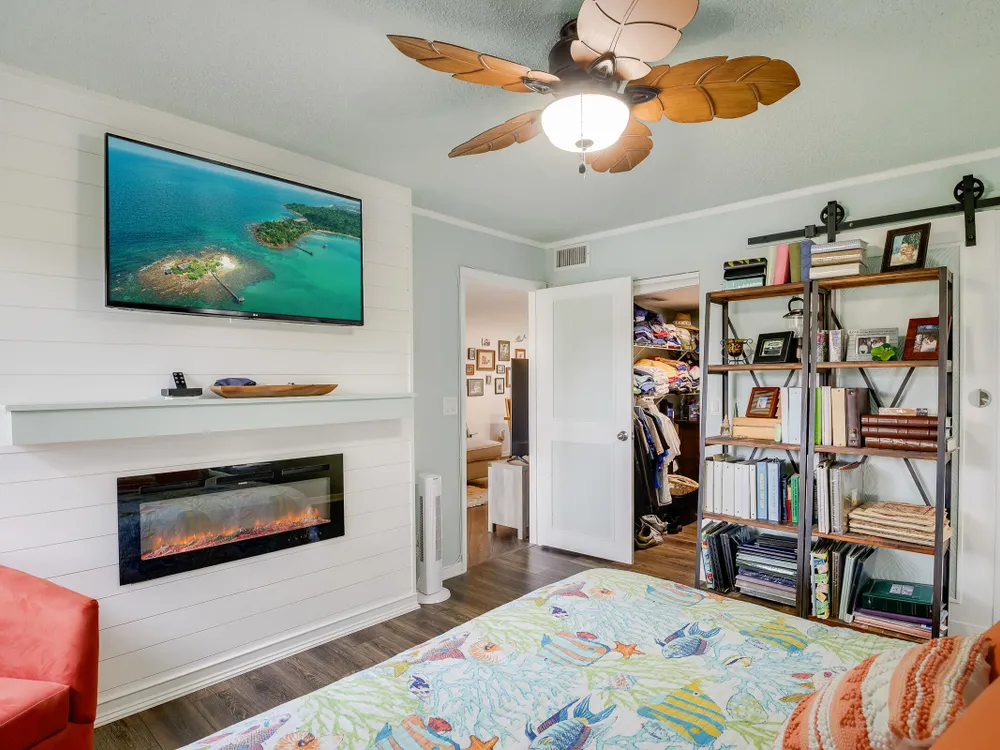 - Decorative Fireplace, Split Bedrooms, Walk-In Closet(s), Living/Dining Room, Blinds, Storm Window(s), Primary Downstairs