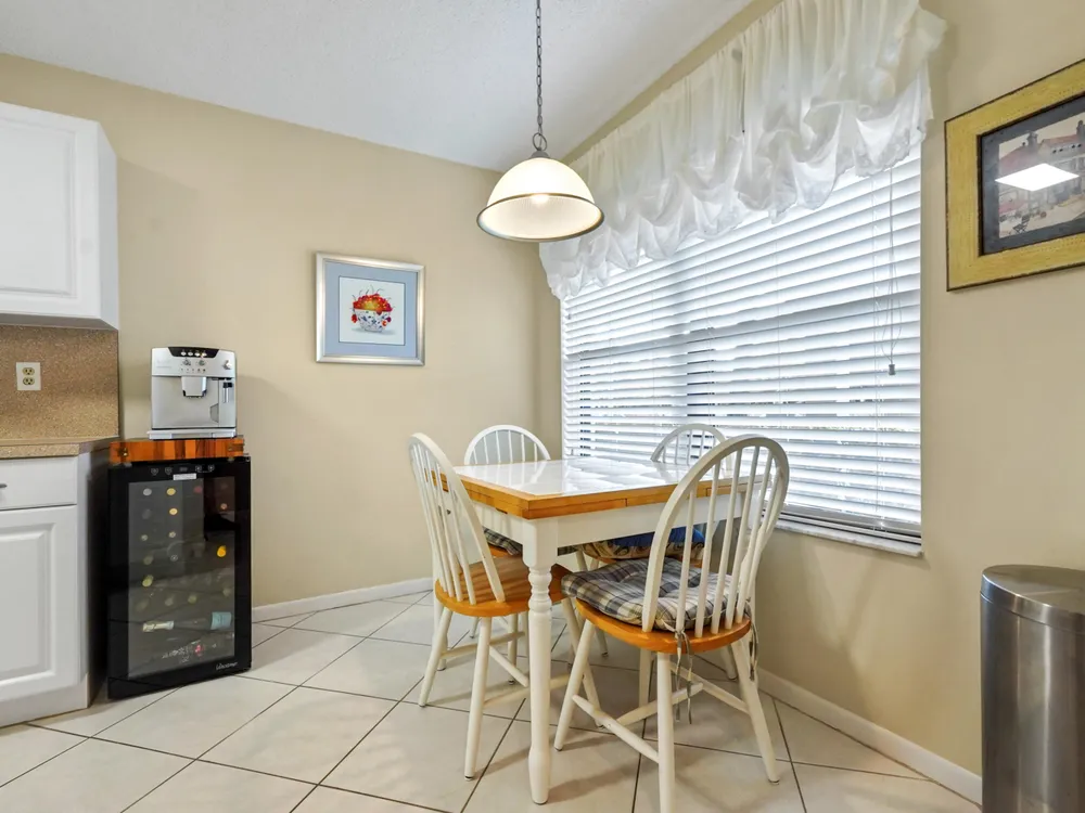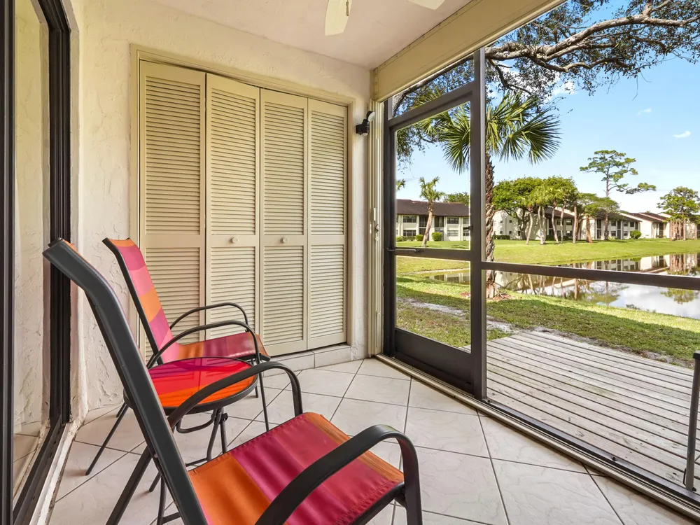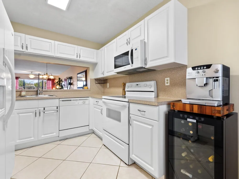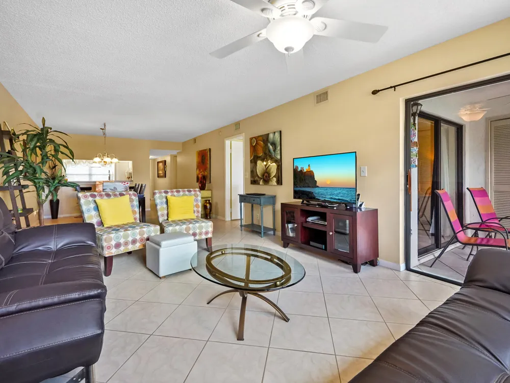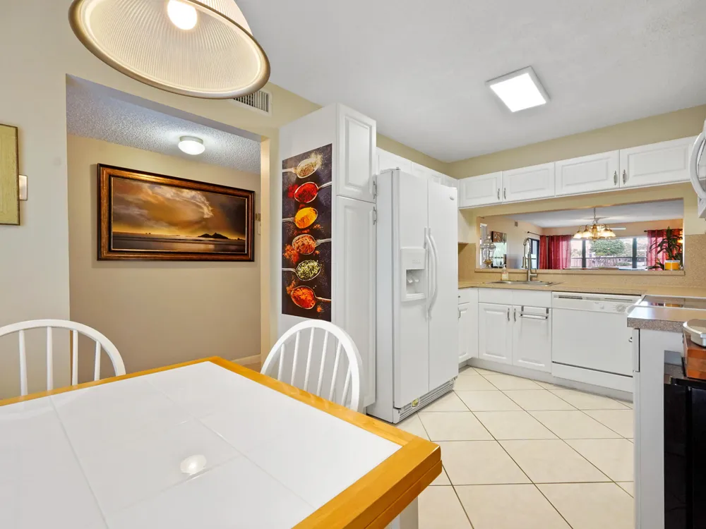 Brand new AC - June 2025. Welcome to this highly desirable first-floor condo, offering 2 bedrooms and 2 bathrooms with breathtaking golf course views. Designed to feel light and bright, this home features neutral diagonally installed tile throughout, creating a timeless and spacious ambiance. The combined living and dining areas flow effortlessly to the screened patio through sliding glass doors, allowing for seamless indoor-outdoor living. The eat-in kitchen provides plenty of space for casual dining, while a full-size washer and dryer add convenience to everyday living.