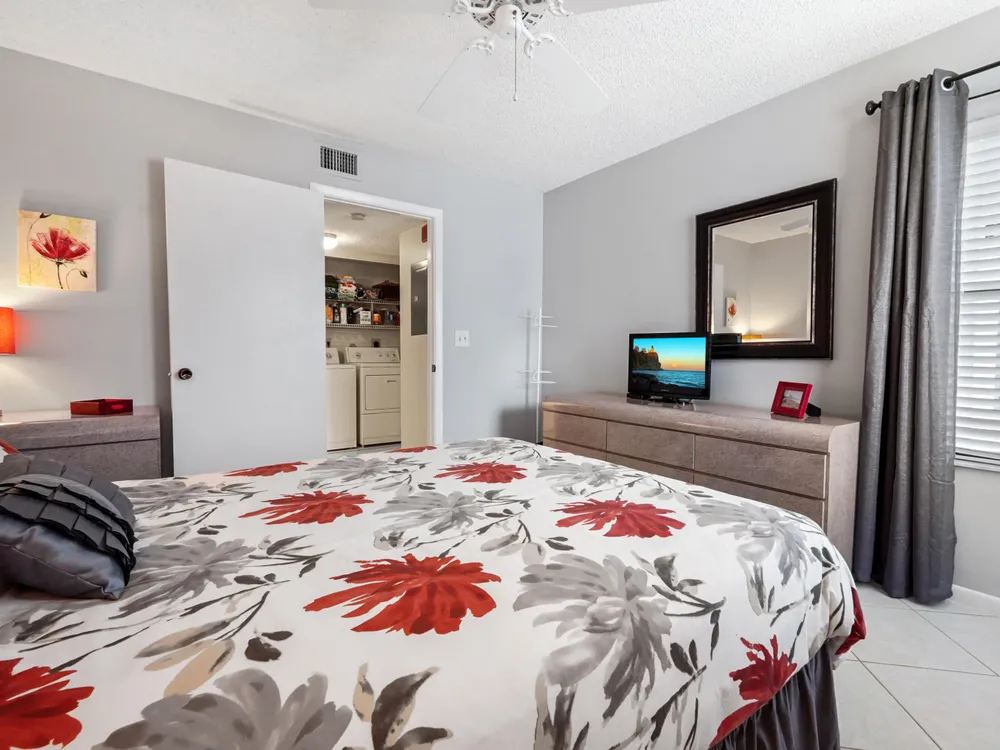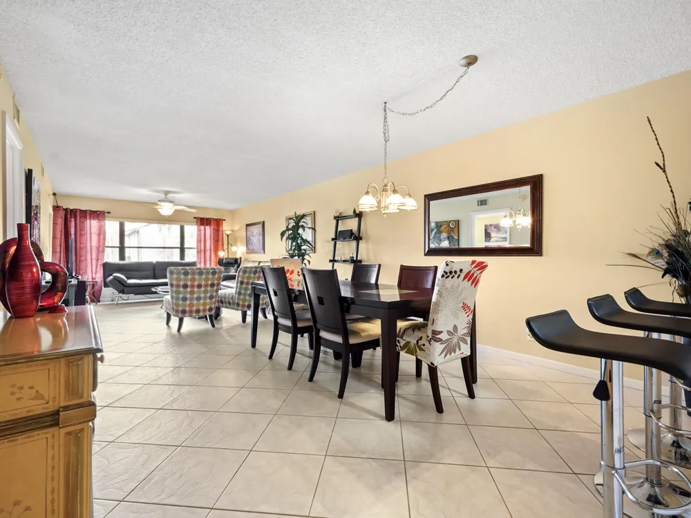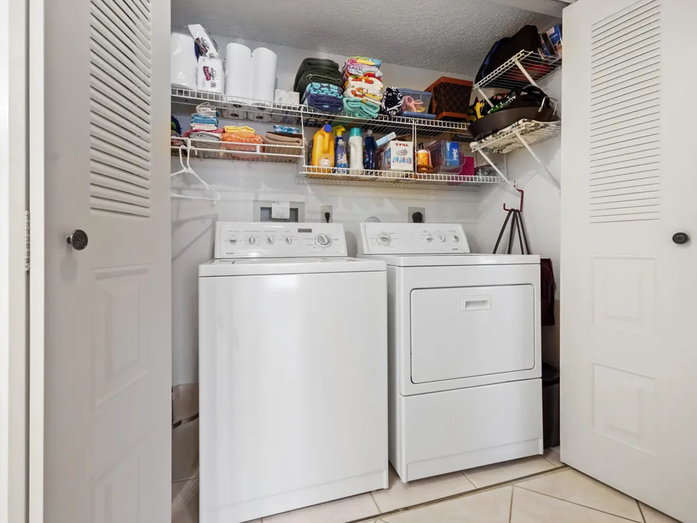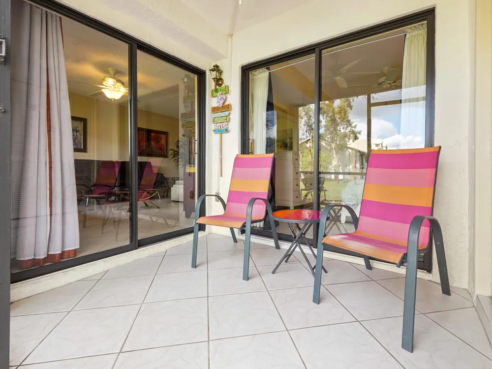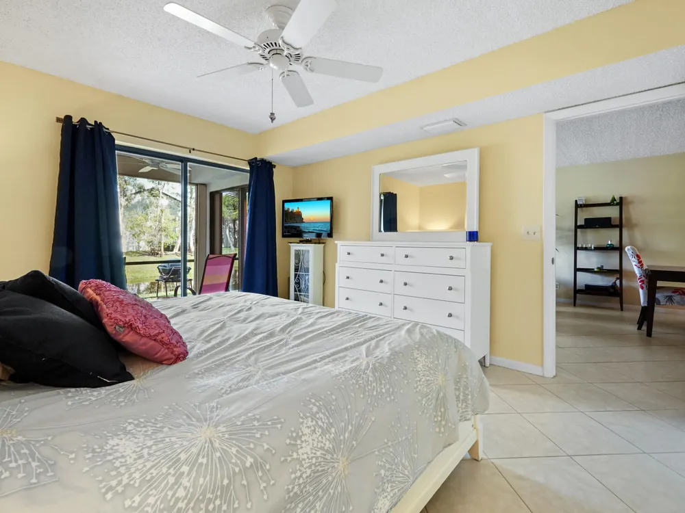 Brand new AC - June 2025. Welcome to this highly desirable first-floor condo, offering 2 bedrooms and 2 bathrooms with breathtaking golf course views. Designed to feel light and bright, this home features neutral diagonally installed tile throughout, creating a timeless and spacious ambiance. The combined living and dining areas flow effortlessly to the screened patio through sliding glass doors, allowing for seamless indoor-outdoor living. The eat-in kitchen provides plenty of space for casual dining, while a full-size washer and dryer add convenience to everyday living.