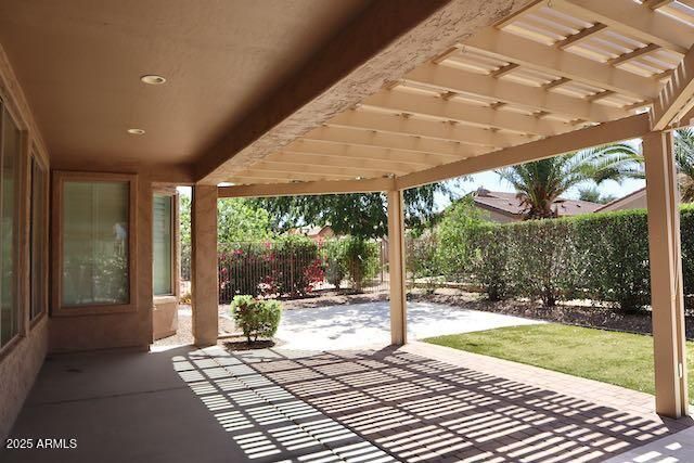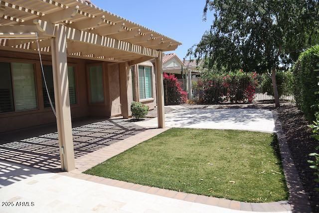 This charming home is located in a vibrant 55+ community that offers everything you need for comfortable living. It features two spacious bedrooms and 1.75 bathrooms, with tile throughout and plantation shutters for added privacy and style. Open kitchen with granite counter tops and pull out shelving in cabinets. New programable Nest thermostat. Beautiful pavers and pergola-covered patio, ideal for relaxation and outdoor living. Front and back security doors for enhanced safety and peace of mind. Beautifully landscaped front and back yards include watering system with timer for easy maintenance. Access to community that includes club house, various classes, tennis, pool, spa, walking areas and golf course.