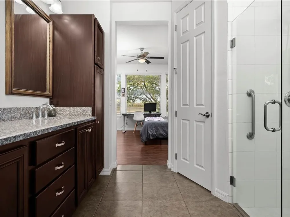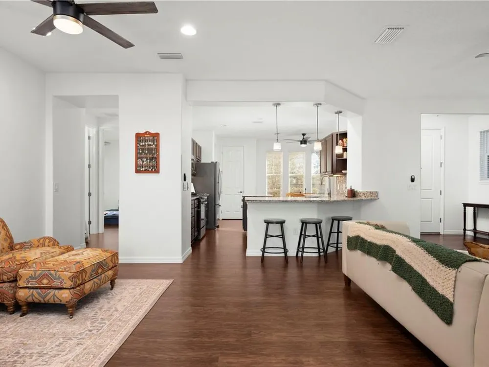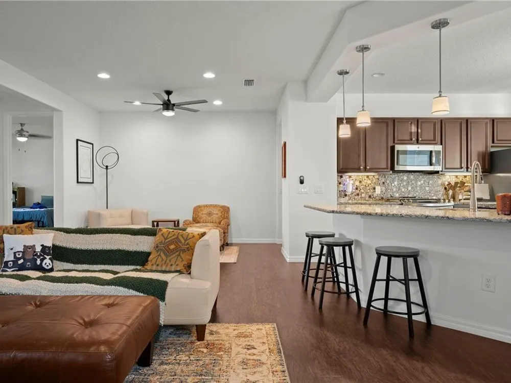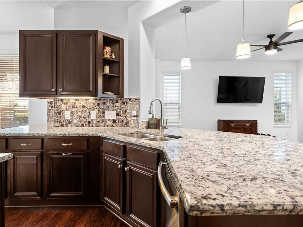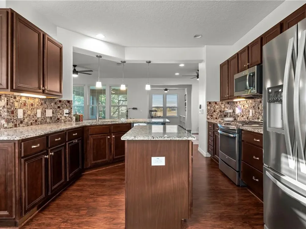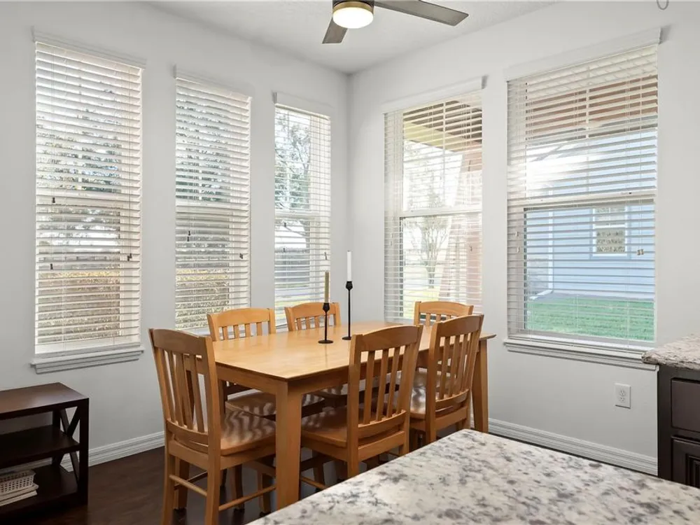 - Ceiling Fan(s), Eat-in Kitchen, High Ceilings, Open Floorplan, Main Level Primary, Split Bedrooms, Stone Counters, Thermostat