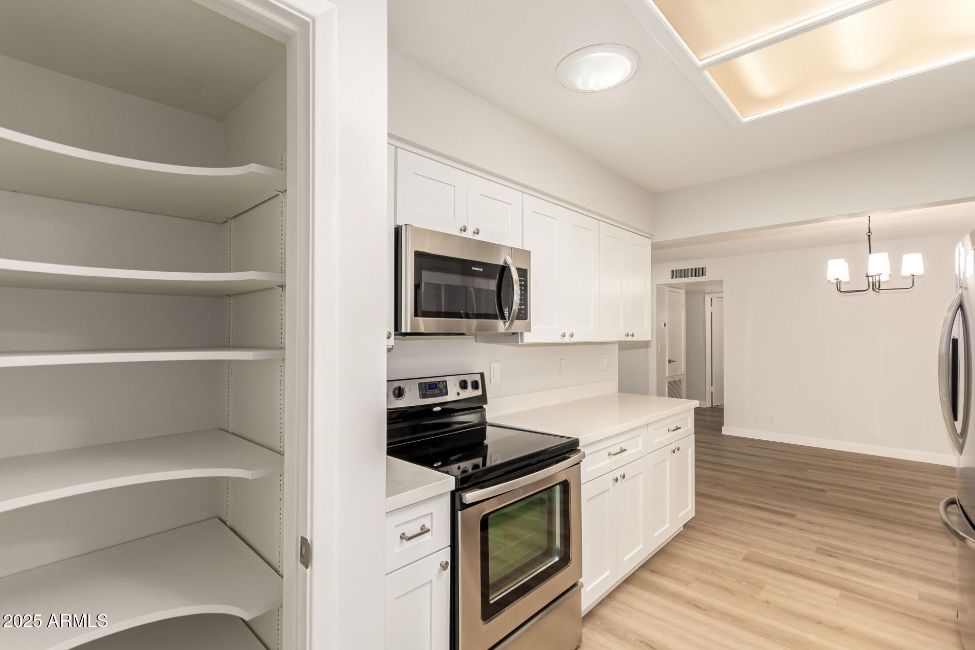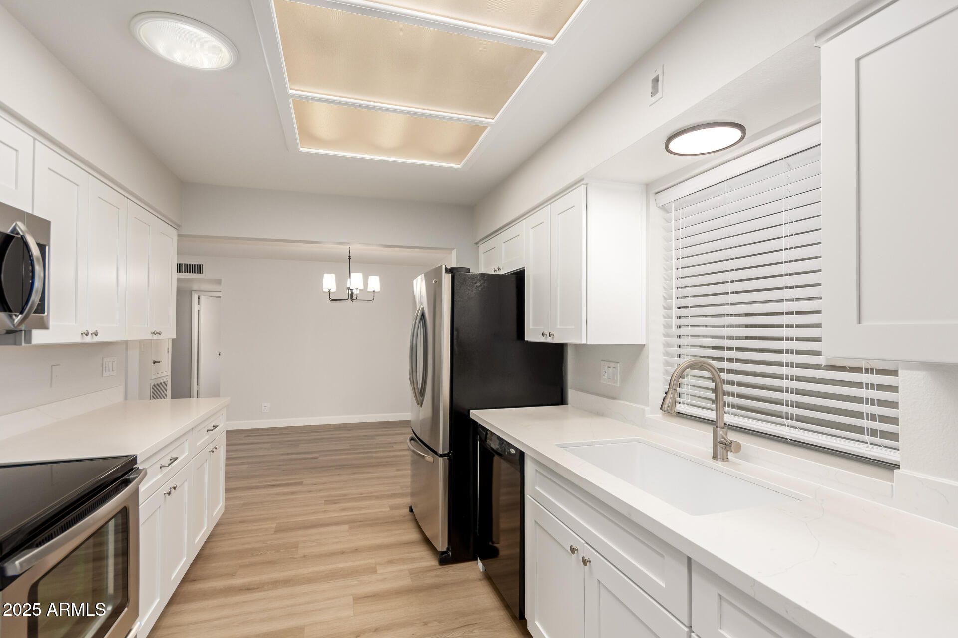 This popular 300 plan with added bonus space is located in the highly desirable 55+ community of Sunland Village. Offering 3 bedrooms, 2 baths, and a versatile flex space, this home has been recently remodeled with luxury vinyl plank flooring, new carpet and baseboards, updated lighting and plumbing fixtures, and fresh interior paint. The beautiful kitchen features quartz countertops, custom white shaker cabinetry, and stainless steel appliances. The light-filled primary suite offers dual sliding-door closets, while both bathrooms showcase new custom cabinetry and quartz countertops. Large, enclosed backyard with pad on side of home! Garage has extra storage room! Situated on a prime corner lot, the home is conveniently close to shopping, dining, golf, parks, and easy freeway access.