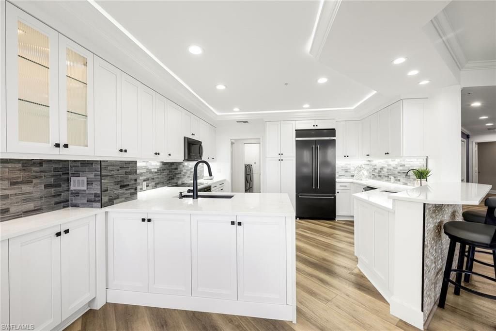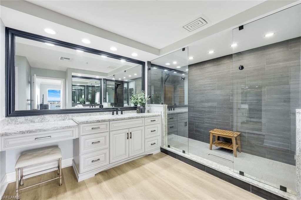 Stunning views and exceptional lifestyle await in Vistas #1103, a beautifully maintained and recently reimagined residence in one of Bonita Bay's signature high rise communities. With over $200,000.00 in upgrades, you will feel like you are living in a resort every day! Upgrades include a newly resigned open-concept kitchen, waterfall quartz countertops, crown molding with accent lighting both on ceiling and undercabinet, reverse osmosis water system, new flooring through entire unit (no carpet), and updated bathrooms. With over 2500 square feet of living space and three bedrooms (one is used as an office), there is plenty of flexible space to make this your own special home. What truly sets this residence apart are the three outdoor lanais (one large screened and two unscreened off the bedrooms) lending themselves to watching beautiful morning sunrises and sunsets.The Vistas offers on-site management, two guest suites, social room, gorgeous pool and spa, fitness center and recently refreshed common areas. Set within the award-winning Bonita Bay, residents enjoy 12+ miles of trails, 3 parks, kayak launch, full-service marina with dry-dock storage and a private two-story Gulf-front beach park with shuttle service.Membership to the award-winning Bonita Bay Club is optional, providing access to five world-class golf courses, tennis, pickleball, croquet, luxury spa and fitness, and multiple dining venues. This is move-in ready luxury with unmatched amenities-this is the Southwest Florida lifestyle at its best.