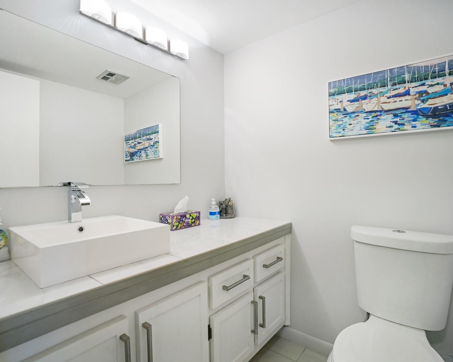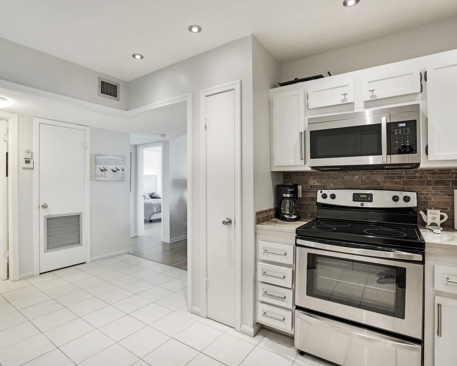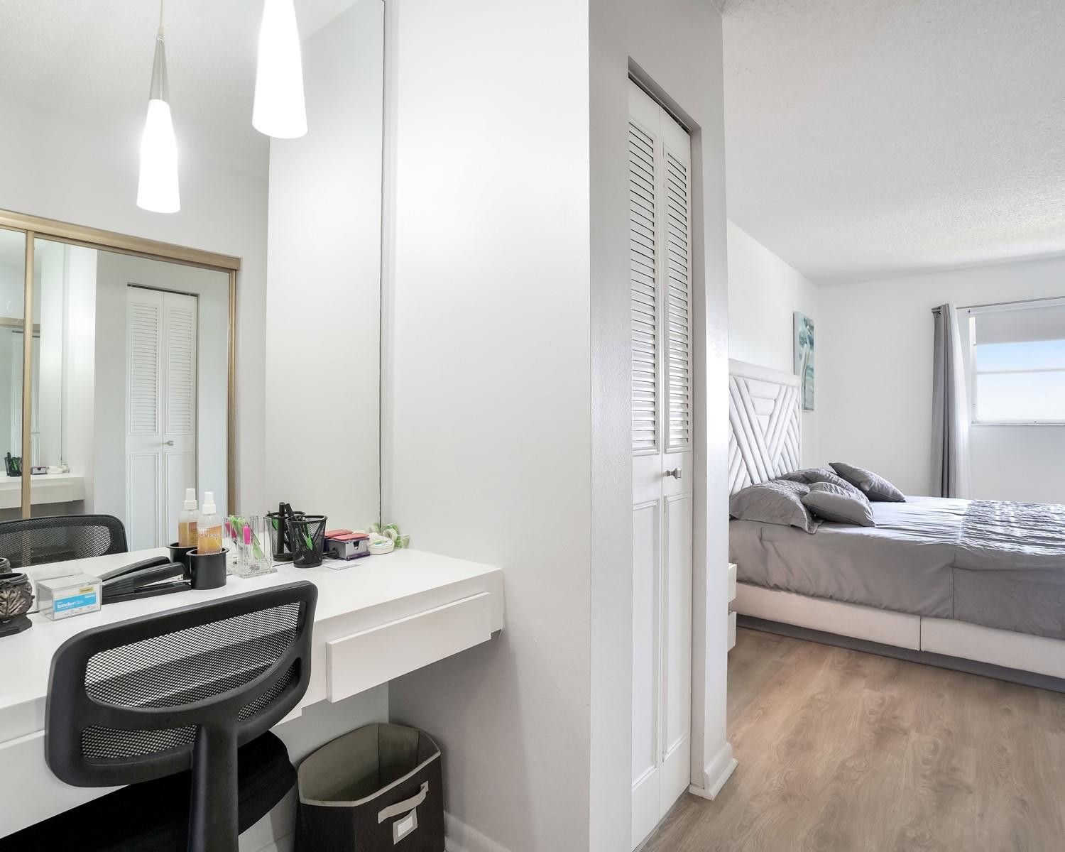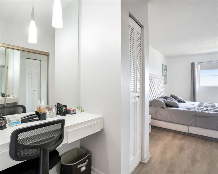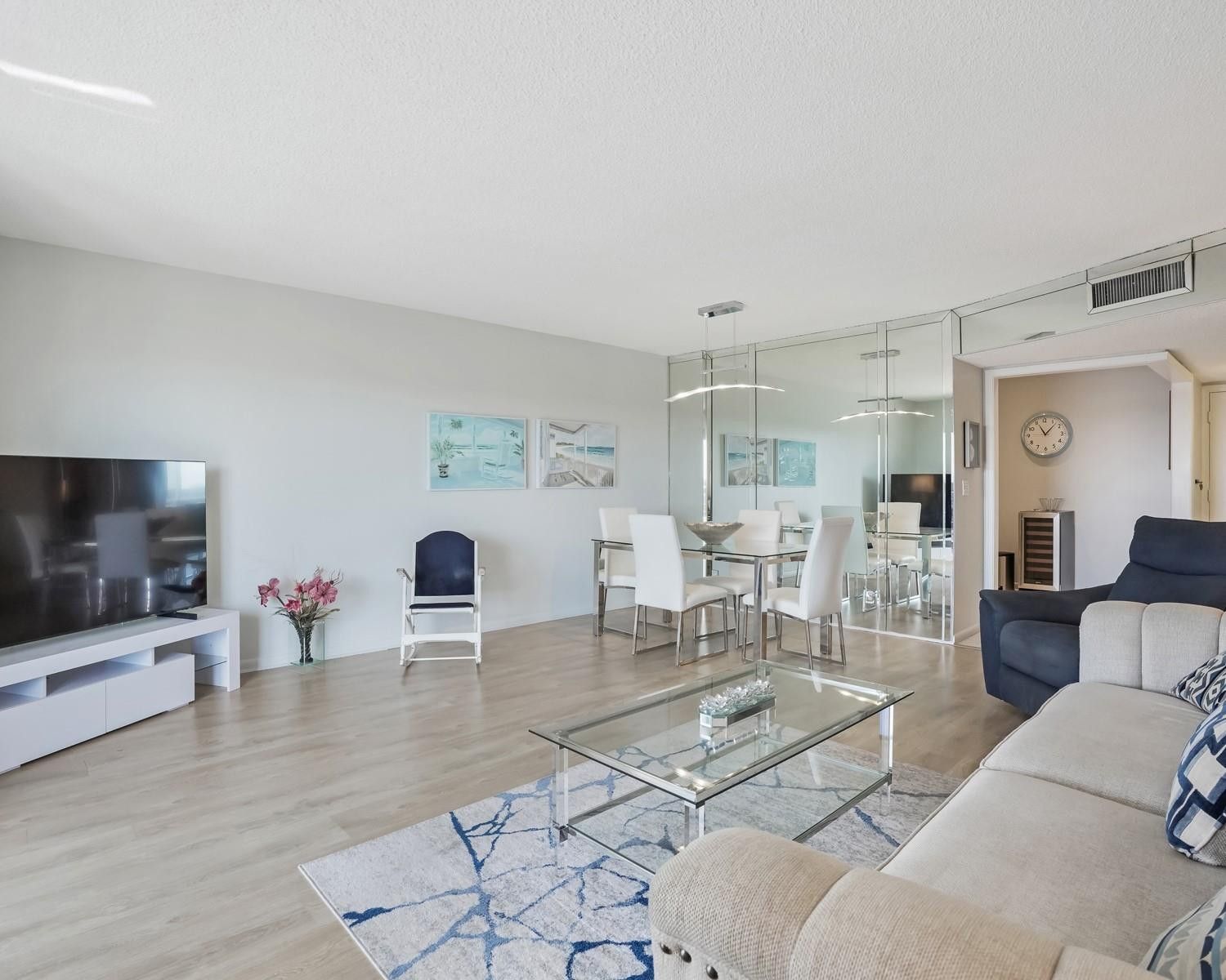 Top-floor 1-bedroom, 1.5-bath unit in the 55+ community of Castle Gardens. Immaculately clean and move-in ready, featuring laminate and ceramic tile flooring, updated bathrooms, and a renovated kitchen with new cabinets and stainless steel appliances. Bright, open-concept layout flows to contemporary furnishings throughout, creating a fresh, inviting feel. Furniture negotiable. Enjoy modern comforts, a carefree lifestyle, and all Castle Gardens has to offer. Schedule a tour today and make this stylish unit your very own.