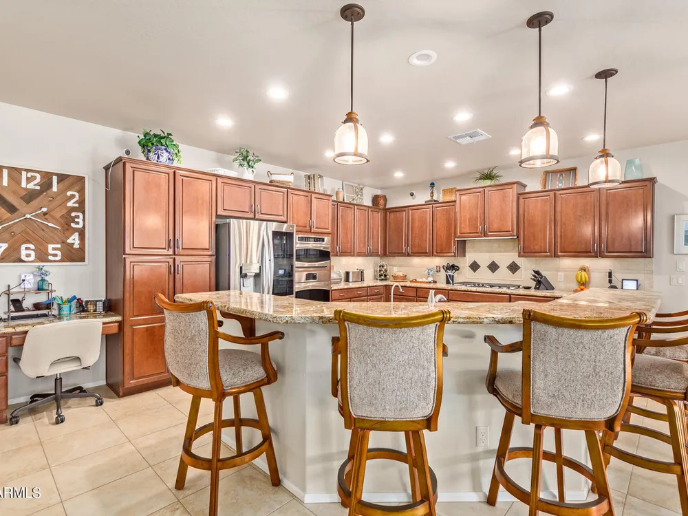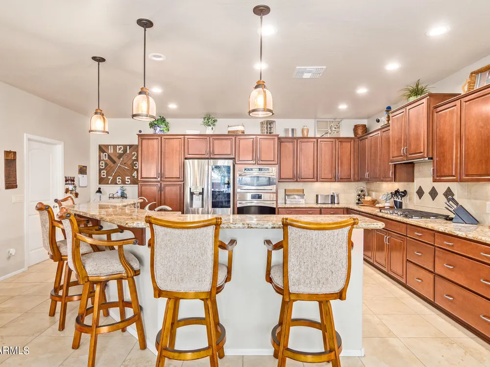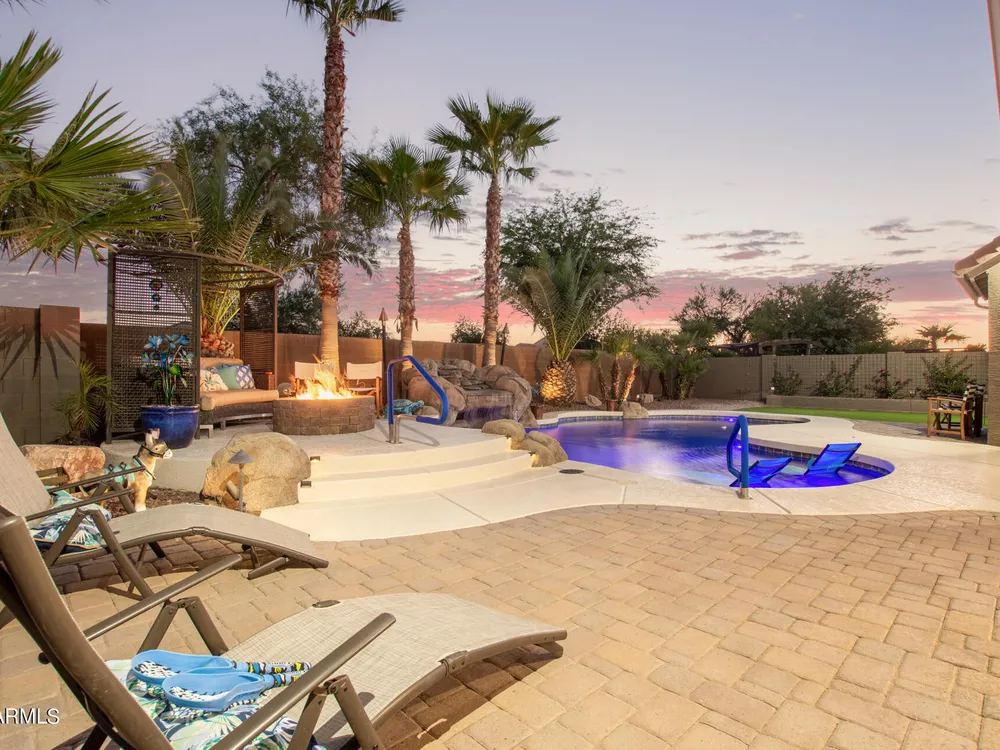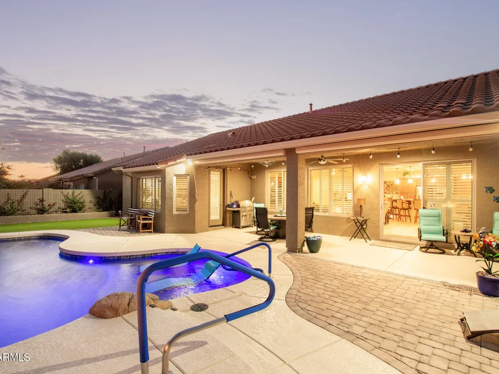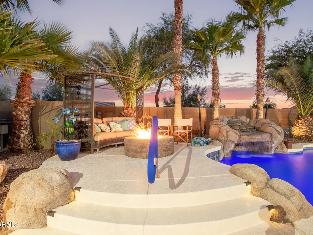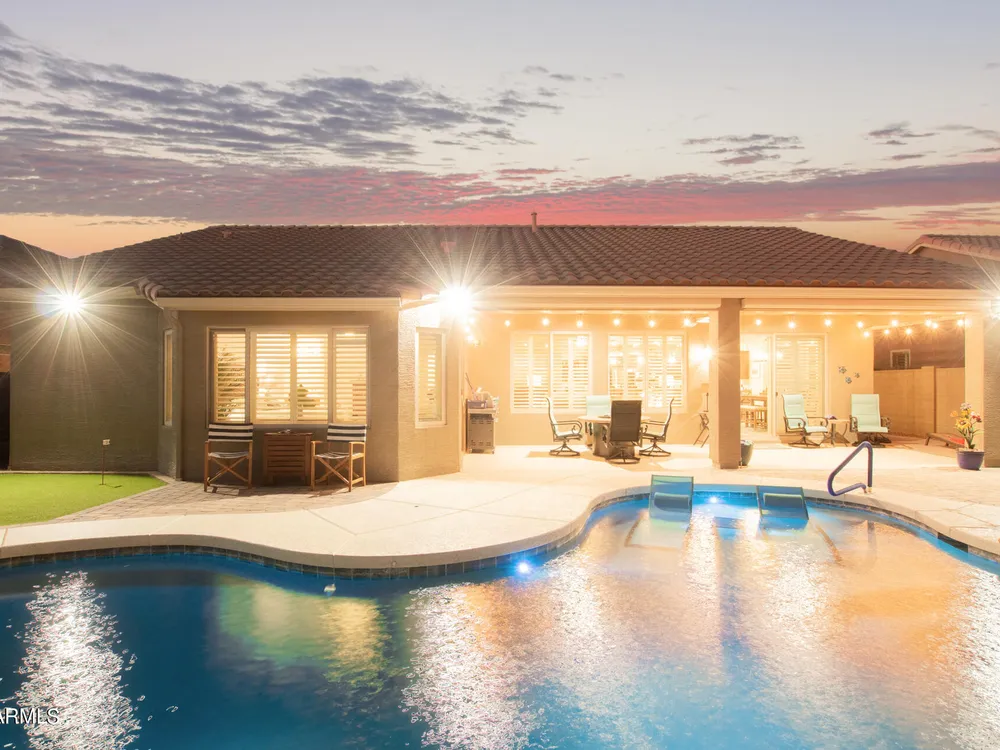 Simply the best! Awesome price in Robson Ranch. From the heated over the top private pool with waterfall, to the Casita for ''mother-in-law'' or private office, THIS IS THE ONE! Quick occupancy possible. Top of the line quality furniture negotiable includes all newer appliances, (except oven, works well)! Garage has updated insulation, MINI SPLIT for year-round enjoyment of the garage, 3++car garage, floor epoxy, mint condition. Talavera model that has all the space you need. Neutral tile floors, primary bedroom with door to patio and pool, all new carpet in bedrooms and casita, most of interior painted 2022-23. Central air compressor just replaced. Pool with gas heater, crystal clear! You deserve it! Integra block construction for energy efficiency