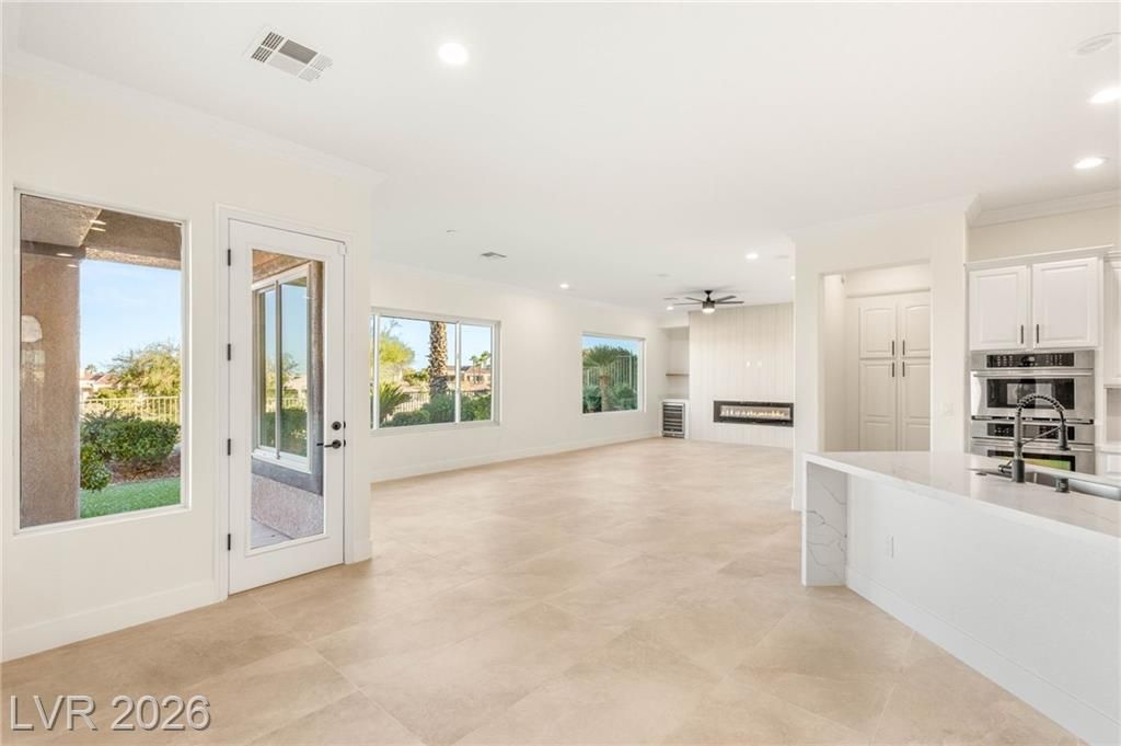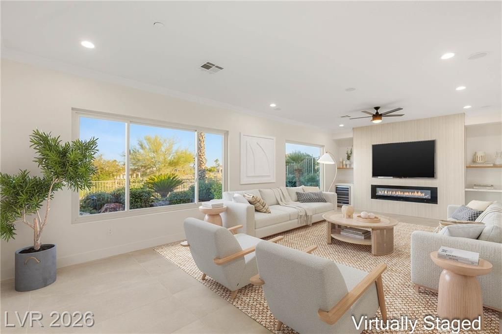 Experience fine living at 4754 Riva De Romanza located in guard gated Siena. Impeccably updated single-story home perfectly positioned on the golf course. 3-bed, 3-bath home offers 2,839 sq ft of open, bright living space and timeless designer finishes throughout.Step inside to high ceilings, expansive windows framing fairway views, PAID OFF SOLAR & a seamless indoor-outdoor living flow. The updated chef’s kitchen features custom white cabinetry, quartz countertops, & spacious island, w/ direct views to the backyard & golf course.The spacious primary suite impresses w/ a spa-inspired bathroom showcasing an oversized walk-in shower w/ bench seating & floor-to-ceiling tile & NEW AC UNITS. Outside, enjoy beautifully manicured desert landscaping, a gated courtyard, & covered patio overlooking the lush greens — perfect for relaxing & entertaining at sunset.Siena offers world-class amenities including a championship golf course, fitness center, pickleball, tennis & more! A Must see!