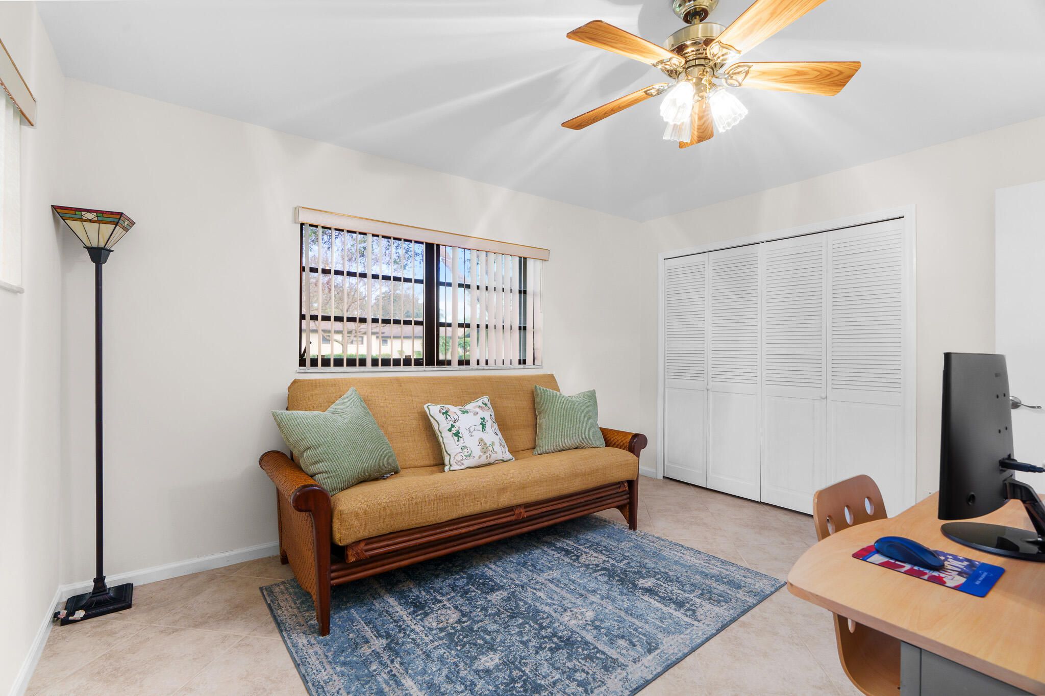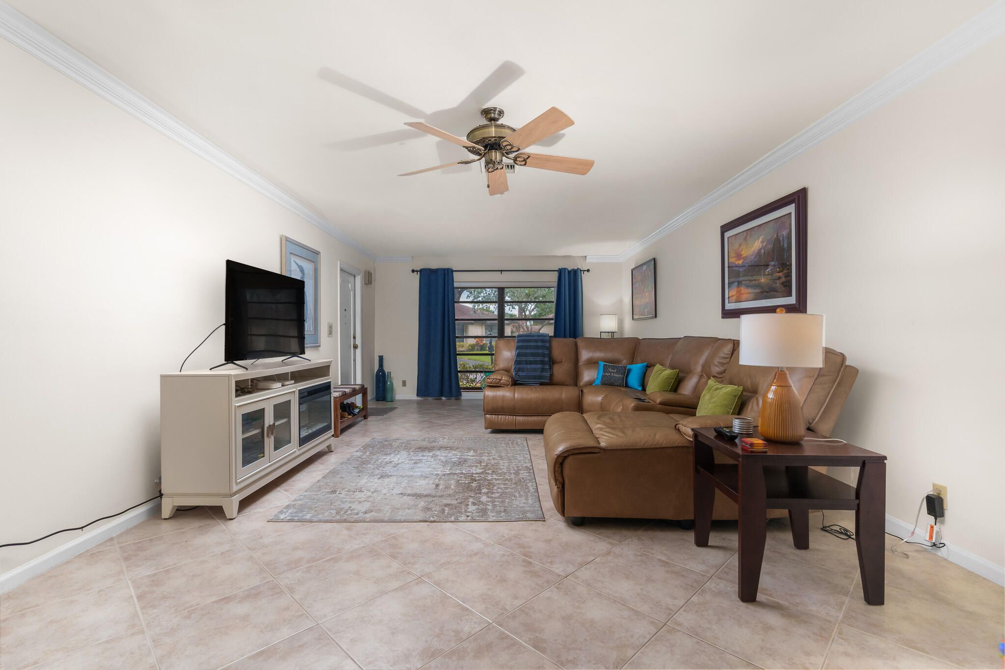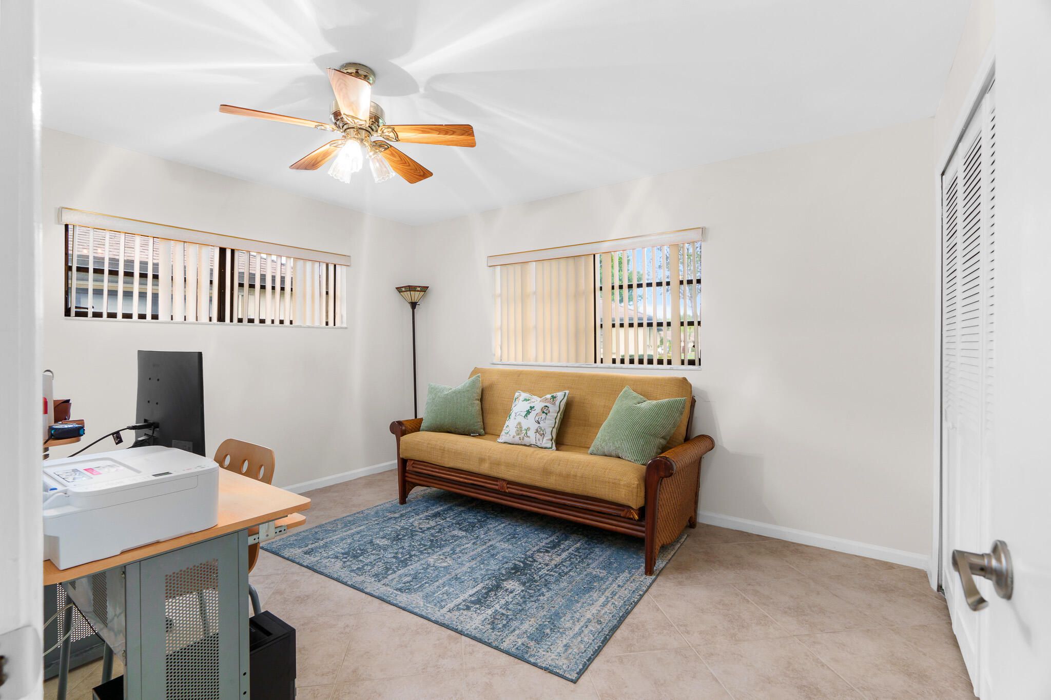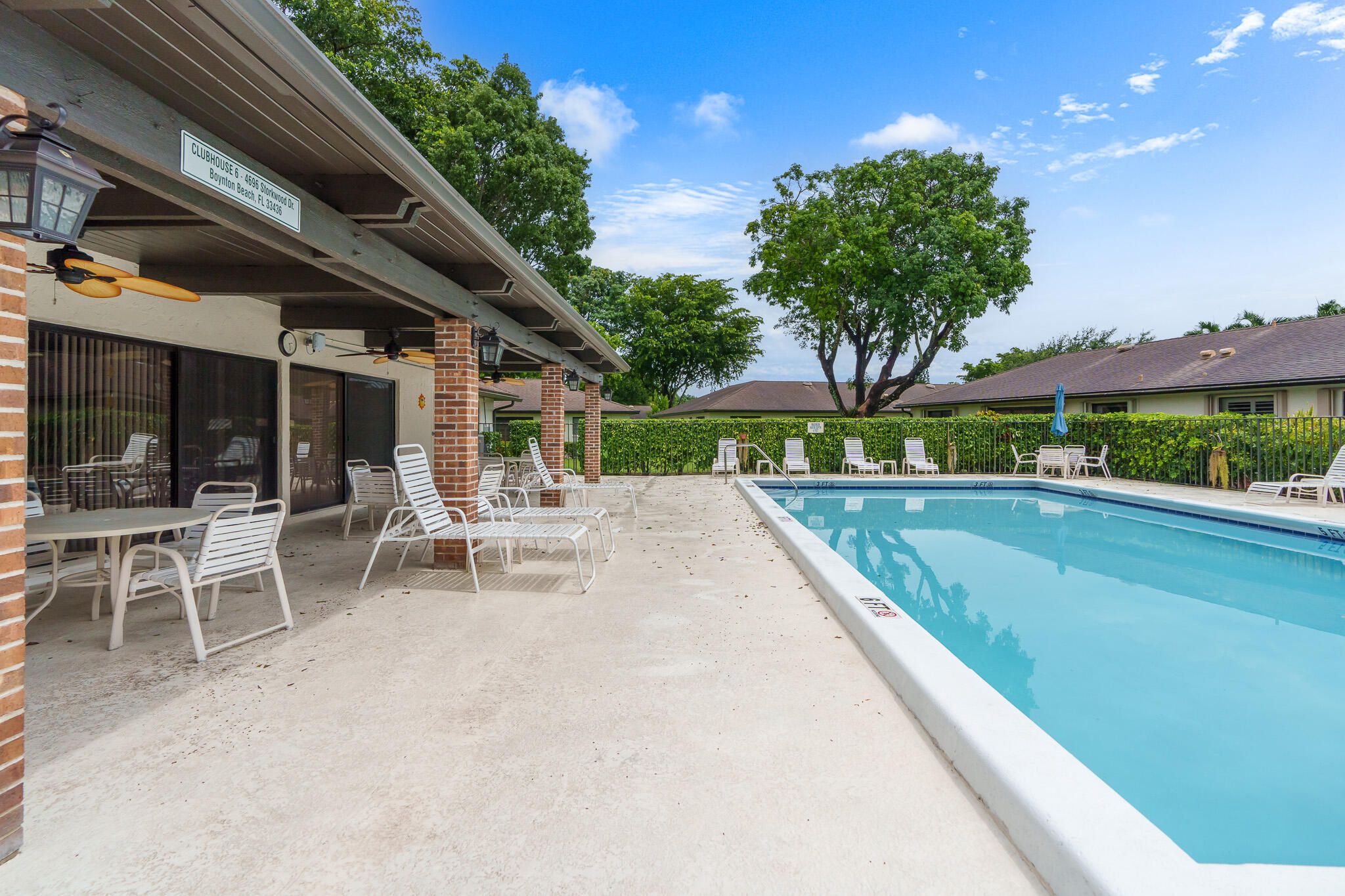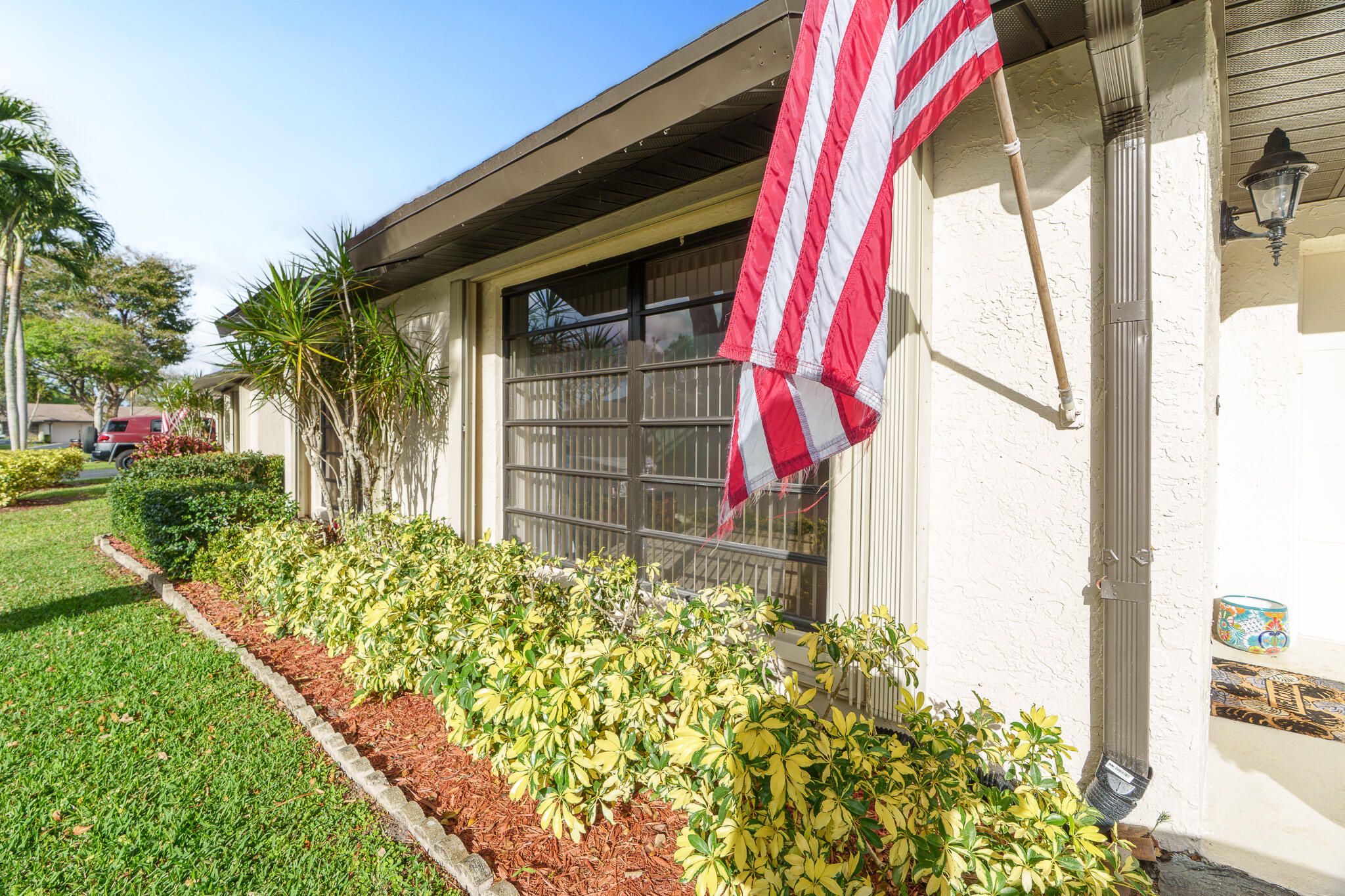 Nicely and tasteful villa to call your new home. Two bedrooms and 2 baths. Large primary bedroom with remodeled en-suite bath. Good sized second bedroom. Living room is also a good size leading to the dining room. Kitchen counters and back splash is a beautiful granite. Stainless appliances. Wood cabinets with selfclosing draws. Two pantries with pull out shelves and lazy susan. There is a den or office as well. The entire villa has matching tile floors.Large green area in rear. End Villa.Club house, several pools.Close to shopping, great restaurants, close to all houses of worship, airports and only a short drive to the beach.