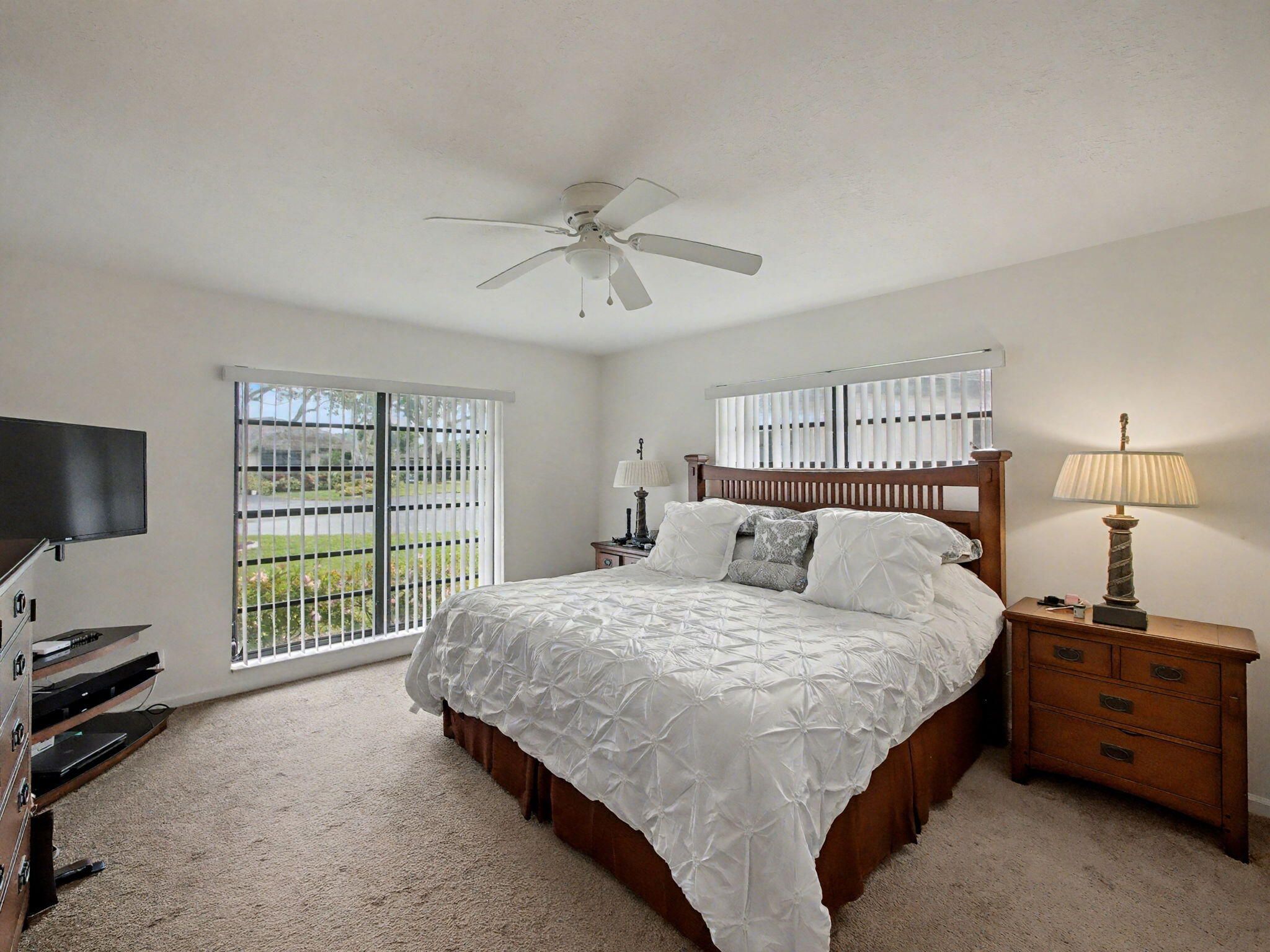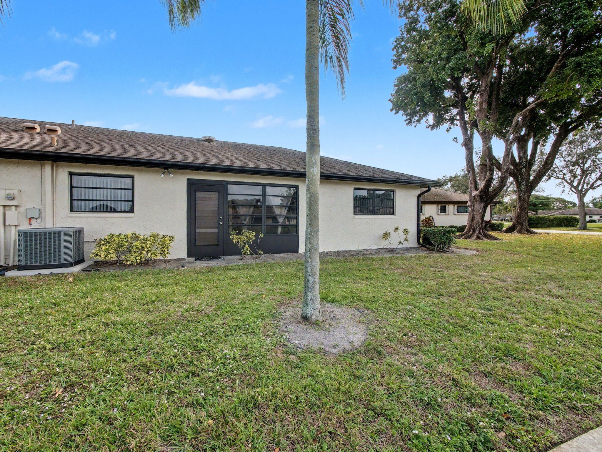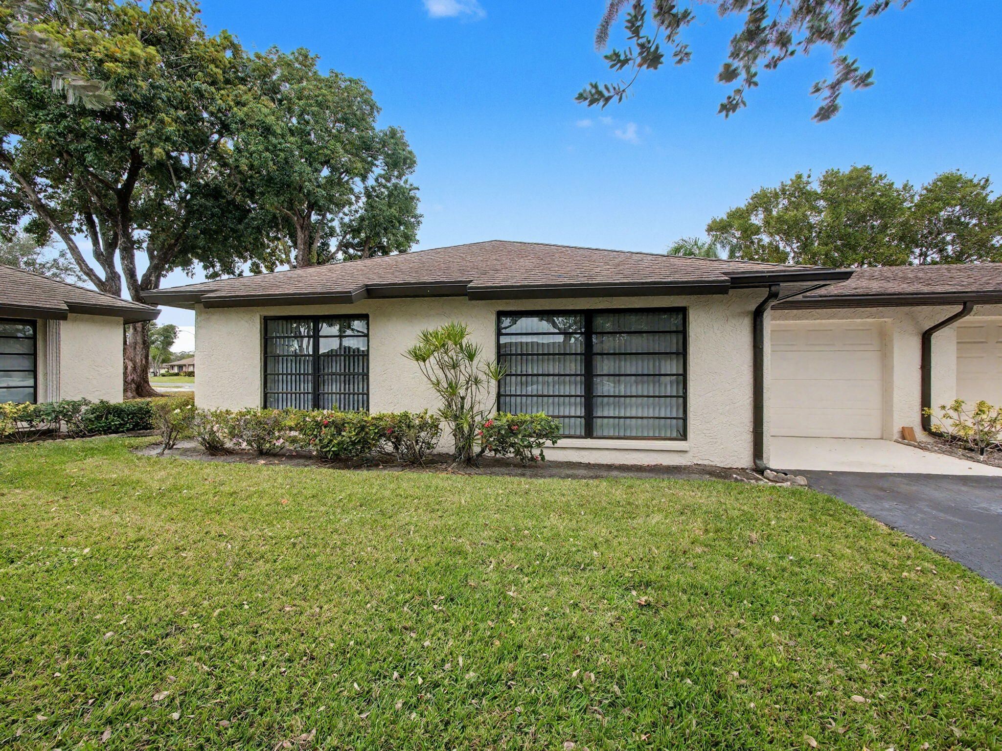 Well-maintained 55+ corner villa with a 1-car garage and tranquil lake views. Tile flooring throughout the living room, dining area, and kitchen. Updated kitchen features granite countertops, ample cabinetry, and a washer and dryer conveniently located in the kitchen. Spacious living room ideal for relaxing or entertaining. Large primary bedroom and second bedroom both offer comfortable carpeting. Updated bathrooms add a modern touch. Enjoy the enclosed patio with storm shutters and serene lake views. Greentree HOA includes roof maintenance, exterior insurance, water, cable, landscaping, common areas, and trash. Community amenities include six pools and six clubhouses. Ideally located near shopping, dining, entertainment, medical facilities, and easy access to I-95. A/C replace 2022,