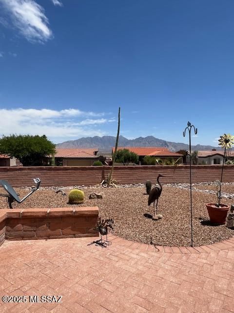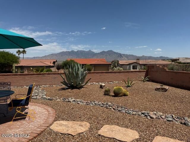 Enter this inviting brick courtyard into a pristine, 2 bedroom + den, open concept floorplan home, featuring vaulted ceilings, ceramic tile, and panoramic mountain views! The cook will love this kitchen w/plenty of counter & cabinet space, breakfast bar, and adjoining bonus room perfect for crafts, storage or walk-in pantry. Spacious living/dining area includes tile floors and views from walls of windows. The primary suite boasts of the lg walk-in closet, step-in shower & dual vanities. Enjoy stunning mountain vistas with your morning coffee or evening cocktails on a tranquil, cov'd patio. Low-care backyard w/flagstone walk, brick seating area, and desert plants. There's even an owned solar system to lower utility bills. 2-car garage: storage cabinets stay, laundry sink & H2O softener!