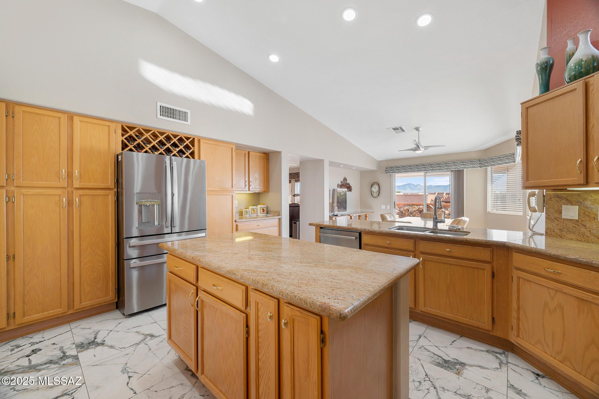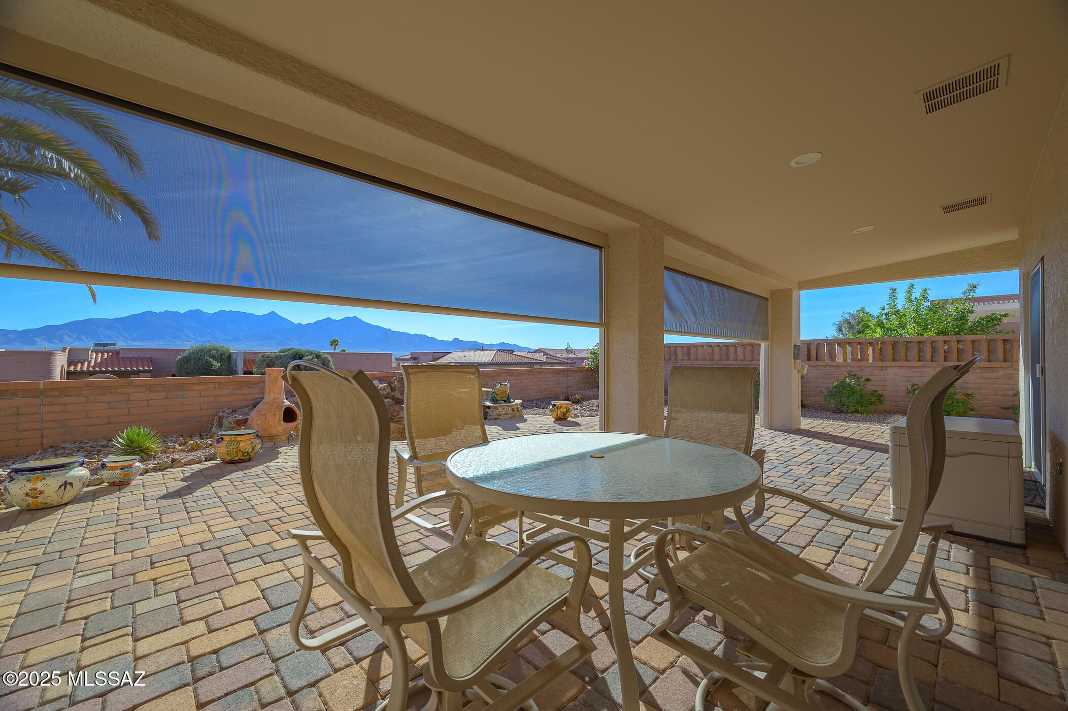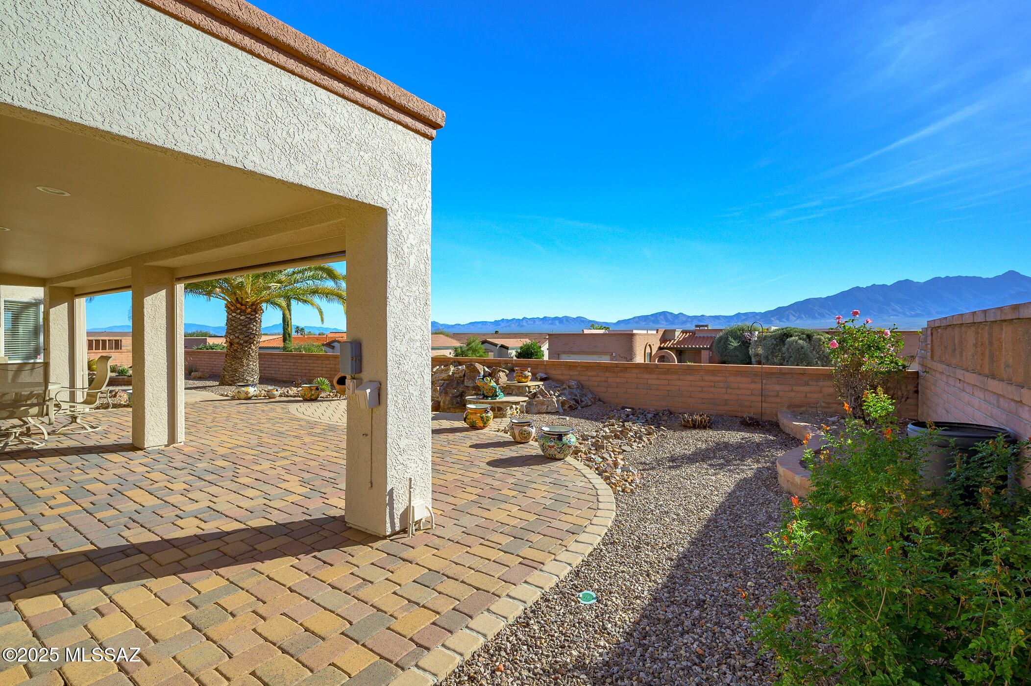 The crisp clean lines of the front entry elevate your first impression, indicating a well-maintained home. The new roof tiles were carefully chosen to complement the freshly painted exterior walls and trim. The gated courtyard of evenly laid pavers leads past the fountain into a 3 bedroom, 2.5 bath home of distinctive detailing. Immediately the concrete fireplace grabs your attention, not typical in this Montana model. But, within a few seconds the exceptional mountain views from floor to ceiling picture windows transcend your expectations. These breathtaking views continue as you glide over ceramic tile floors to the remodeled kitchen and primary suite. The oversized kitchen glistens with newer Stainless Steel appliances and abundant granite counters including the huge island.