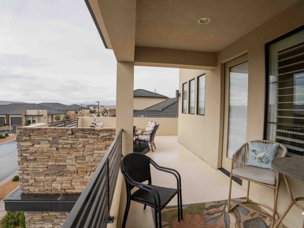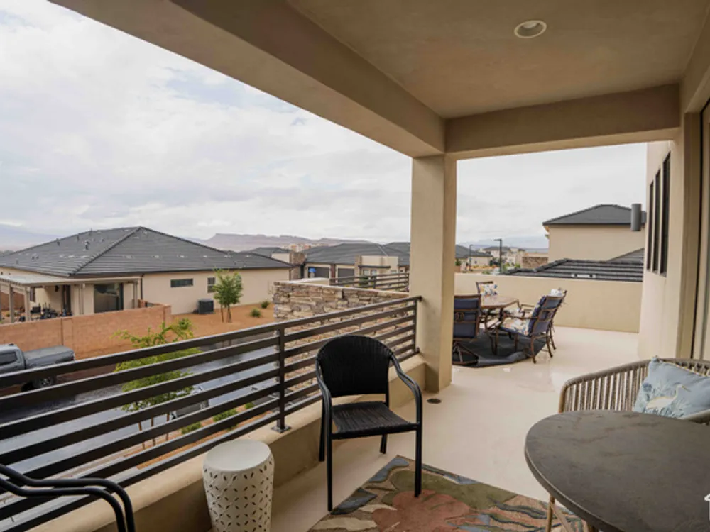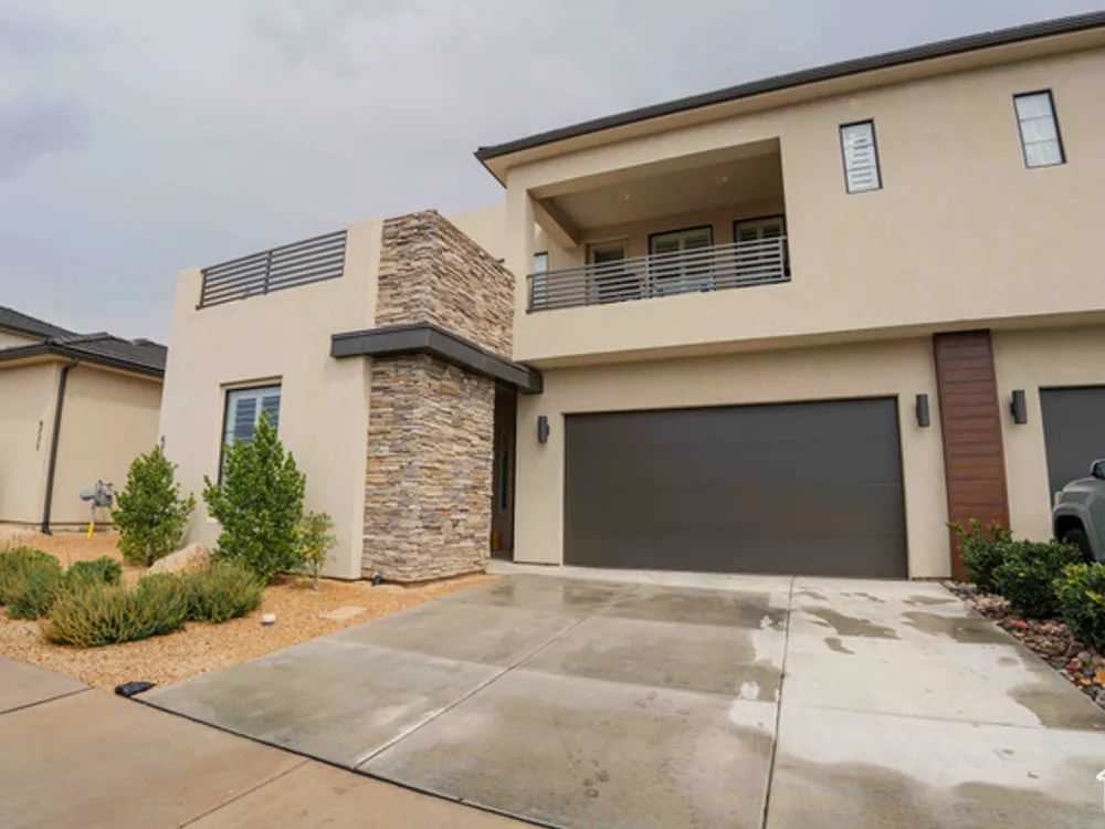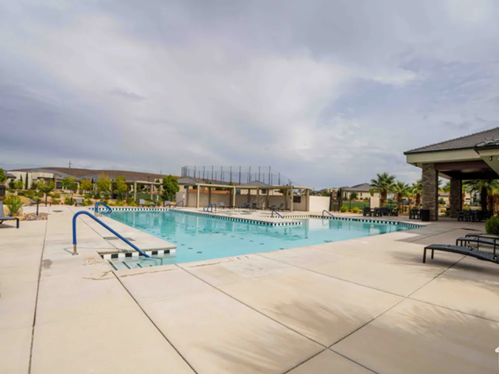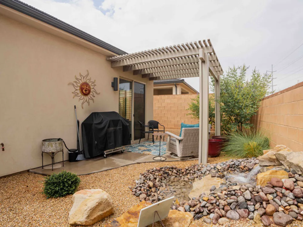 Resort style amenities, mountain views, and a home designed for everyday luxury. Welcome to the Villas at Sun River, where this beautifully upgraded 3 bedroom, 3 bathroom home combines comfort, style, and a true vacation every day lifestyle. Inside, you'll find soaring 9 foot ceilings, a spacious open layout, and a gourmet kitchen featuring a custom 7x4 quartz island with seating. The deluxe master suite offers a spa like retreat with a walk in shower and floor to ceiling Euro glass. Plantation shutters, epoxy sealed garage floors, abundant storage, and thoughtful finishes elevate the everyday experience. Step outside to enjoy your private 10x10 lattice cover, tranquil waterfall fountain, and captivating mountain views. As a resident, you'll have access to the brand new clubhouse with resort style amenities including a pool, spa, pickleball courts, state of the art fitness center, cooking facilities, and private events. Powered by Dixie Power.