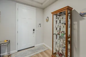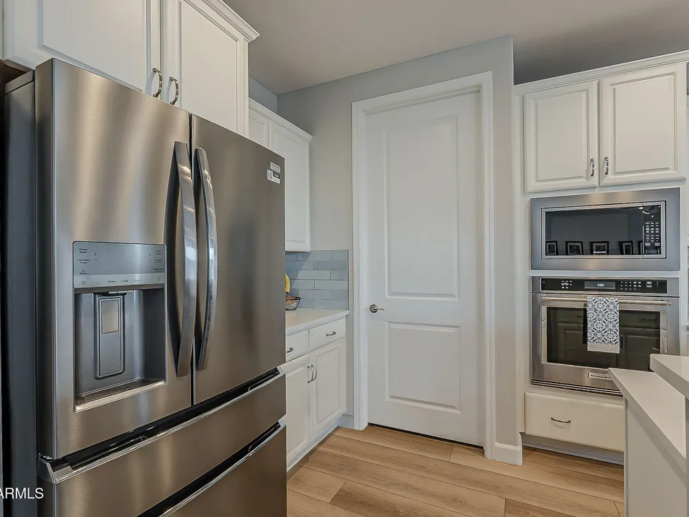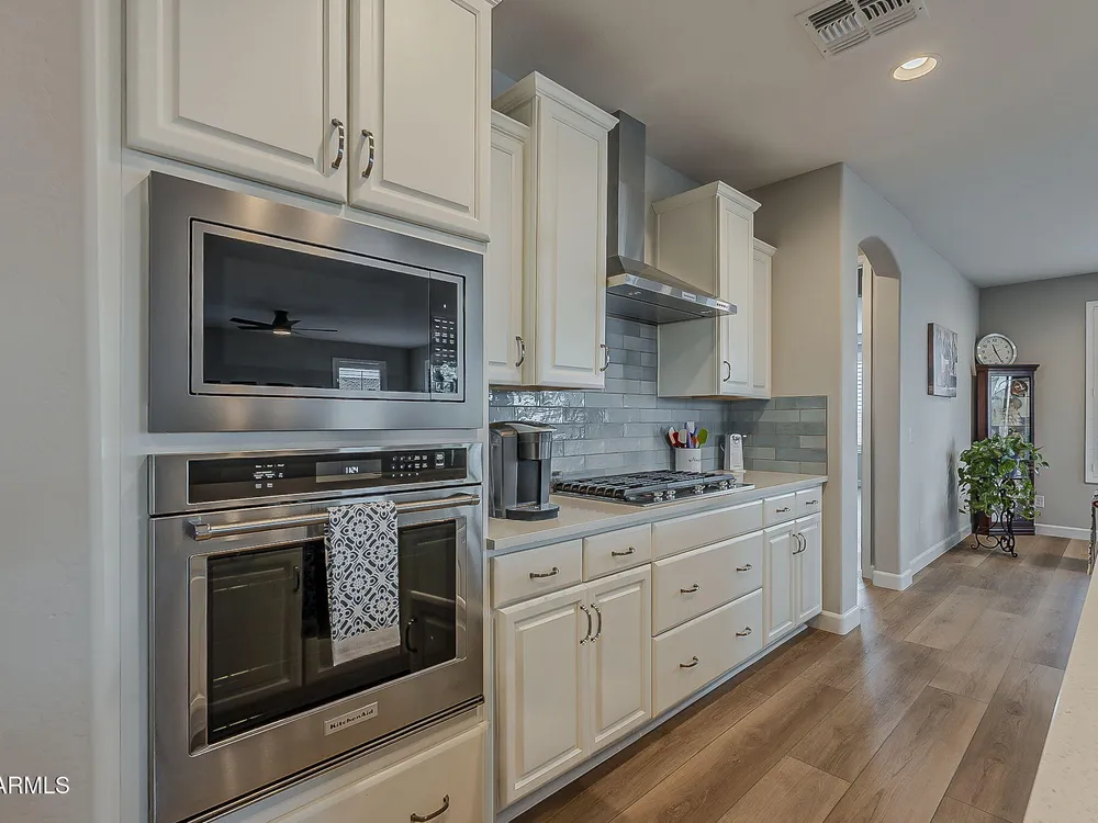 Beautiful 2 bed, 2.5 bath home in a prestigious 55+ community with 2-car garage plus golf cart garage. Features include 9' ceilings, recessed lighting, plantation shutters, water softener, tankless water heater, and added insulation. Chef's kitchen with island, double wall ovens, KitchenAid dishwasher, built-in microwave, soft-close cabinets with pull-outs, and all appliances included. Primary suite offers built-in desk, California closets, walk-in shower, dual vanities, and private toilet room. Office, laundry with washer & dryer, and spacious covered back patio complete this move-in ready home.