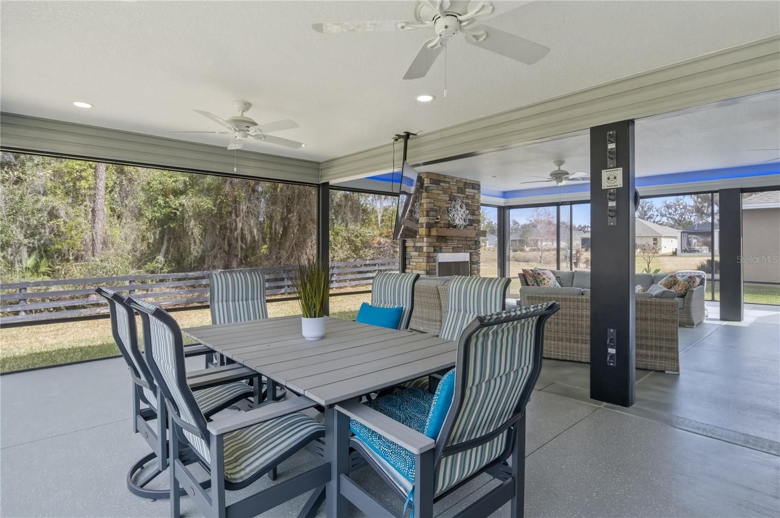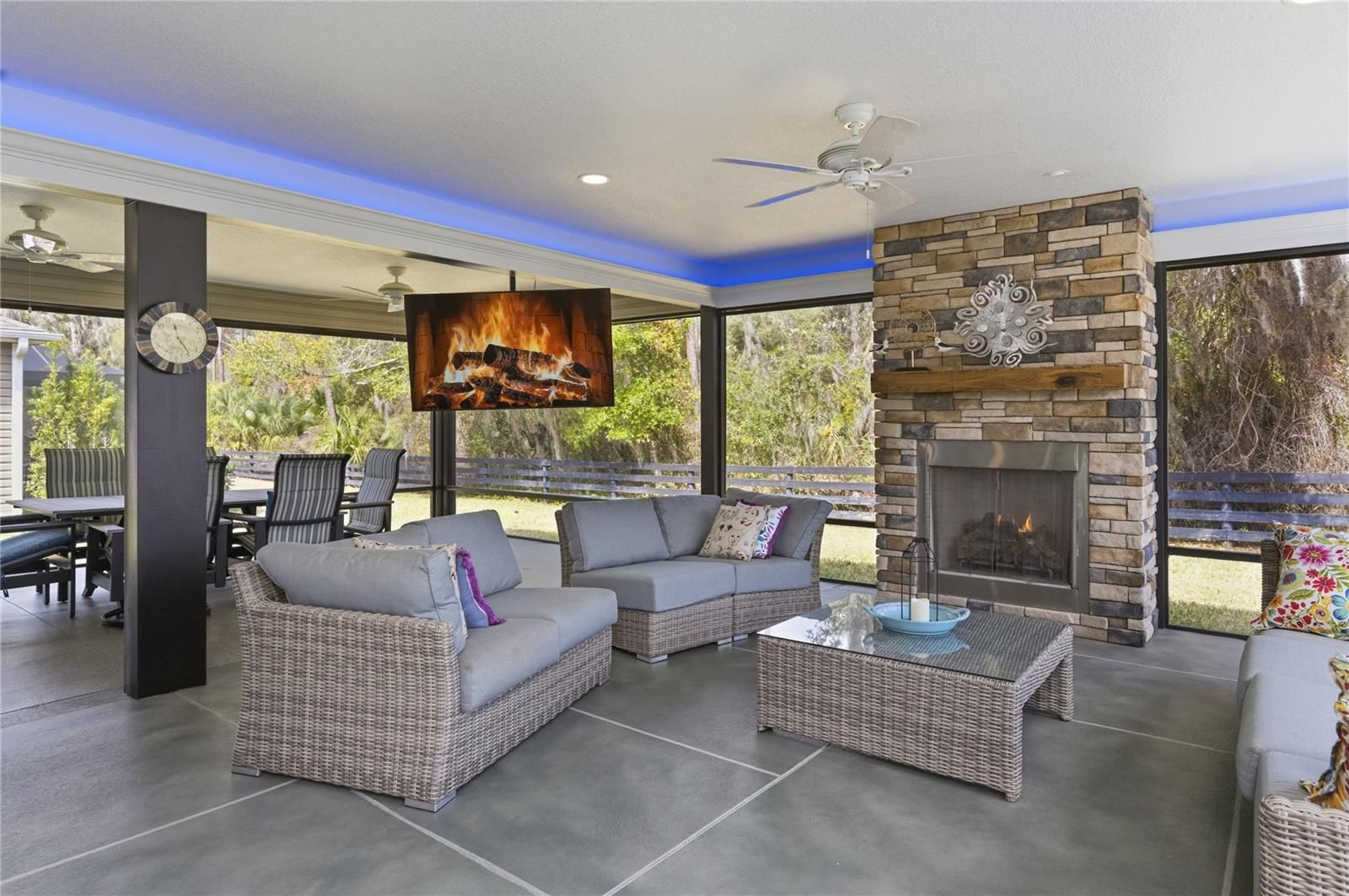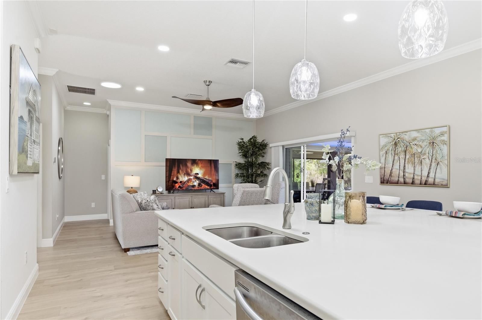 Private Preserve & Water View with Over $50,000 in Recent Upgrades Luxury, privacy, and effortless Florida living come together in this beautifully updated home in this centrally located home in the Villages. Perfectly positioned against a tranquil natural preserve with peaceful water views, this property offers exceptional privacy and a serene, park-like setting rarely found in the area. Step into your own resort-style retreat featuring an expansive 775 sq. ft. lanai with plastered ceiling, recessed LED mood lighting, and a cozy gas fireplace—ideal for morning coffee or evening entertaining. Six remote-controlled motorized sunshades provide comfort and protection year-round, while the adjacent 300 sq. ft. birdcage offers additional space to grill, relax, and enjoy the scenic preserve and water views. Inside, the home showcases a warm, sophisticated design with brand-new luxury vinyl tile flooring throughout (2024)—no carpet. Elegant 5" crown molding and 5" baseboards enhance every room, complemented by a custom-designed living room accent wall. Natural light pours in through three SolarTubes (2025), creating a bright and inviting atmosphere. The open-concept kitchen is both stunning and functional, anchored by a massive quartz island perfect for dining and entertaining. Upgrades include quartz countertops, eight custom slide-out drawers in the island cabinetry, under-cabinet lighting, a premium garbage disposer (2024), and a Delta “Ophelia” brushed-nickel faucet with lifetime warranty. The fully reimagined laundry room (2024) features high-end custom cabinetry, quartz countertops, new electrical outlets, abundant storage. Brand new Gas Tankless Hot Water Heater (2026).. Both bathrooms were remodeled in 2025 with quartz countertops, Kohler undermount sinks, and Delta single-throw faucets (lifetime warranties), offering spa-like comfort and timeless style. This smart home delivers modern convenience and peace of mind with Ring doorbell, four exterior security cameras, MyQ Wi-Fi garage door control, smartphone-controlled irrigation, touch-dimmable Lutron lighting, and whole-house surge protection. A Nova whole-house water softener and three-stage filtration system (2025) provide pristine water throughout. Additional enhancements include a professionally epoxied garage floor (2024), resealed slate-pattern driveway (2025), and a new solar attic fan (2025). Each bedroom features its own walk-in closet—an uncommon and valuable feature. Prime Location – Ideally situated: 1 minute to Water Lily Pool & Recreation Center 7 minutes to Everglades Regional Recreation Center & shopping 9 minutes to Brownwood 10 minutes to Sawgrass 12 minutes to Eastport Beautifully maintained and truly move-in ready, this private preserve-view retreat offers the perfect balance of refined design, modern technology, and peaceful Florida living—ideal for entertaining or simply enjoying every day in comfort and style.