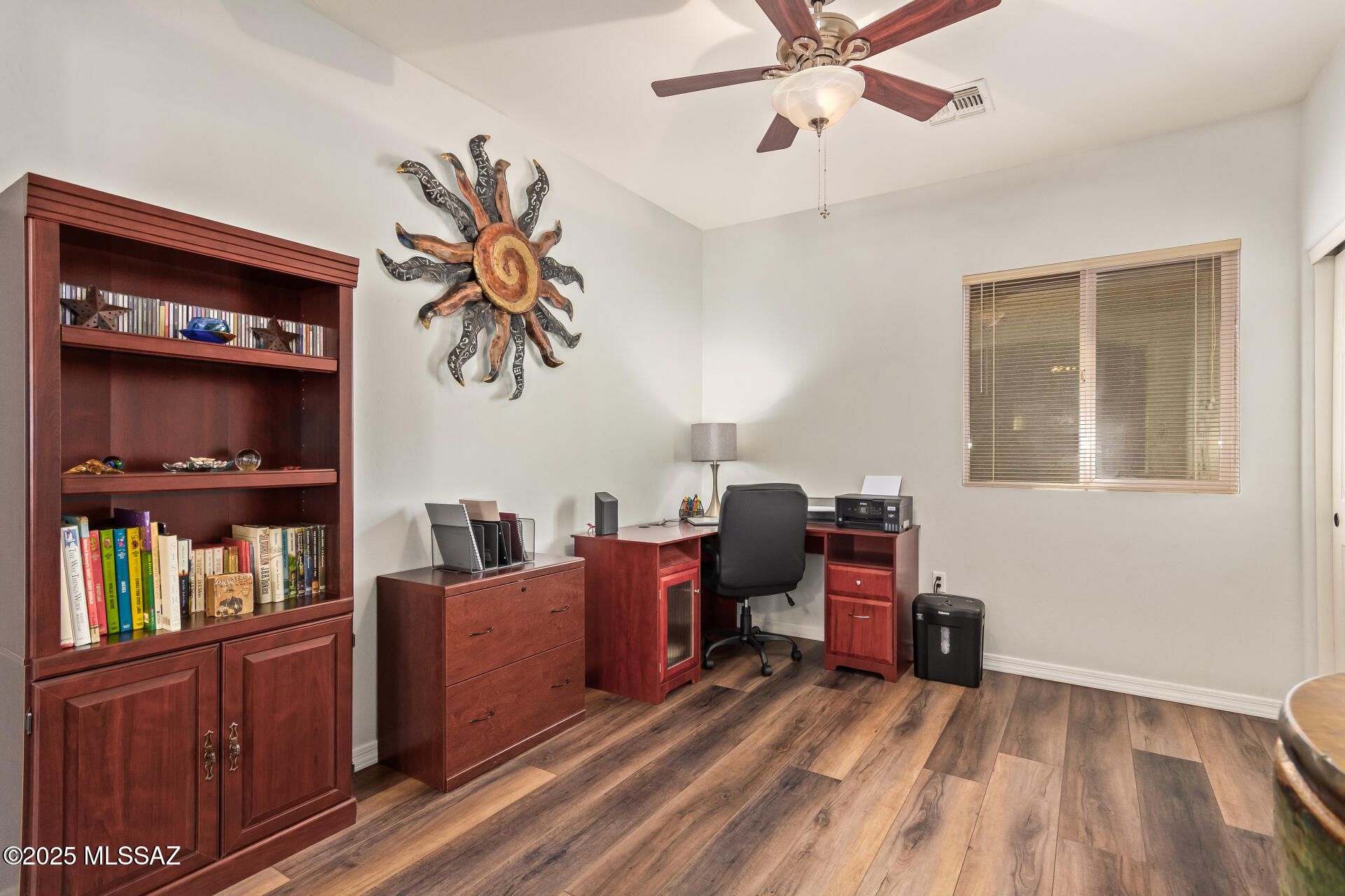 Check out this charming immaculately maintained home. Inside, the inviting living room sets the stage for a cozy living experience. Newer Wood-look flooring, custom palette, ceiling fans, and abundant natural light enhances the overall appeal. The kitchen comes with recessed lighting, plenty of honey oak cabinets topped with crown molding, built-in appliances, solid surface counters, and a convenient breakfast bar. Impeccable primary bedroom offers a lovely bay window, ensuite bathroom with dual sinks, a walk-in closet. Second bedroom includes six-panel door closets. Additional Den/Office offers many options. A screened-in AZ room, with ceiling fan, where you can enjoy the best of the outdoors without annoying bugs. Larger backyard a plus.Seize the opportunity while it's still available