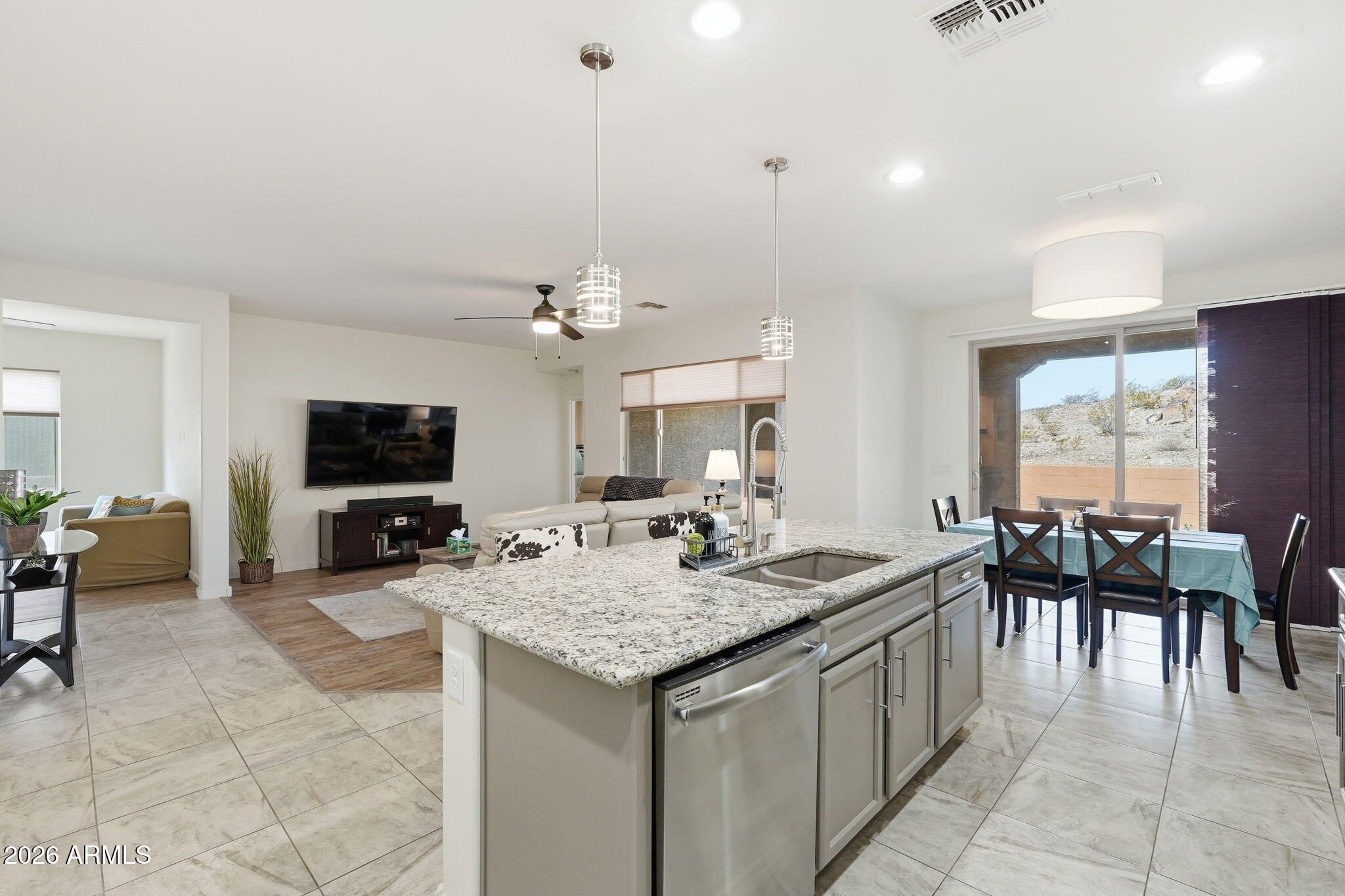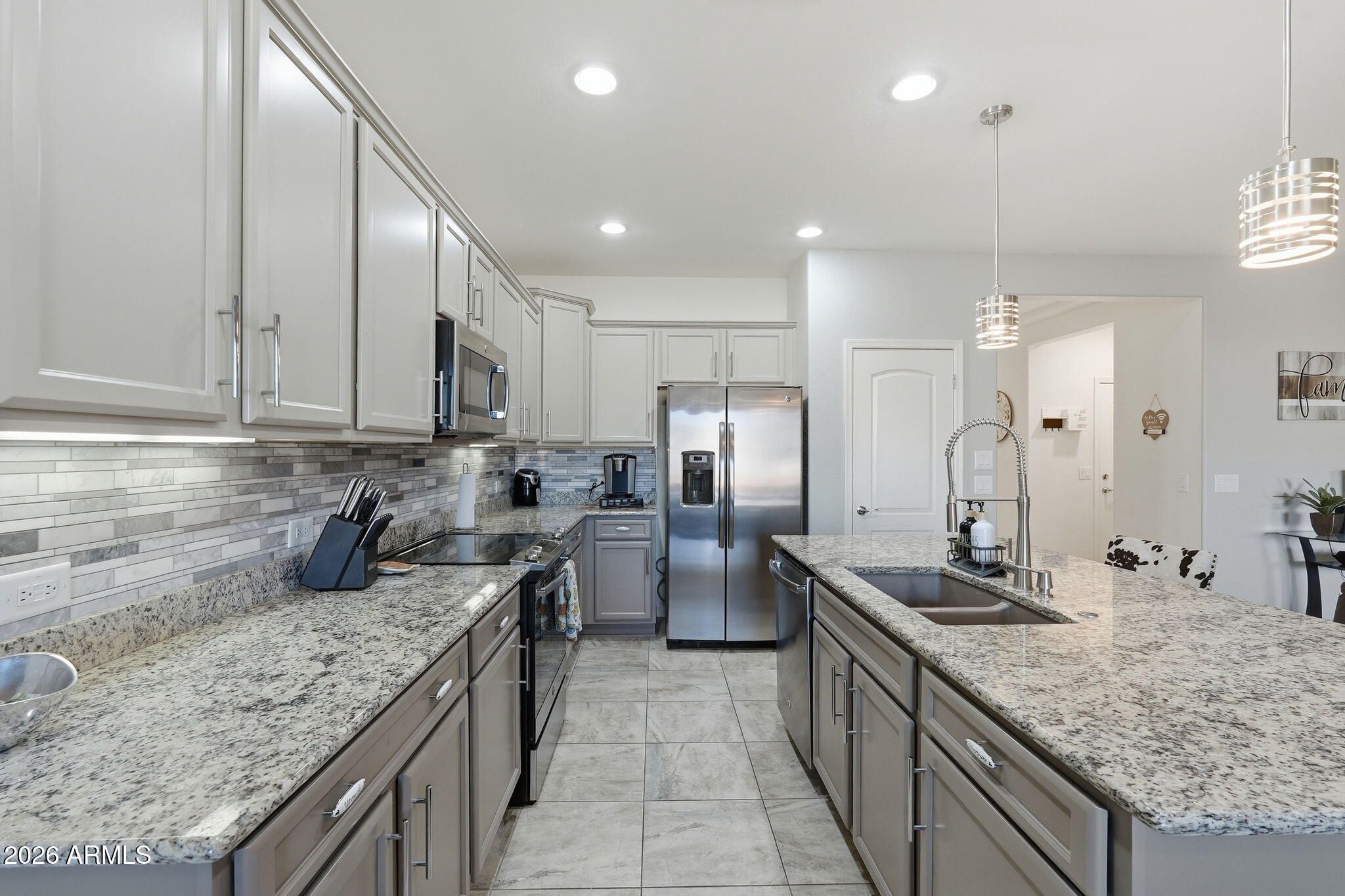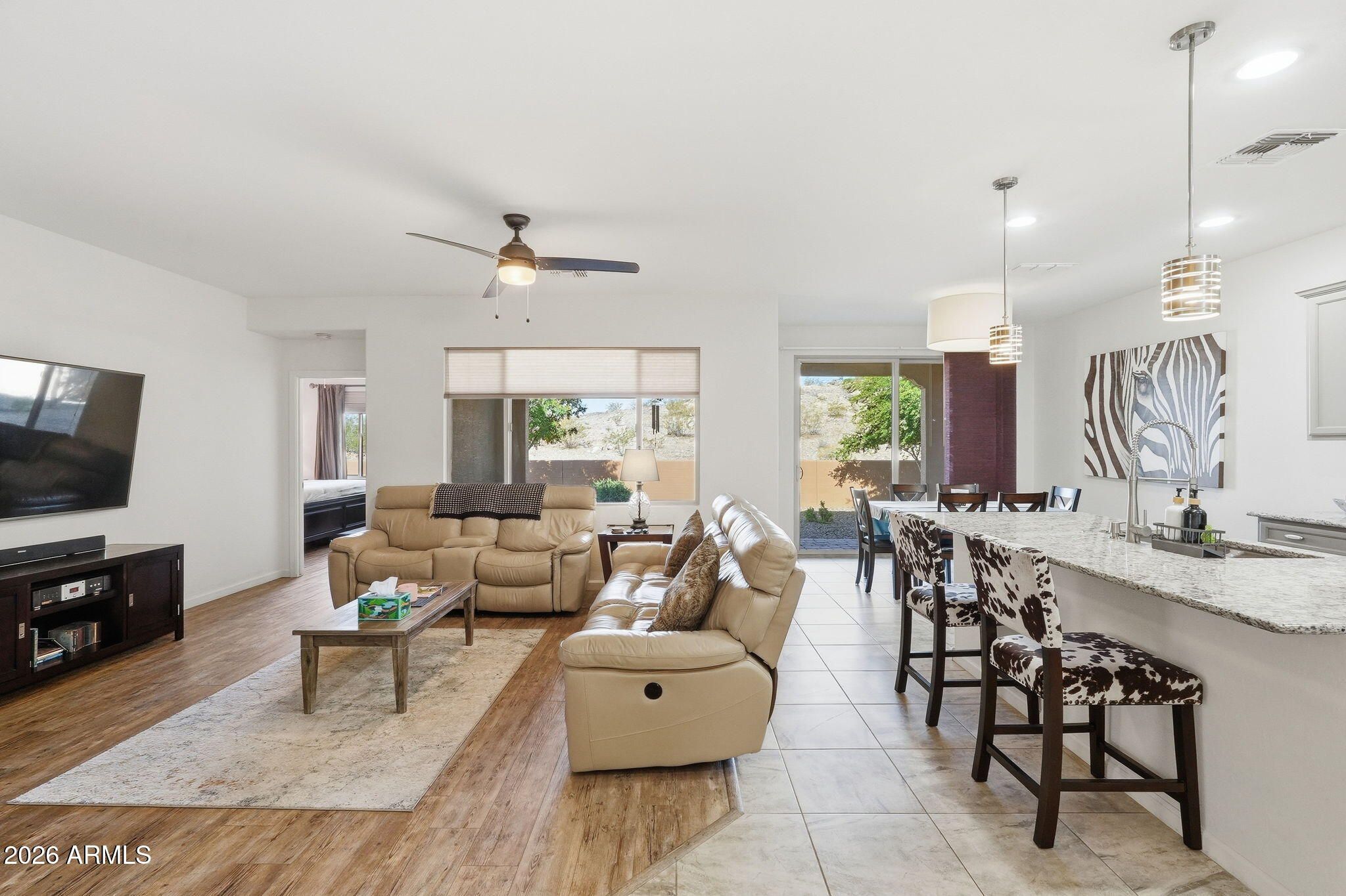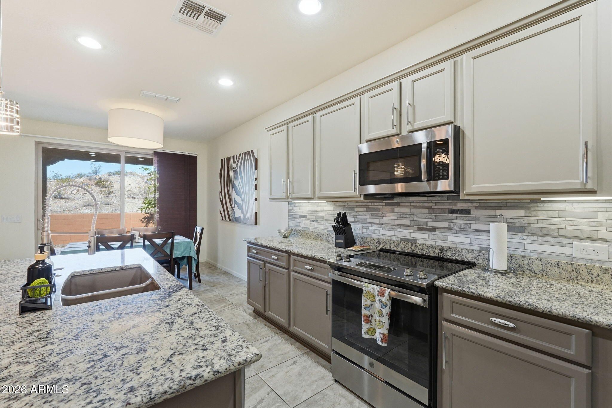 Turnkey desert retreat with stunning natural views in Robson Ranch, fully furnished and ready for you! This charming 2 bed, 2 bath Cholla model with den offers a thoughtfully designed layout with tasteful designer touches throughout. The kitchen features upgraded taupe cabinetry, porcelain sink, pendant lighting, under-cabinet lighting, and roll-out shelving, also found in both bathrooms. Enjoy tile and luxury vinyl plank flooring throughout, NO carpet. Step outside to your private backyard backing to a natural desert area, perfect for peaceful mornings, evening sunsets, and watching local wildlife. Ideal as a seasonal retreat or full-time home, where every day feels like a getaway with resort-style amenities including golf, pickleball, fitness, dining, and vibrant social events.