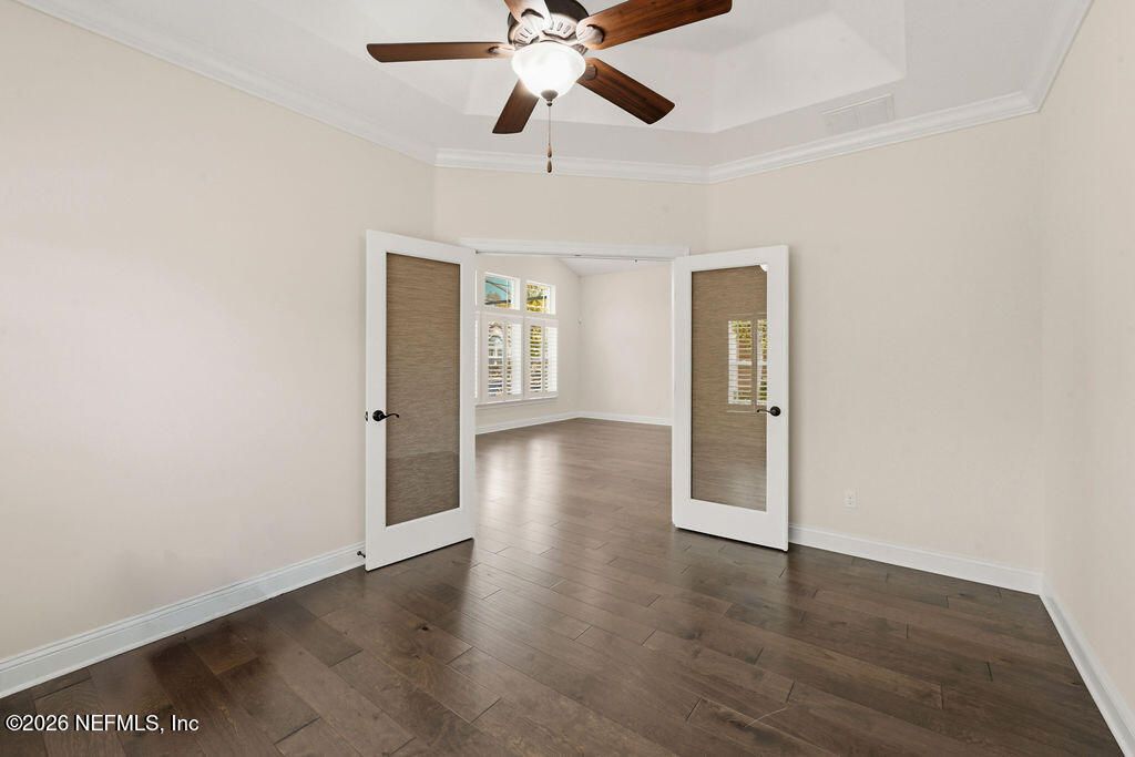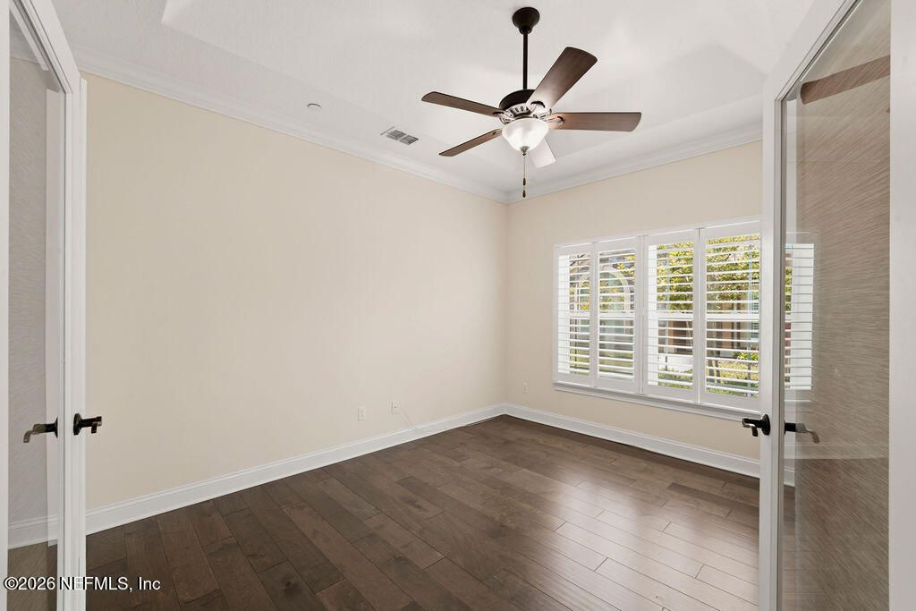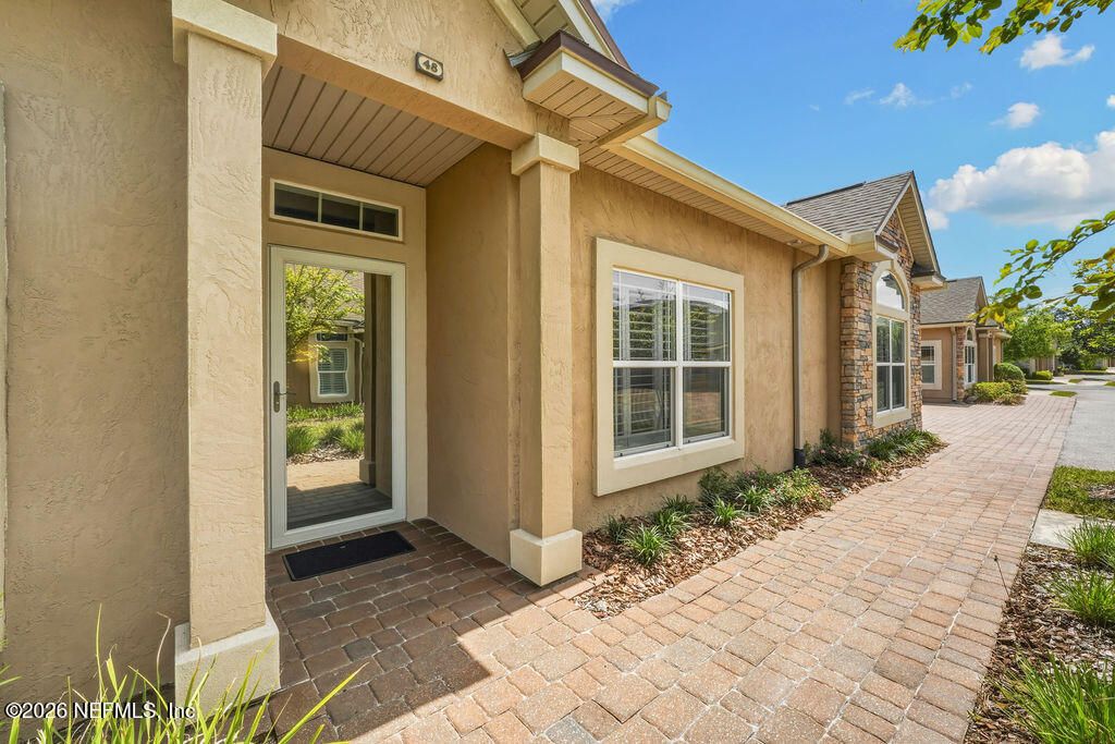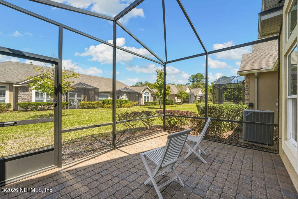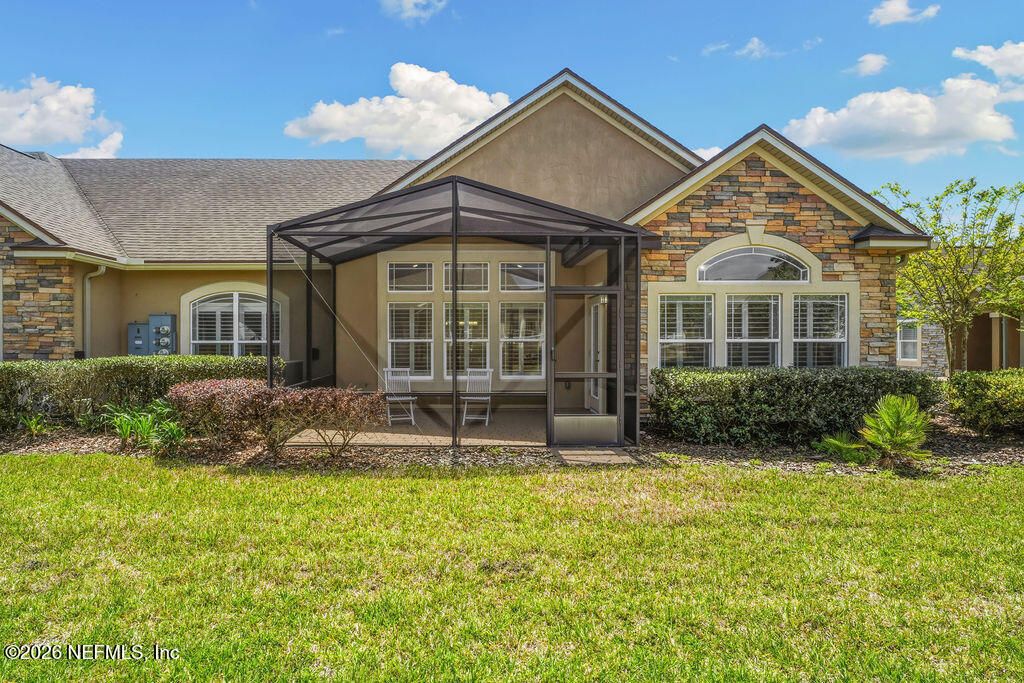 Welcome to this open and bright unit in the desirable Villages of Seloy, a peaceful gated 55+ community offering a true resort-style lifestyle. This is the largest floor plan available and features timeless design elements including vaulted and tray ceilings, transom windows and doors, tile and wood flooring, crown molding, and plantation shutters throughout. The thoughtfully designed kitchen features 42'' cabinetry, granite countertops, stainless steel appliances including a wall oven, microwave, and cooktop, subway tile backsplash, under-cabinet lighting, and a spacious center island perfect for gathering. A versatile den with French door entry provides flexible living space, while the sunroom fills the home with natural light and offers access to the screened lanai. The primary suite is a relaxing retreat with an ensuite bath featuring a tiled shower, dual split vanities, and a generous walk-in closet. A guest bedroom and full bath complete the layout. Designed for easy living, this single level home also includes a two car garage with additional storage, laundry closet, and ample storage throughout. Great updates like the 2022 AC with air purifier and UV light kit, whole house water system with water softener and reverse osmosis system, refrigerator, washer and dryer from 2024, and home security system. The quadplex design offers added privacy for each residence. Enjoy exceptional community amenities including a clubhouse, heated pool, fitness center, card and billiards rooms, library/business center, bocce ball, and a full calendar of social activities. Ideally located just minutes from historic downtown Historic St. Augustine, restaurants, shopping, and beautiful beaches. You will truly love living here.