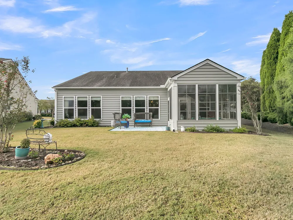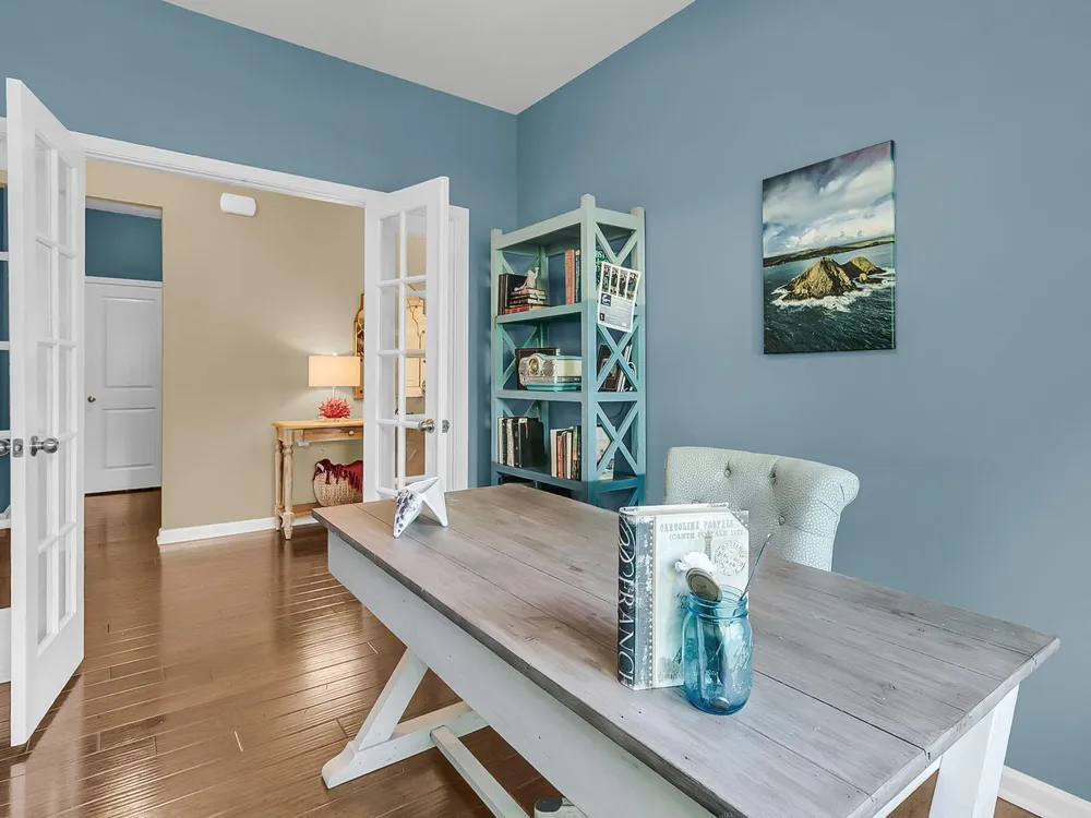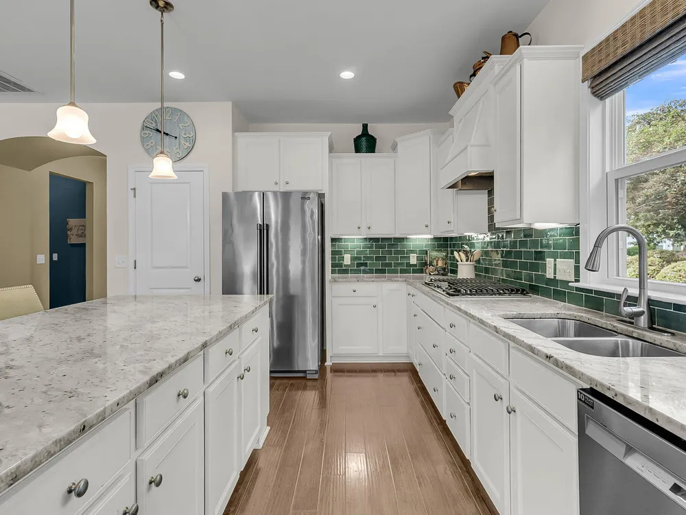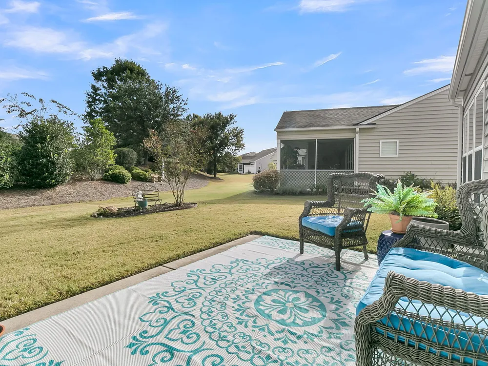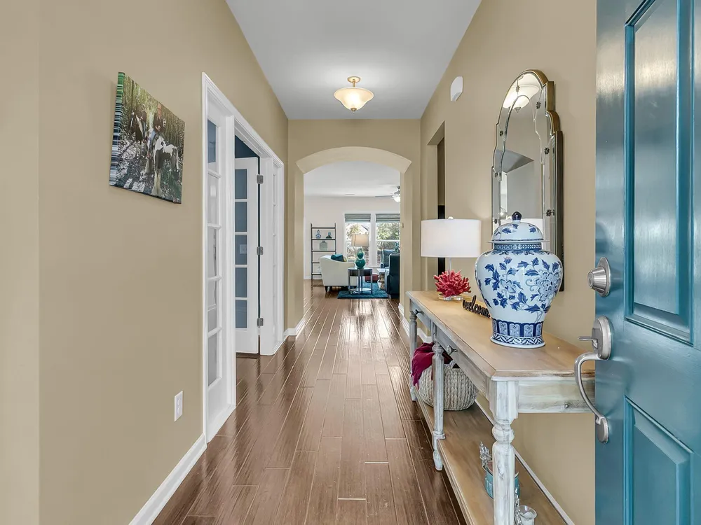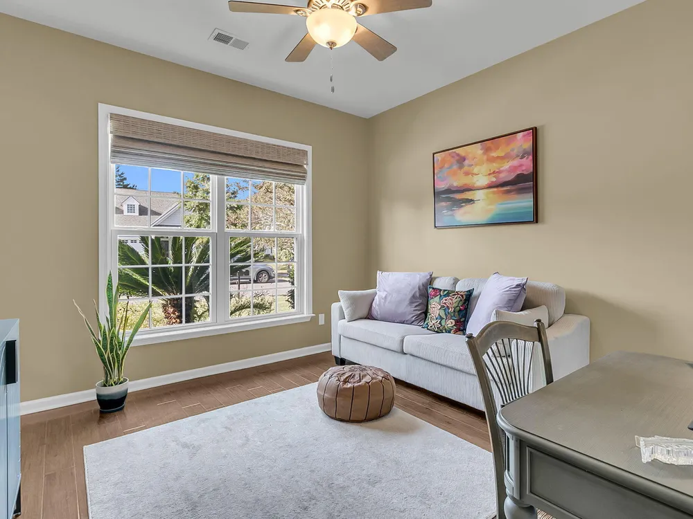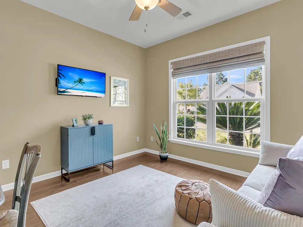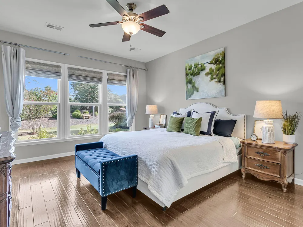 Beautiful Abbeyville home with 2 bedrooms, 2 baths, and French door office situated on a lovely private lot and offering many high-end upgrades. Just two blocks from the 20,000 sf amenities center, you'll have easy access to this award-winning community's social center. An inviting curb appeal with enhanced landscaping and flagstones welcomes you. Step inside to find five-inch hand scraped wood floors extending throughout all living areas and bedrooms - NO CARPET in home! The open concept floor plan is highlighted by the island kitchen with white cabinetry, granite countertops, stainless steel appliances with five-burner gas cooktop, built-in wall oven & microwave, and included refrigerator, custom subway tile backsplash, pendant & under-cabinet lighting, and adjacent breakfast nook. Thespacious living area sits directly in front of the kitchen, making a great entertaining space. Step outside to find a three-season room - with tile floors and retractable vinyl windows added to the screened-in porch, this is an incredible space to enjoy year round! This room and the outdoor patio overlook your own private oasis, with trees and privacy landscaping both directly behind and to one side. Back inside, the Owner's Suite includes an ensuite bath with double sink granite vanity and built-in ladies vanity, a brand new custom walk-in shower installed in 2025 with 12" x 24" tile walls, penny-tile floors, and frameless shower door, and a spacious walk-in closet. The guest bedroom and a full bath sit down their own hallway on the opposite side of the home, providing ample privacy for guests and owners alike. A French door office is a great third space that can be used as an office, den, or third bedroom. The laundry room offers tile floors, included washer & dryer, overhead cabinetry, a built-in sink, and extra storage area. A mudroom leads to the garage, which is extended four additional feet in length and has overhead storage. Don't miss out on this incredible opportunity to own a move-in ready home in the area's premier 55+ neighborhood! With a full-time lifestyle director, over 100 chartered clubs, and busy calendar of events, you'll be living your BEST retired life in Del Webb Cane Bay! Del Webb Cane Bay is privately gated and located just minutes from a Publix grocery store, medical facilities and hospital, restaurants and shops. Don't miss out on this incredible home and neighborhood opportunity!