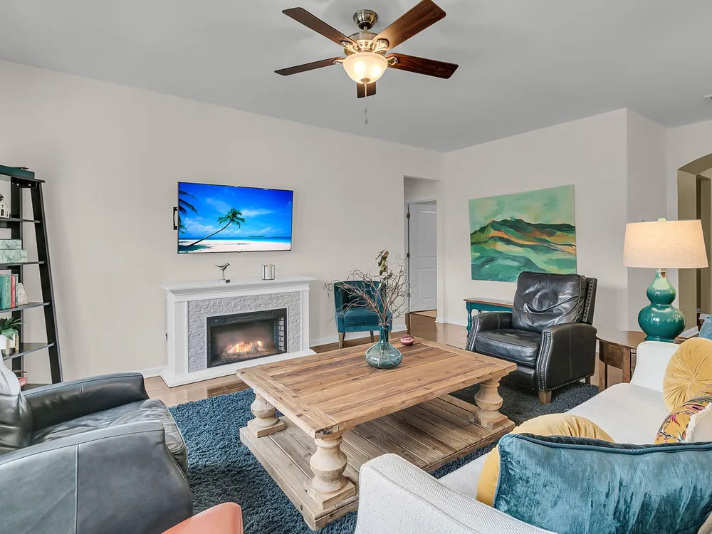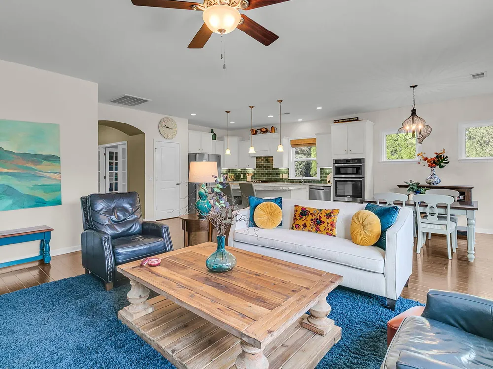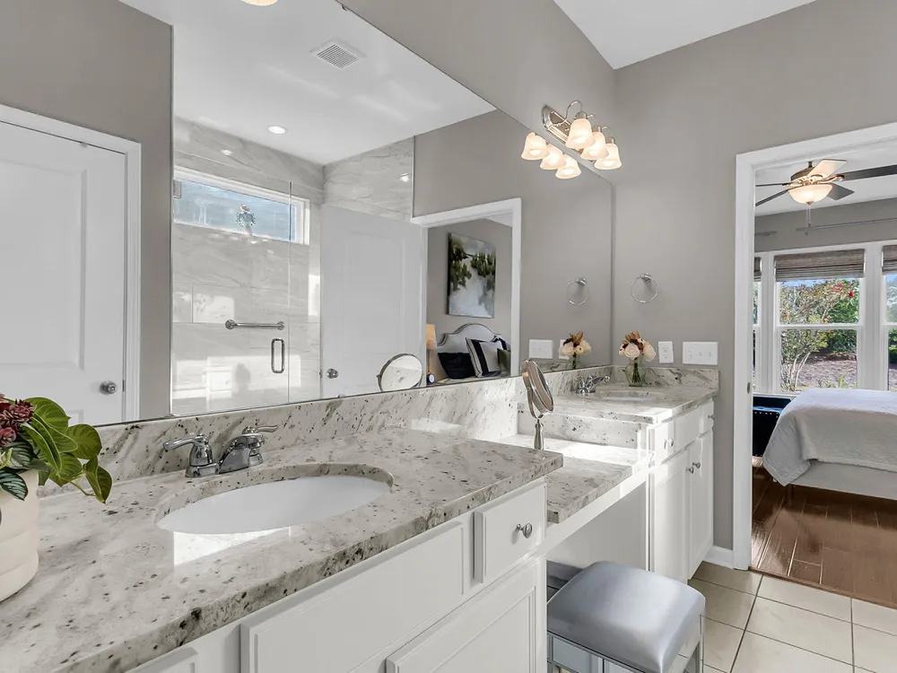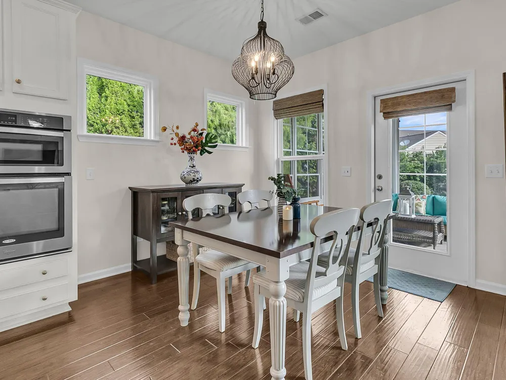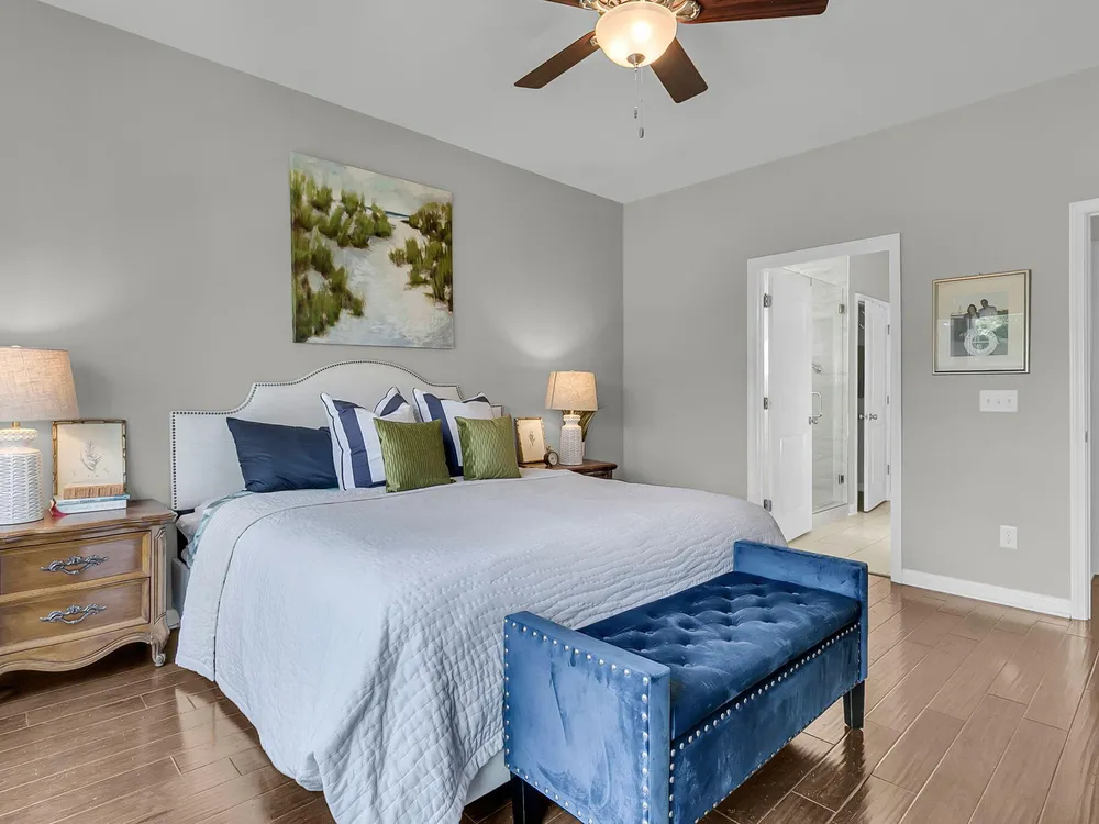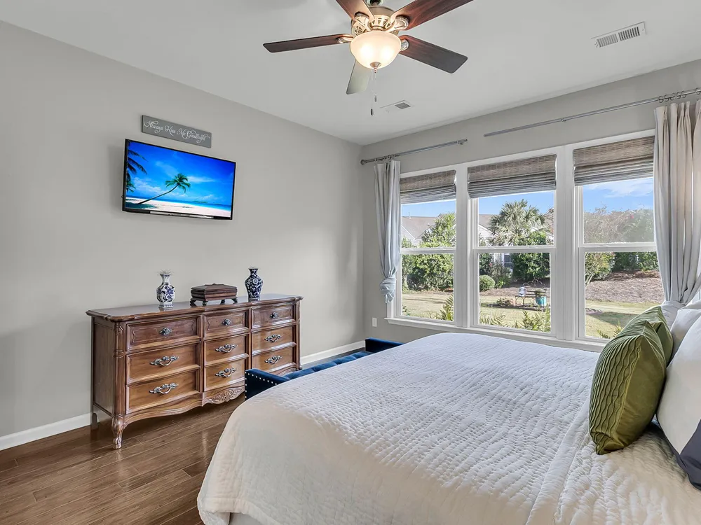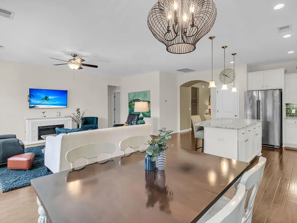 Beautiful Abbeyville home with 2 bedrooms, 2 baths, and French door office situated on a lovely private lot and offering many high-end upgrades. Just two blocks from the 20,000 sf amenities center, you'll have easy access to this award-winning community's social center. An inviting curb appeal with enhanced landscaping and flagstones welcomes you. Step inside to find five-inch hand scraped wood floors extending throughout all living areas and bedrooms - NO CARPET in home! The open concept floor plan is highlighted by the island kitchen with white cabinetry, granite countertops, stainless steel appliances with five-burner gas cooktop, built-in wall oven & microwave, and included refrigerator, custom subway tile backsplash, pendant & under-cabinet lighting, and adjacent breakfast nook. Thespacious living area sits directly in front of the kitchen, making a great entertaining space. Step outside to find a three-season room - with tile floors and retractable vinyl windows added to the screened-in porch, this is an incredible space to enjoy year round! This room and the outdoor patio overlook your own private oasis, with trees and privacy landscaping both directly behind and to one side. Back inside, the Owner's Suite includes an ensuite bath with double sink granite vanity and built-in ladies vanity, a brand new custom walk-in shower installed in 2025 with 12" x 24" tile walls, penny-tile floors, and frameless shower door, and a spacious walk-in closet. The guest bedroom and a full bath sit down their own hallway on the opposite side of the home, providing ample privacy for guests and owners alike. A French door office is a great third space that can be used as an office, den, or third bedroom. The laundry room offers tile floors, included washer & dryer, overhead cabinetry, a built-in sink, and extra storage area. A mudroom leads to the garage, which is extended four additional feet in length and has overhead storage. Don't miss out on this incredible opportunity to own a move-in ready home in the area's premier 55+ neighborhood! With a full-time lifestyle director, over 100 chartered clubs, and busy calendar of events, you'll be living your BEST retired life in Del Webb Cane Bay! Del Webb Cane Bay is privately gated and located just minutes from a Publix grocery store, medical facilities and hospital, restaurants and shops. Don't miss out on this incredible home and neighborhood opportunity!