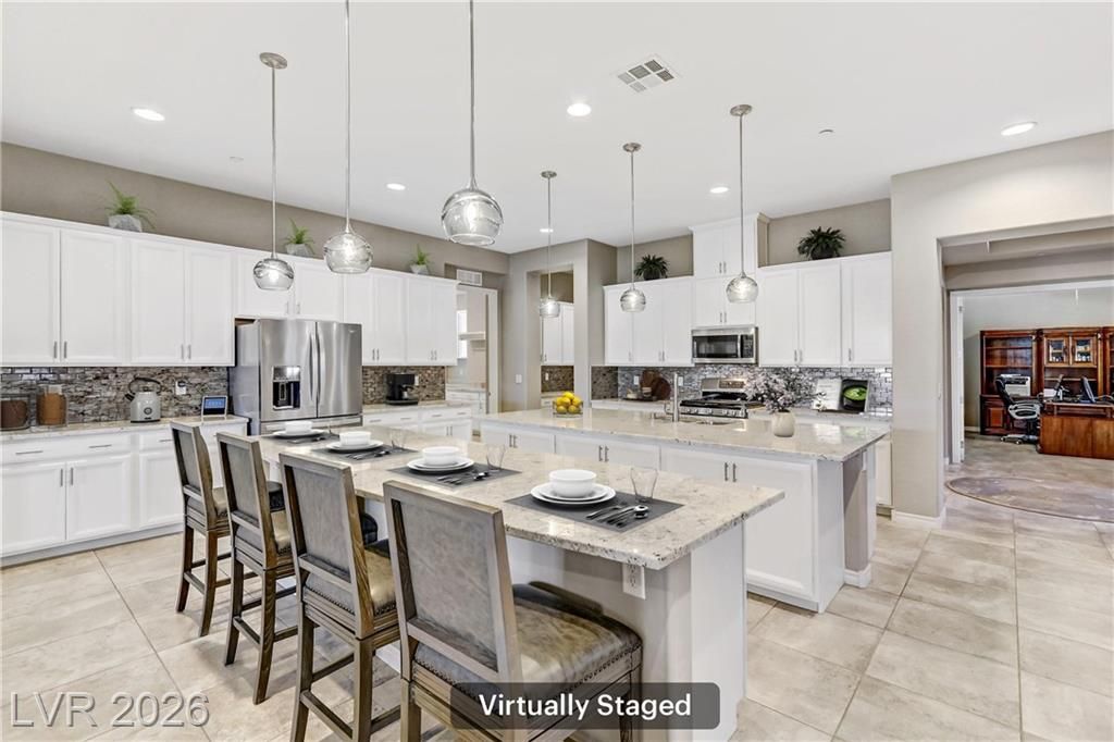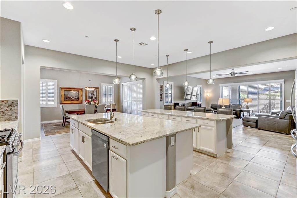 Amazing price! Elegantly Appointed Single Story in a Guard Gated Community. Step into luxury through a paver-adorned courtyard featuring grand double doors with decorative, vented wrought iron inserts. Inside, you’re welcomed by plantation shutters and a coffered ceiling that add a touch of timeless sophistication. Love to entertain? This is the ultimate chef’s dream kitchen! Featuring double islands, Italian glass pendant lighting, upgraded cabinetry, a designer backsplash & expansive counter space, it’s perfect for gatherings both large and small. Wrap Around Patio low care yard. Enjoy meals in the formal dining room and unwind in the spacious great room. Primary suite with suite bathroom with oversized shower, deep soaking tub and linen storage. The office can be easily converted into a third bedroom, adding flexibility to suit your lifestyle. World class amenities available in this community with a social calendar, Cafe', indoor and outdoor pools, gym .