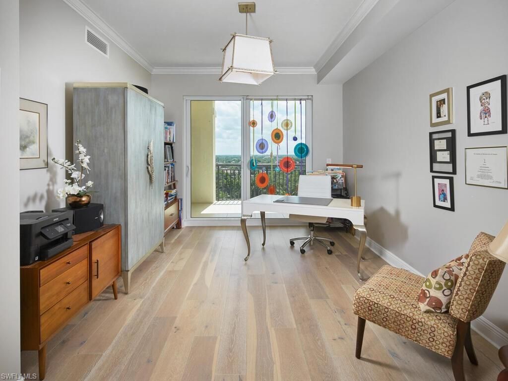 Enjoy beautiful Altaira, The Colony at Pelican Landing's newest high rise tower. Huge views overlooking both the Estero Bay and The Gulf of Mexico. Elevator opens to private foyer. Over 3300 sq. ft. three bedrooms, den and 3.5 baths plus another 400 SF on 2 terraces facing east and west. The spacious great room has amazing un-obstructed views, floor to ceiling windows/sliders. Gorgeous coastal palette with quartz kitchen counters, glass tile back splash and stainless Thermador appliances, including gas cooktop. Gorgeous wide plank wood floor in main areas. Custom wine cooler beverage station, ceiling fans and built-in bespoke entertainment center. Automatic storm shutters and 2 spaces in the enclosed garage.Altaira amenities include: 24-hour concierge service, lavish infinity edge pool, pavilion and cabanas,3 guest suites, impressive fitness facility, 3,000 sq. ft. social room, designated dog walk area, fire pitand roof top observatory.A wide array of Colony at Pelican Landing amenities include private waterfront dining at The BayClub, a 34-acre island beach park with boat shuttle and canoe/kayak parks, pickle ball, a huge tennisprogram, sailing, bocce and many social activities to boot! Elective golf memberships. Locatedwithin minutes of shopping, restaurants, sports arenas, performing art centers, world-renownedbeaches, and SWFL international airport.