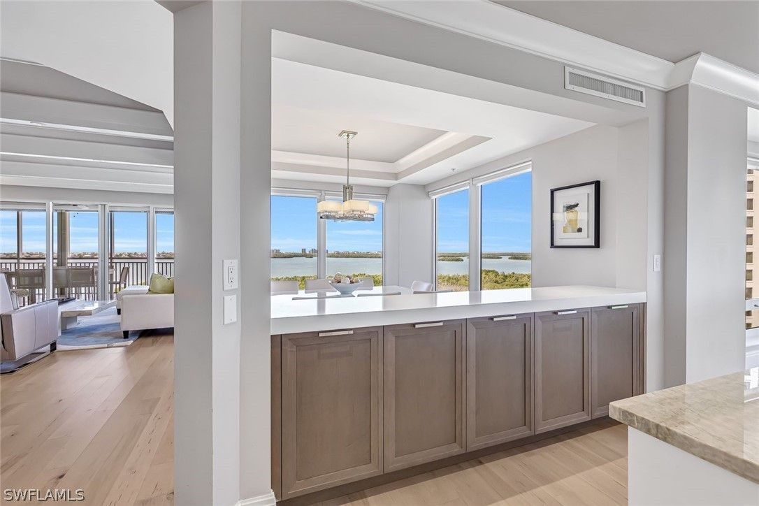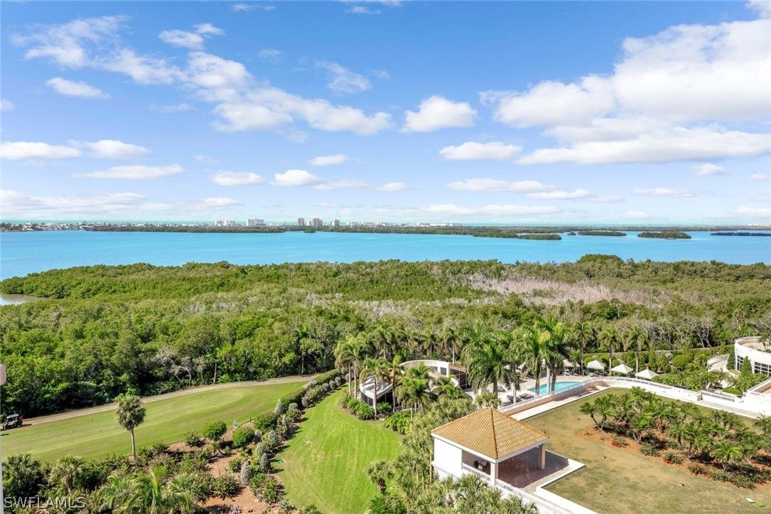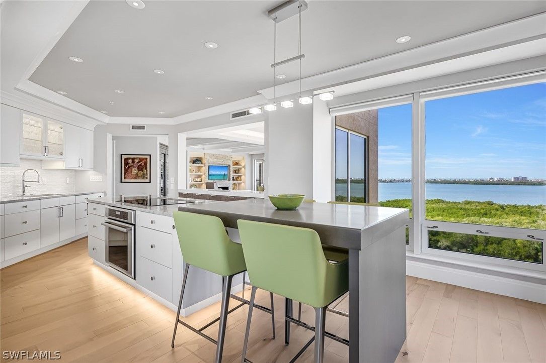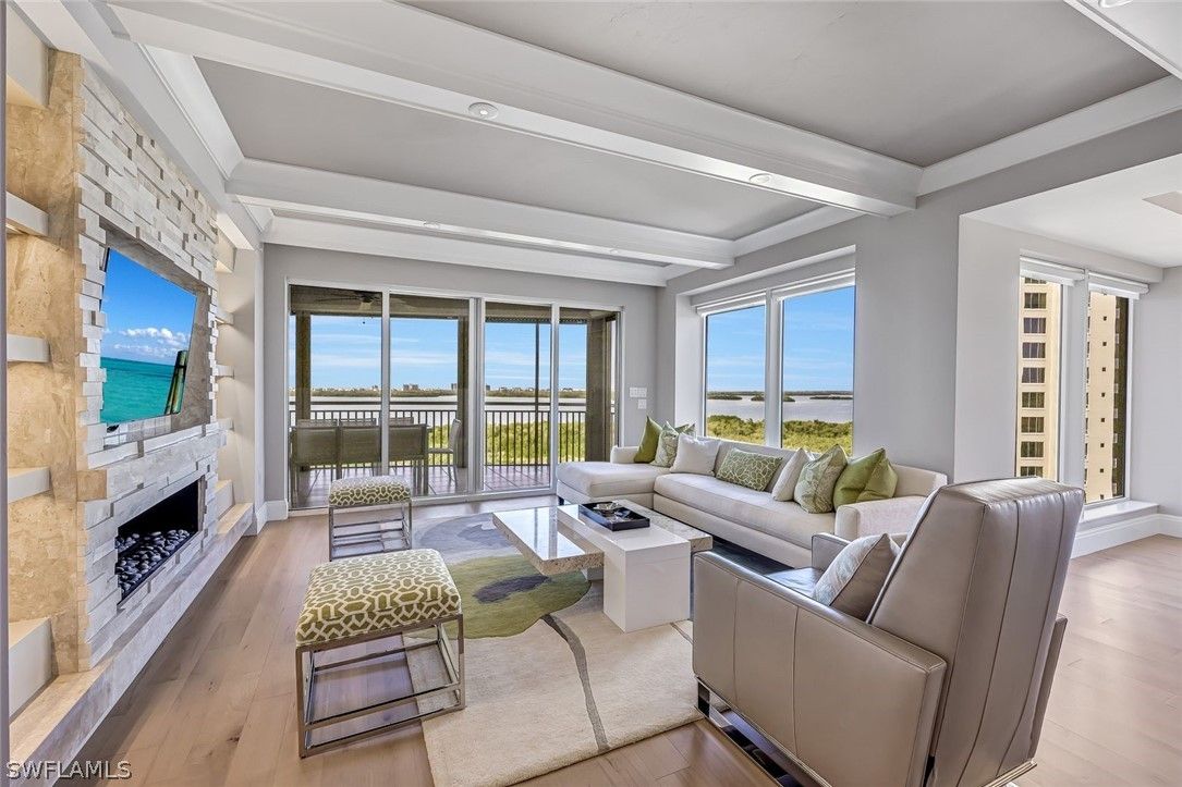 Experience the view of a lifetime from the 10th floor of this exquisitely designed, updated, and fully furnished residence in Estancia at Bonita Bay. This rare three-bedroom plus den, three-bath end unit showcases sweeping panoramic views of Estero Bay and the Gulf of Mexico, with breathtaking sunsets enjoyed year-round from the expansive screened lanai. From the moment you enter, this home makes a statement—spectacular water views meet refined designer finishes and architectural detail throughout. The open-concept living space is both grand and inviting, featuring rich maple wood flooring, custom ceiling treatments with striking wood beams, and a beautiful gas fireplace that anchors the living area with warmth and sophistication. Walls of glass flood the home with natural light, enhancing the elegance and coastal beauty of the space. At the heart of the home, the chef’s kitchen is as stunning as it is functional, outfitted with Thermador appliances including an induction cooktop and two wine coolers, a steam oven, Miele wall oven and microwave, and a spacious walk-in pantry. The kitchen flows effortlessly into the dining and living areas, creating a seamless backdrop for everyday living. An additional space off the kitchen features panoramic floor-to-ceiling windows with northern and eastern exposures, offering a tranquil setting to enjoy morning light and ever-changing skies. The luxurious primary suite is privately positioned on one side of the residence and includes custom California Closets and a spa-like bath, while two generously sized guest suites are thoughtfully tucked away on the opposite side for maximum privacy. This residence is thoughtfully equipped with electric hurricane shutters, and the AquaLatch water detection system, ensuring both comfort and peace of mind. Every element of this home reflects quality, craftsmanship, and timeless coastal elegance—truly a move-in-ready showpiece. Residents of Estancia enjoy exceptional amenities including a social room, fitness center, pool and spa, gas grills, two guest suites, and an on-site resident manager. Bonita Bay offers an unparalleled lifestyle with miles of hiking and biking trails, canoe and kayak access, a private marina with on-site restaurant, a private beach club, and a vibrant calendar of activities. Residents of Bonita Bay enjoy an unmatched lifestyle with access to a private beach club, kayaking, canoeing, pickleball/tennis, multiple parks, and more than 12 miles of walking/biking paths. Golf enthusiasts will appreciate five championship courses, along with multiple dining venues, a state-of-the-art fitness center, and a full-service marina (additional fees apply). Ideally located just minutes from world-class dining, shopping, beaches, and nature preserves, with easy access to Downtown Bonita Springs, Downtown Naples, and RSW International Airport, this residence offers the perfect balance of luxury, convenience, and coastal living.