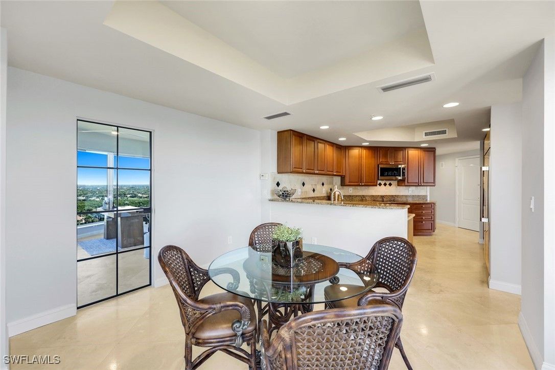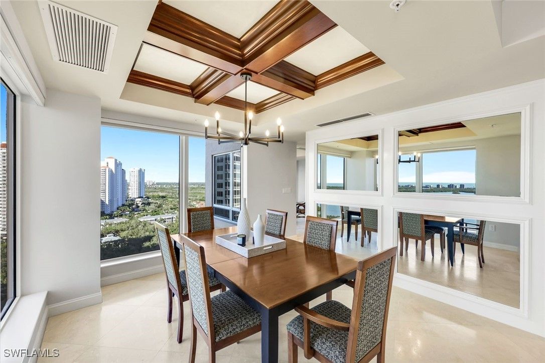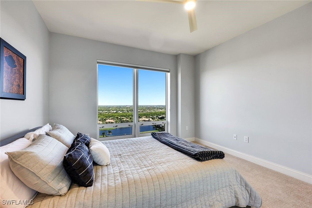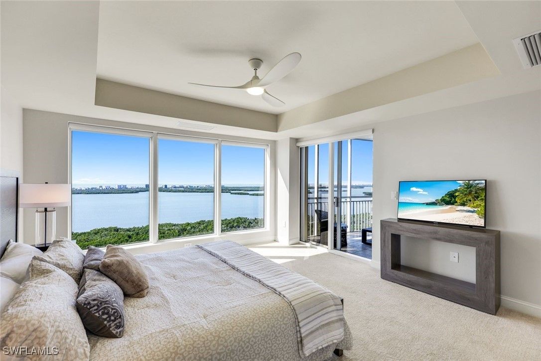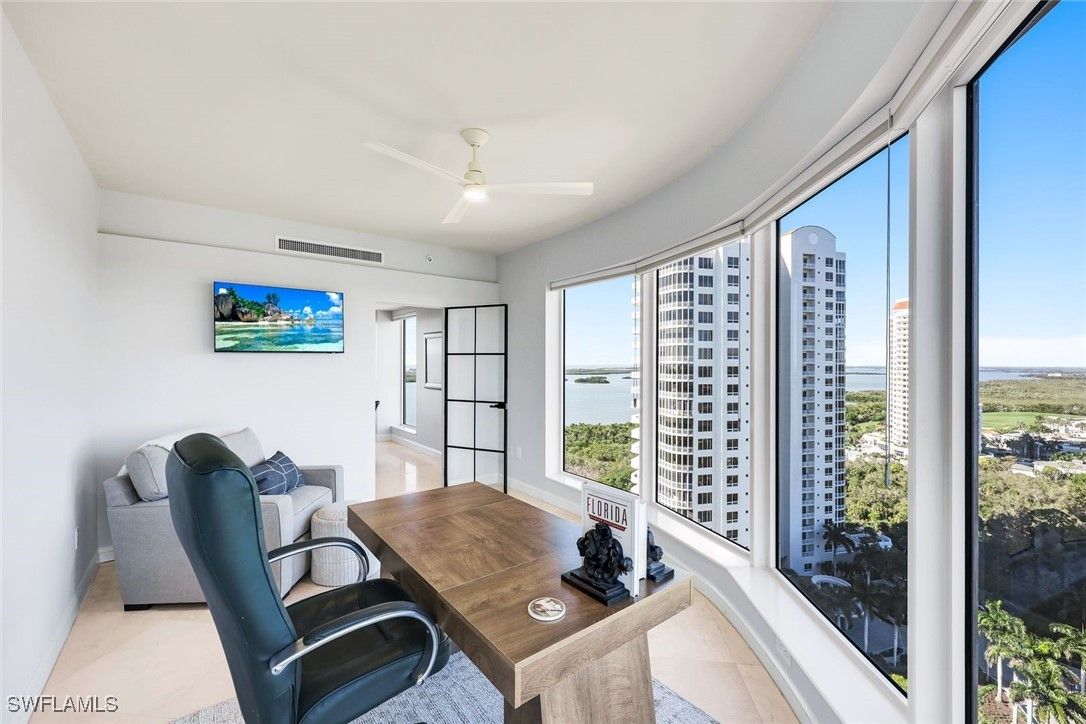 Welcome to this spacious TURNKEY 20th-floor end unit in Estancia at Bonita Bay, with UNPARALLED, breathtaking panoramic views of golf courses (eastern and western views), Estero Bay, and the Gulf of Mexico. Enjoy sunset views night after night - winter never felt so good! With three bedrooms plus a den/office and amazing resort style amenities, this stunning home combines refined elegance with everyday livability in one of Southwest Florida’s most sought-after communities. An abundance of natural light fills the open-concept living spaces, enhanced by floor-to-ceiling windows in every room capturing sweeping vistas from sunrise to sunset. The living area offers effortless flow to the expansive lanai, perfect for entertaining or relaxing while enjoying serene coastal views. The gourmet kitchen showcases Monogram stainless steel appliances, including an induction cooktop, oven, refrigerator, and microwave, complemented by granite countertops designed for both style and function. The primary suite is a private retreat featuring direct lanai access, two spacious walk-in closets, and electric shades. The primary bath includes dual sinks, a large jetted soaking tub, and a walk-in shower. Two guest bedrooms provide exceptional comfort, both with ensuite bathrooms, and plenty of closet space. The den offers a flexible space with astounding views. There are two dining areas - one is more formal and elegantly accented with a custom ceiling detail, while the other is just off the kitchen and perfect for everyday dining. The laundry room includes a utility sink for added convenience. Recent upgrades include new windows in all bedrooms, two AC units (2022), and a new hot water heater (2025), ensuring modern comfort and peace of mind. Residents of Estancia enjoy an amenity-rich lifestyle featuring a resort-style pool and spa, fitness center, guest suites, and club room, along with access to Bonita Bay’s unparalleled offerings—a private beach park, pickleball, tennis, kayaking and canoeing, miles of walking and biking paths, community parks, and a full-service marina and waterfront restaurant. Optional club memberships provide access to five championship golf courses, fine dining venues, and an expansive sports complex. Perfectly located near world-class shopping, dining, and beaches, and just a short drive to RSW International Airport, this exceptional home invites you to experience the very best of Southwest Florida luxury living—ideal as a seasonal retreat or year-round residence.