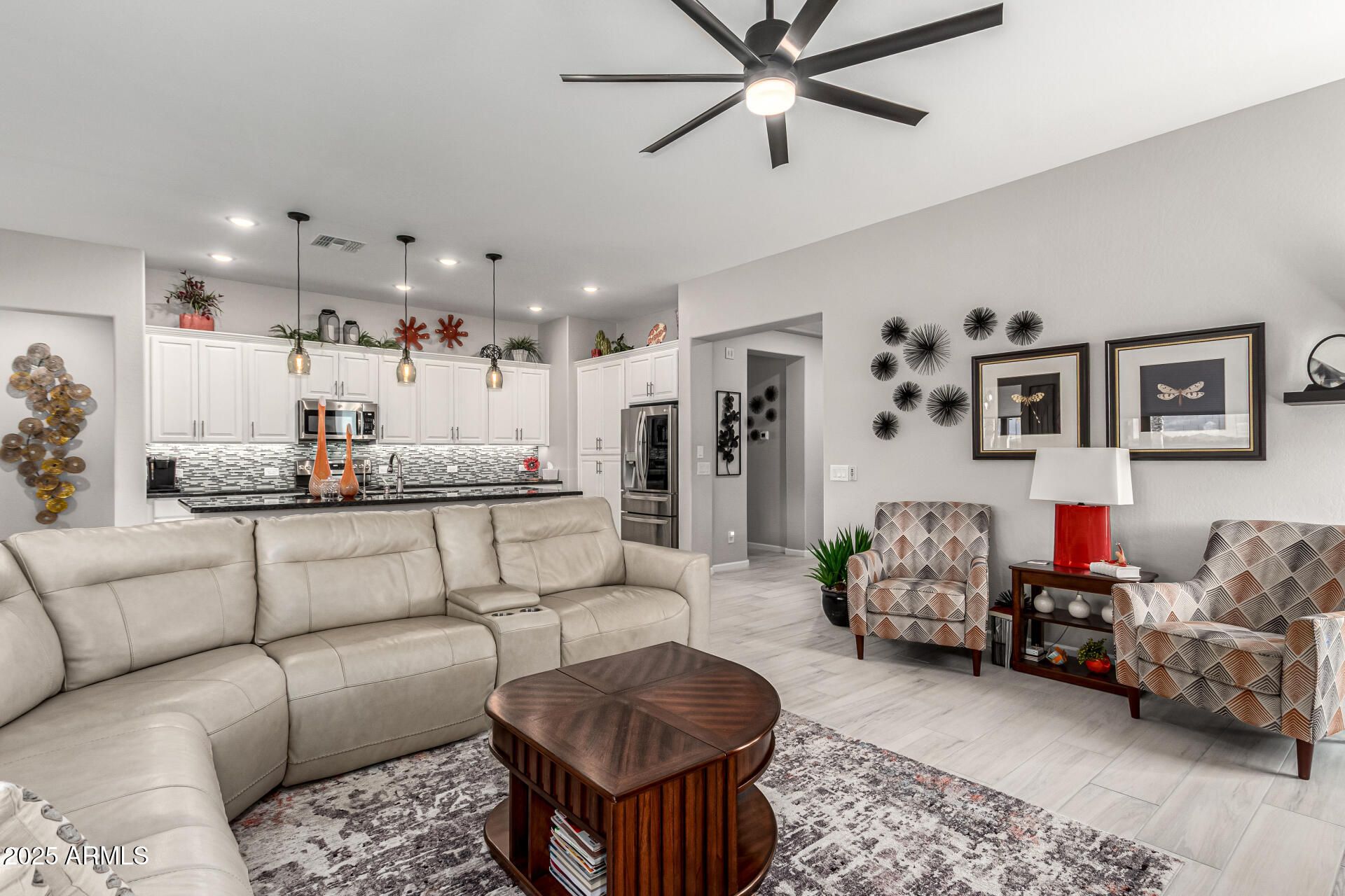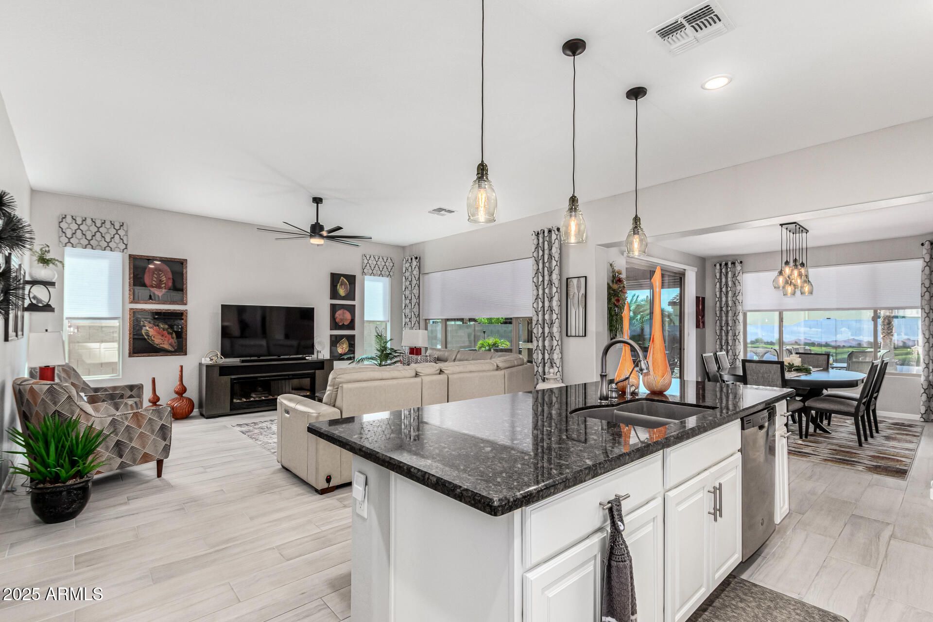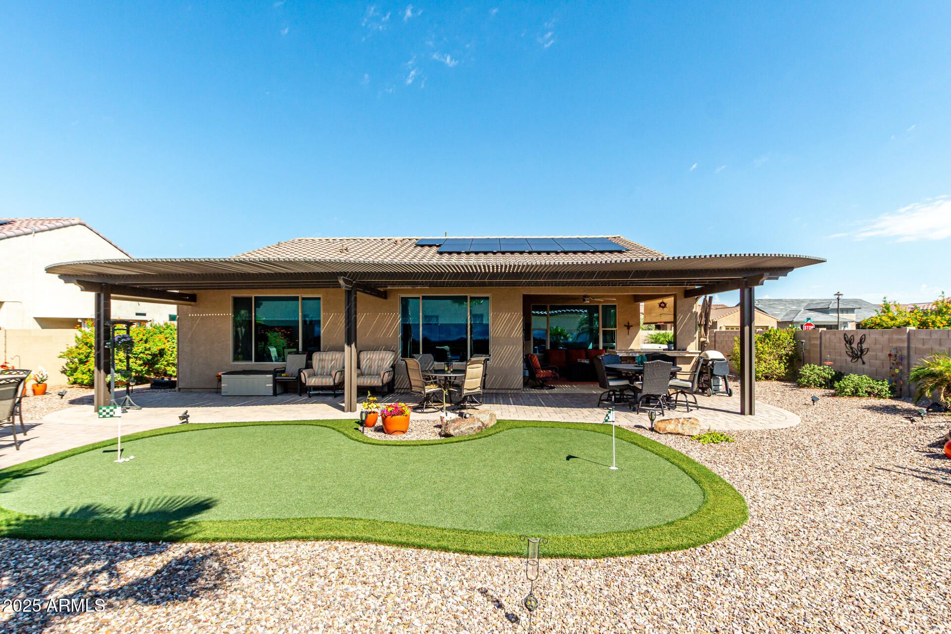 EXCEPTIONAL Altura model in mint condition on desirable corner lot. Fabulous designer kitchen with white cupboards and black granite. All appliances included with new LG refrigerator and Kenmore front loader washer/dryer. PAID SOLAR. Guest suite & spacious den. 2.5 garage with epoxy floor, Trane mini split for heating & cooling, water softener and RO system. Other upgrades include lighting, honeycomb blinds, windows, security door Backyard paradise include an Eco Spa with lounger, grass area, pavers, putting green, patio island bar, and pergola with rope lighting. Beautiful mural. A slice of heaven. Get ready to enjoy Robson Ranch with all amenities and clubs, pickleball, golf, restaurant, coffee shop, entertainment, plays, concerts.