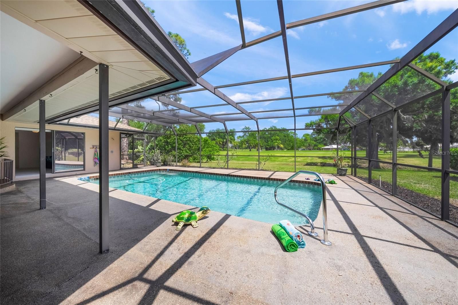 PERFECTLY POSITIONED ON THE 3RD TEE of the Champions Golf Course in Palm Aire, this classic Florida ranch sits on an expansive 14,680 sq ft lot with no HOA or CDD fees. STUNNING VIEWS - From the moment you enter through the double wood doors, you’re greeted by breathtaking, sun-filled views across the spacious living room, sparkling pool, and wide-open golf course beyond. ABUNDANT AND FLEXIBLE LIVING SPACE – Offering 3 bedrooms, 2.5 baths, and nearly 2,400 sq ft of living space with a desirable split floor plan, this single level home includes a private guest or family wing closed off by a pocket door. The light and bright kitchen features beautiful hickory flooring, generous cabinet space, shiny appliances with a Bosch dishwasher, new microwave, a large peninsula, and a separate prep island with sink—perfect for entertaining. The open floor plan flows from the kitchen to the spacious family room which showcases vaulted, beamed ceilings and easy access to the pool, while the primary suite also offers direct pool access, a large walk-in closet with room for expansion, and two separate vanities for private prep space. Four sets of sliding glass doors create seamless indoor-outdoor living. Step outside to the 15x30 pool, with pebble-finished pool deck and lanai, outdoor shower, and a raised dining area—all overlooking that beautiful golf course view. ADDITIONAL HIGHLIGHTS - Major updates include a new roof (2024) and A/C (2025). The oversized garage includes side entry door for dedicated golf cart access, attic storage with pull-down stairs, hurricane-resistant garage door, and is loaded with storage space! Optional Palm Aire Country Club memberships with two 18-hole courses, tennis, fitness, pickleball, and social events and includes fine dining inside the beautiful Country Club restaurant with curbside “to-go”! A rare opportunity for an unforgettable view, generous living space and a golf course location - all in one of Palm Aire’s most desirable settings.