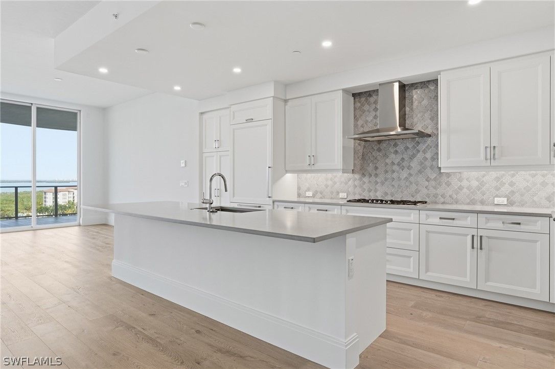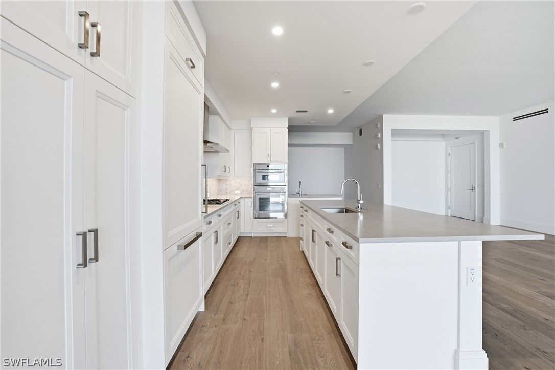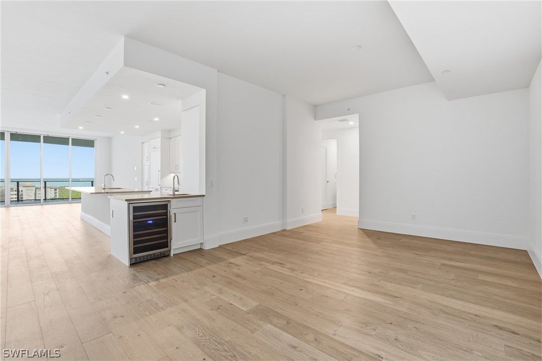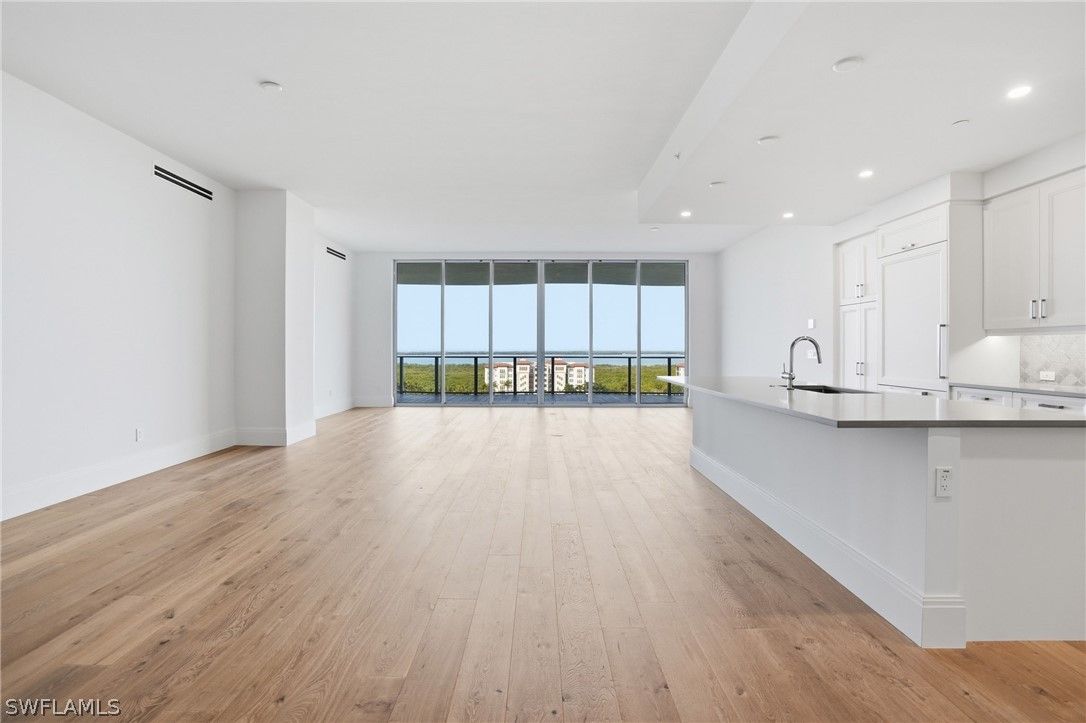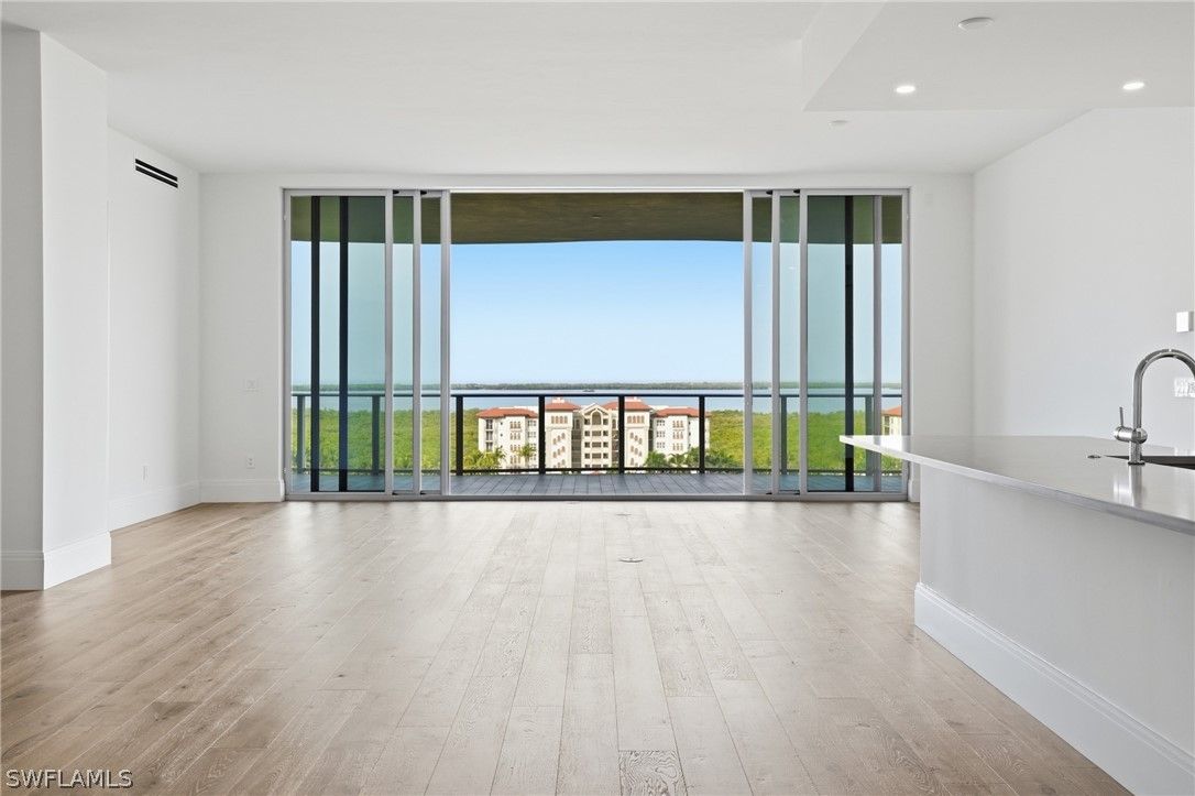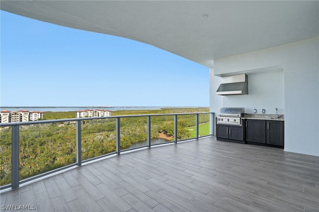 Welcome to a brand-new coastal residence at Infinity at The Colony, where elevated design, breathtaking Gulf and water views, and a resort-style lifestyle come together effortlessly. Positioned high above the shoreline, expansive glass frames sweeping vistas and fills the home with natural light from the moment you arrive. Step inside via your private elevator and into a bright, contemporary interior with soaring ceilings and an open layout that lives beautifully, whether you are hosting or enjoying a quiet evening at home. The upgrades feel intentional and refined throughout. Wood flooring runs through all bedrooms, bringing warmth and continuity to the private spaces. In the kitchen, upgraded quartz surfaces create a clean, polished statement, complemented by a tiled backsplash that adds a tailored coastal finish. A matching quartz wet bar makes entertaining seamless, while J-boxes above the island are already in place, ready for the pendant lighting that completes the designer look. Glass doors open to an oversized lanai with a built-in grill, inviting you to dine al fresco, unwind with morning coffee, and take in the changing sky over the water. A second private outdoor space adds even more flexibility for lounging, hosting, or simply enjoying the breeze. Beyond your front door, Infinity offers a full suite of amenities designed for comfort and ease, including multiple resort-style pools, a poolside restaurant, a member’s lounge, a game room, and a state-of-the-art fitness center. Recreation continues with pickleball courts and a PopStroke-style golf experience designed by Tiger Woods’ architect, plus thoughtful pet amenities like an on-site dog spa and dog park. Evenings are elevated on the rooftop terrace with an outdoor kitchen and firepits, all complemented by 24-hour concierge service and access to The Colony’s private island beach park and the waterfront Bay Club. This is coastal luxury with intention: upgraded finishes, expansive outdoor living, and a curated amenity lifestyle that feels effortless every day.