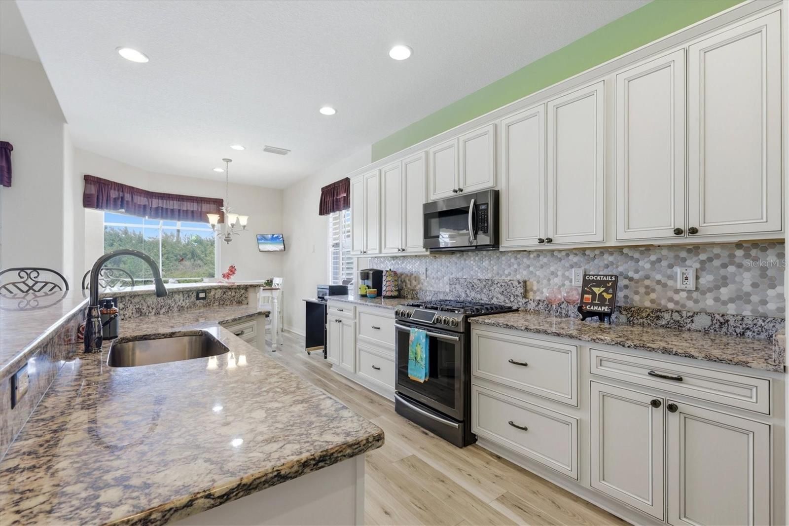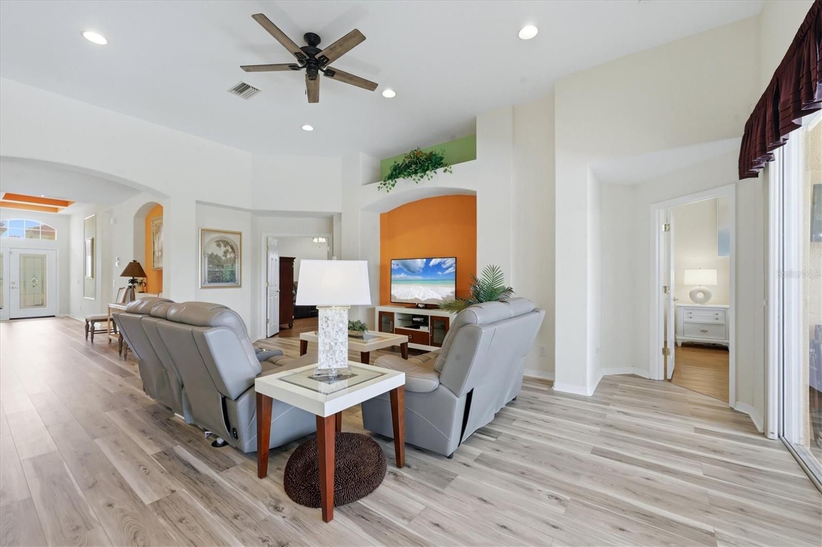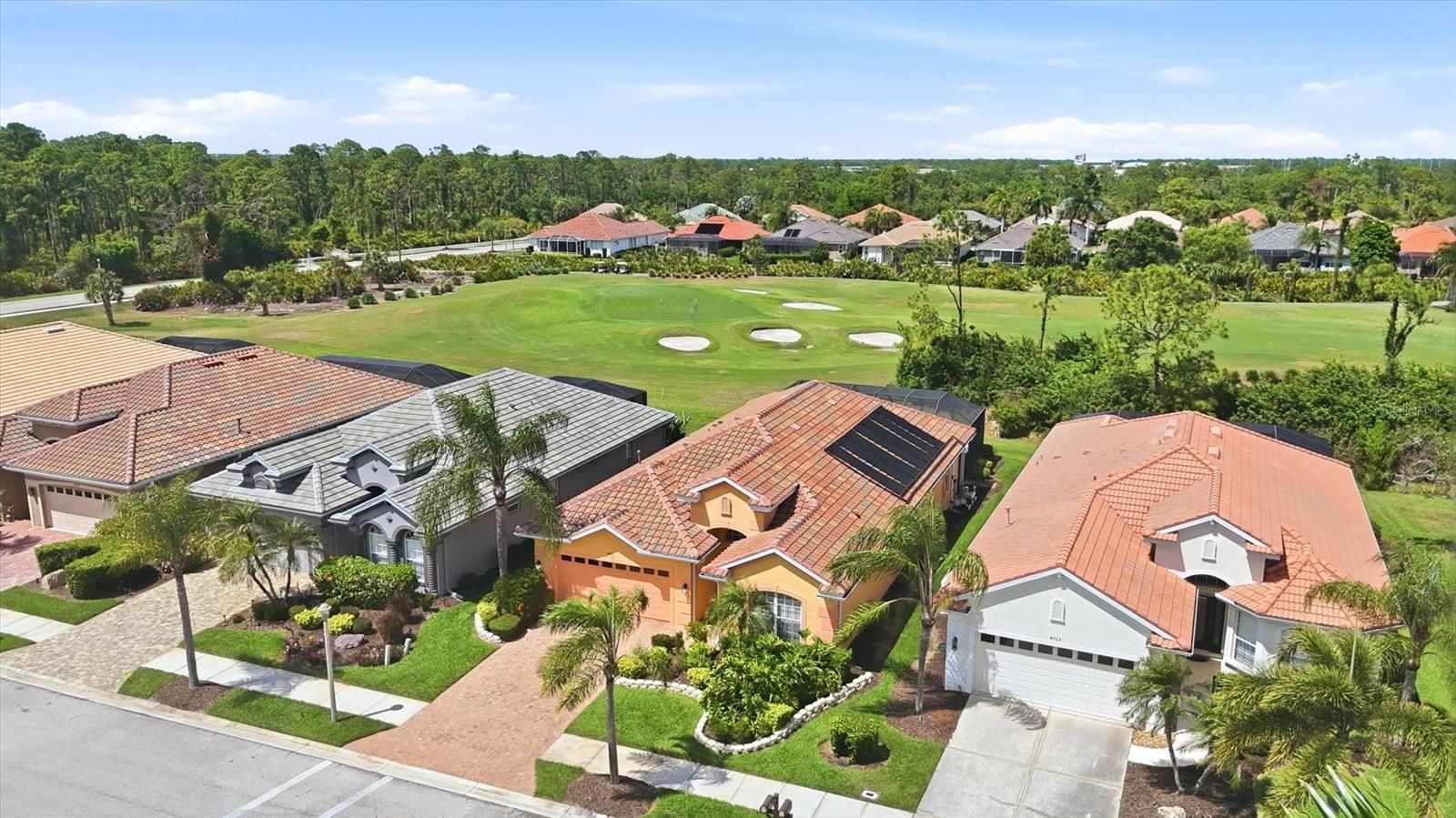 Tucked along the 1st hole of the Creek Course in Heron Creek Golf & CC, this cheerful Mediterranean-inspired home boasts 2,174 square feet of easy living, featuring 3 BED, 2.5 BA, DEN and POOL & SPA, all with a personality uniquely its own. You can't help but smile when you arrive as it welcomes you with warm tangerine and peach tones, a multicolored barrel tile roof, and a paver drive setting a lighthearted tone from Hello! Inside, volume ceilings, tray details, and an airy flow guide you from the foyer into comfortable gathering spaces designed for both everyday living and effortless entertaining, while a fun interior palette with citrusy pops of tangerine and lime brings a fresh, uplifting energy—light, bright, and just a little reminiscent of rainbow sherbet on a warm Florida afternoon. The UPDATED KITCHEN blends beauty with function, featuring raised-panel light wood cabinetry, exotic granite countertops, sleek slate-finish stainless appliances, a large corner pantry, and deep pull-out pot drawers, all accented by a mosaic tile backsplash that adds texture and visual interest. A flexible den offers the perfect spot for a home office or quiet retreat, while the split bedroom design creates privacy for guests, with two bedrooms tucked into their own wing with a shared bath, plus a convenient powder room for visitors. The primary suite is a relaxing escape where classic plantation shutters filter in soft natural light and capture that easy, coastal-breeze feeling, complete with an extraordinarily spacious walk-in closet and private bath. Outdoors is where this home truly shines and your personal oasis awaits—your freshly resurfaced, solar-heated pool and spa invite year-round enjoyment, all set within a screened paver lanai overlooking the fairway and a peaceful natural backdrop, where osprey, bald eagles, and blue heron are known to gather and vibrant sunsets paint the evening sky. Additional highlights include a designated laundry room, two-car garage, and a whole-house Generac generator for peace of mind, along with the added benefit of a NEW BARREL TILE ROOF. Most furnishings are available under separate contract, offering an easy move-in ready option if desired, all just a short golf cart ride to the clubhouse and the exceptional lifestyle Heron Creek is known for. Heron Creek offers exceptional amenities including a 21,000 sq ft clubhouse, 27 holes of Championship golf Arthur Hills design, resort style pool & spa, a robust social activity calendar, fitness center, Tennis courts & formal & casual dining options! Club Membership is required with 3 membership levels offered beginning at $276/month *NO CDD FEES * LOW HOA FEES include lawn care, trimmings, mulching, irrigation, FIBER OPTIC/ TV/ HIGH-SPEED INTERNET & Gated entry, conveniently located w/easy access to I-75 & US-41, Cocoa Plum Shopping, Myakkahatchee Creek trails, WELLEN PARK, Braves Stadium, COSTCO & will be just 3 miles to the new 507 Million SMH Hospital now under construction to I-75 and Sumter Blvd!