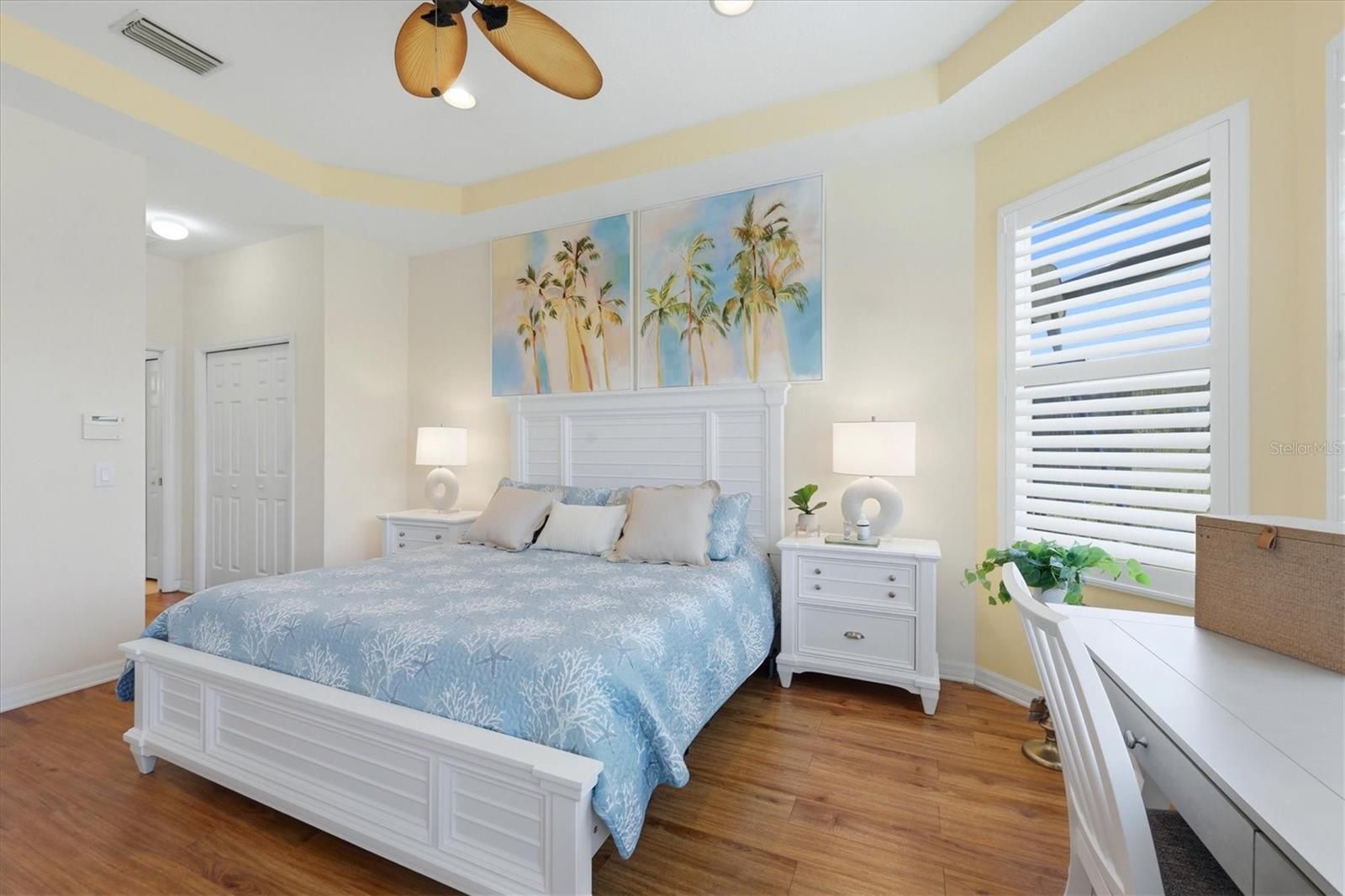 - Ceiling Fan(s), Coffered Ceiling(s), Eat-in Kitchen, High Ceilings, Open Floorplan, Split Bedrooms, Stone Counters, Tray Ceiling(s), Walk-In Closet(s), Window Treatments