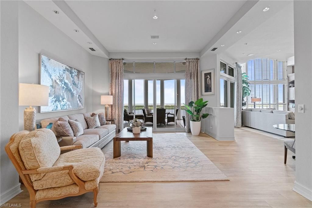 Welcome to this beautifully remodeled 12th-floor penthouse in Bonita Bay, offering breathtaking, unobstructed views of lush mangroves, wide Estero Bay, and the Gulf. This 3-bedroom, 3-bath residence was beautifully updated in 2020 and is ready for its new owners. Step inside to a bright and open floor plan featuring luxury vinyl flooring throughout and soaring volume ceilings that make this space feels bright and open. Custom built-ins in the living room help frame the space beautifully. The kitchen is a chef's delight, complete with granite countertops, large island, breakfast bar, walk-in pantry, and a gorgeous blue tile backsplash. It is equipped with a built-in oven and recessed lighting. The spacious primary suite is a true retreat with floor-to-ceiling sliders that open to one of the unit's two lanais. The fully remodeled ensuite bathroom boasts a walk-in shower, a soaking tub, dual sinks set in quartz countertops, a dedicated makeup vanity, and soft-close cabinetry for extra storage. You will fall in love with the spacious primary closet with built ins and a center island. Enjoy the best of Florida living with two separate lanais—one on the west side, enclosed with upgraded electric hurricane screens, with sparkling Gulf views for incredible sunsets, and a second on the east side with a view of the golf course and Bonita Bay beyond. Both lanais feature individual electric storm screens (2020) for added protection and comfort. Additional features include custom window coverings throughout, a dedicated laundry room with a utility tub, and a two-car enclosed garage located on the second floor. Enjoy all that Bonita Bay has to offer, including a private beach park on the Gulf of Mexico, over 12 miles of scenic walking and biking trails, three community parks, and a full-service marina. Optional membership to the Bonita Bay Club grants access to 5 world-class golf courses, tennis, dining, spa services, and more—some of the finest amenities in Southwest Florida.