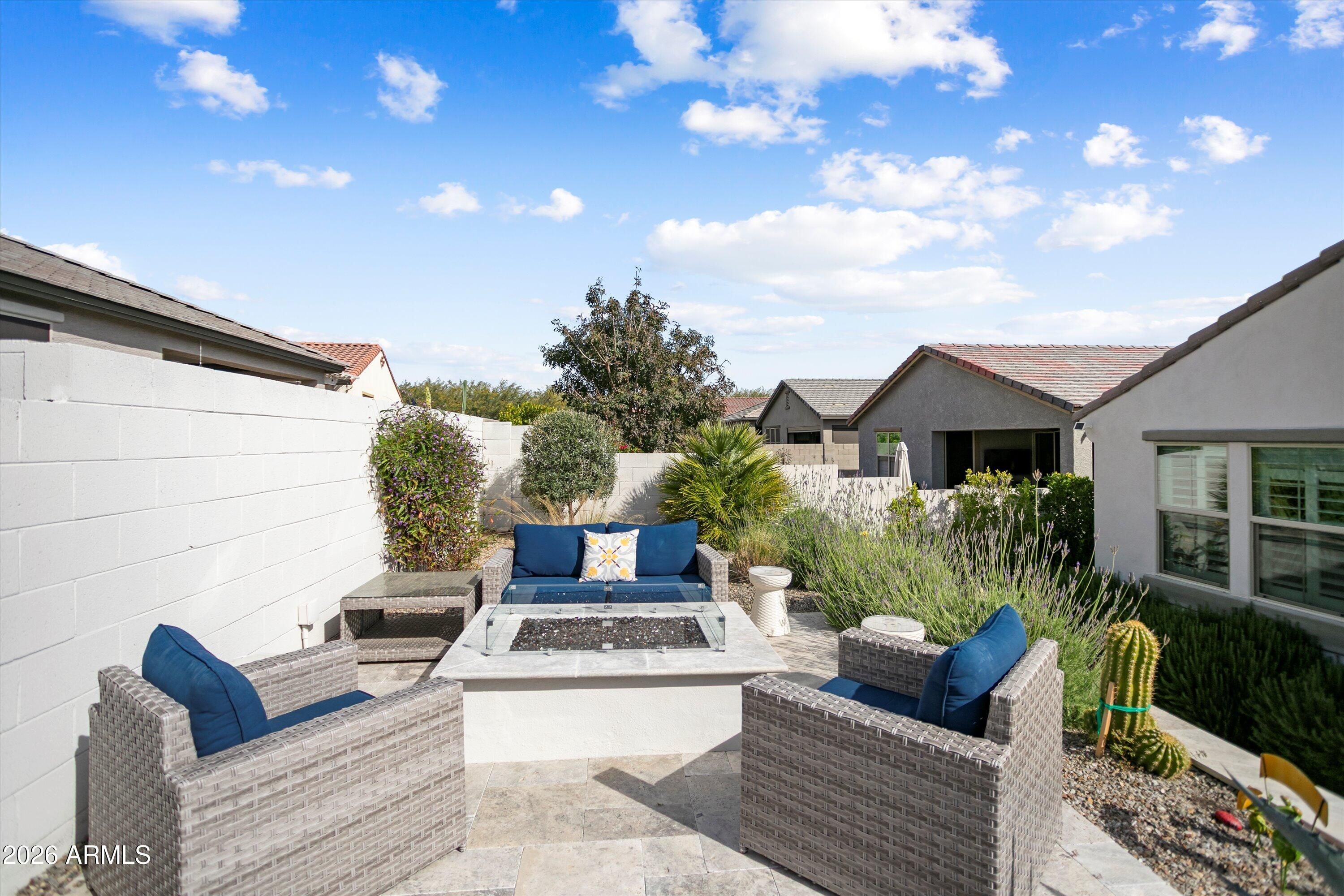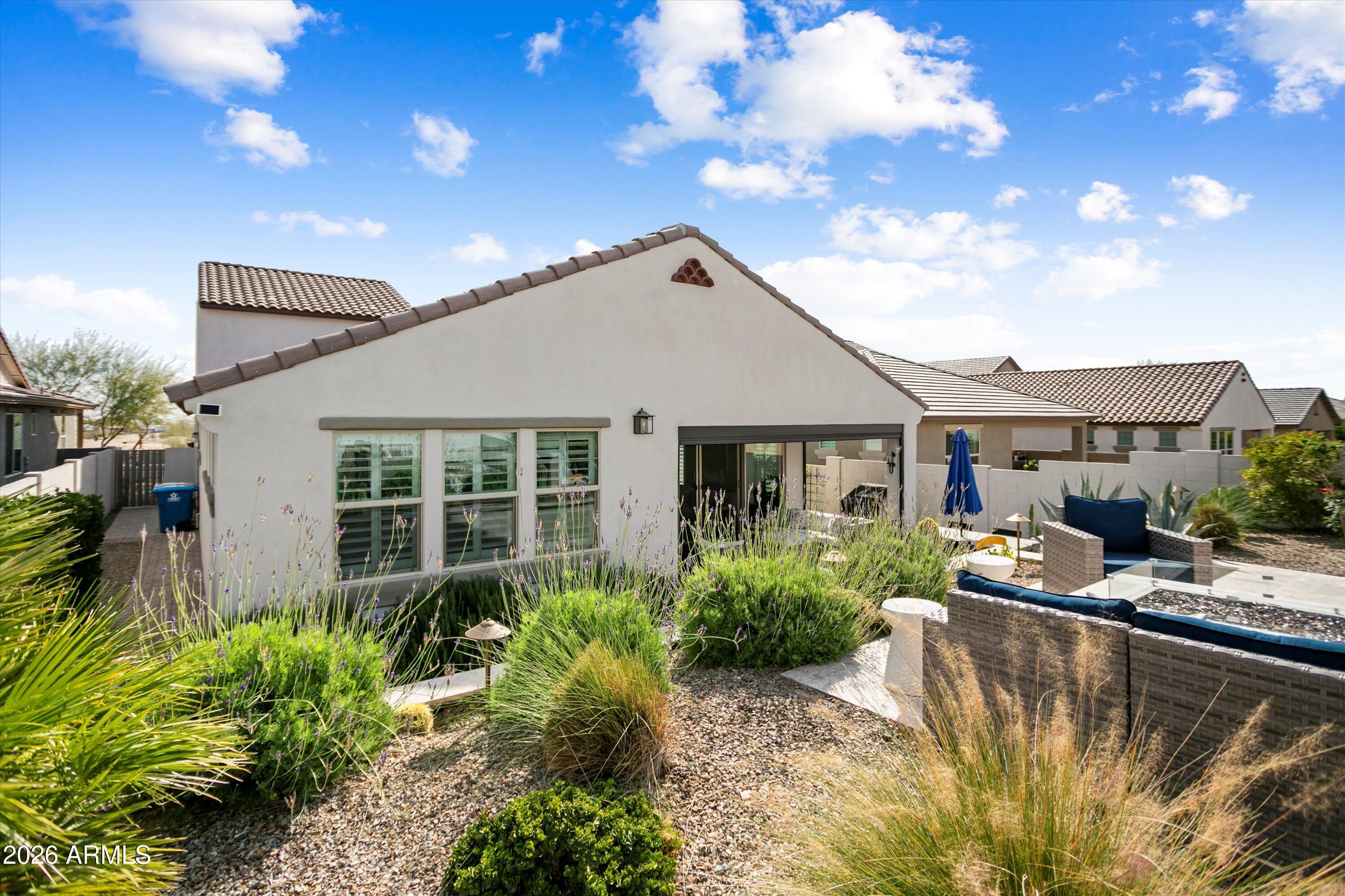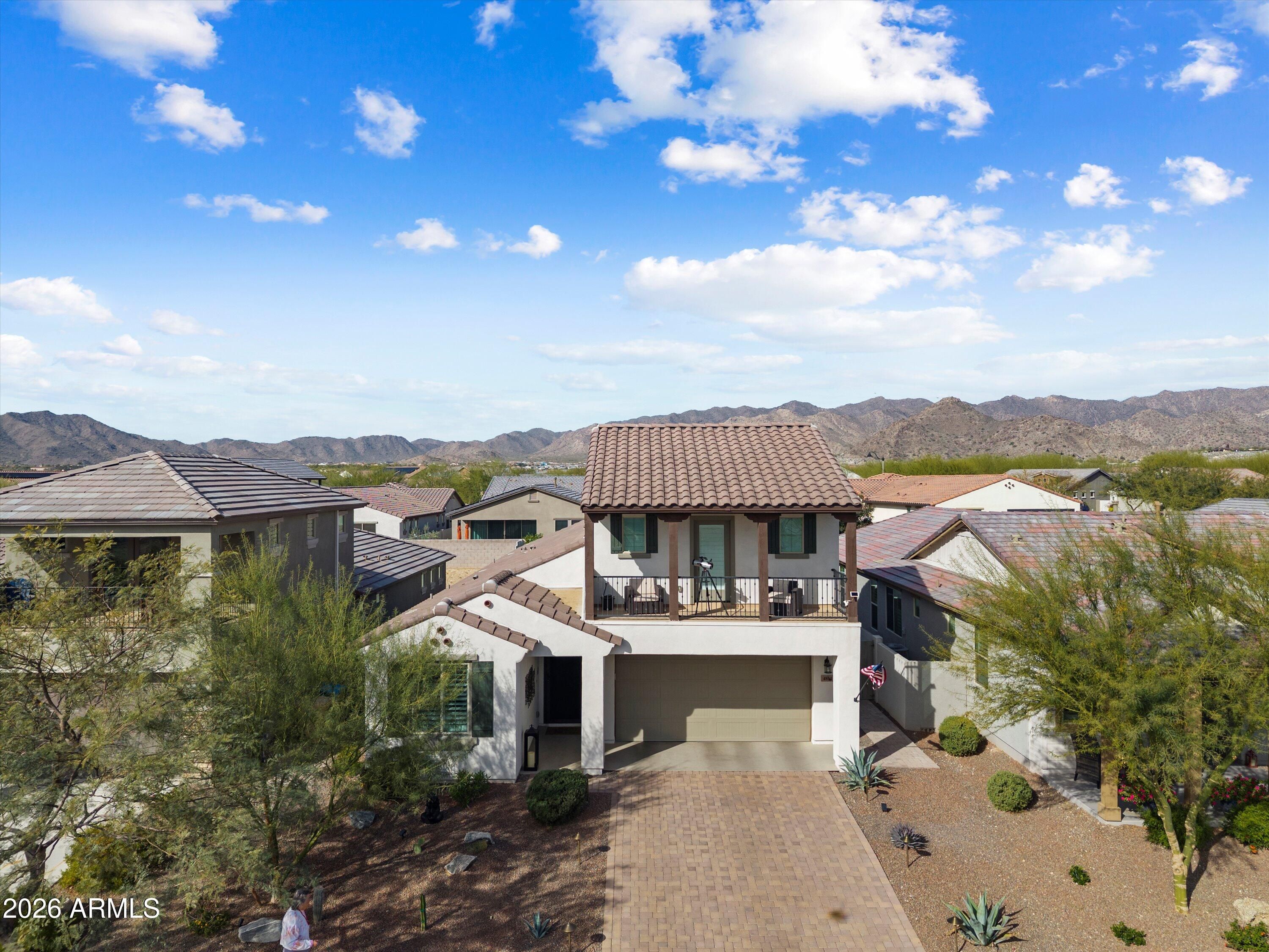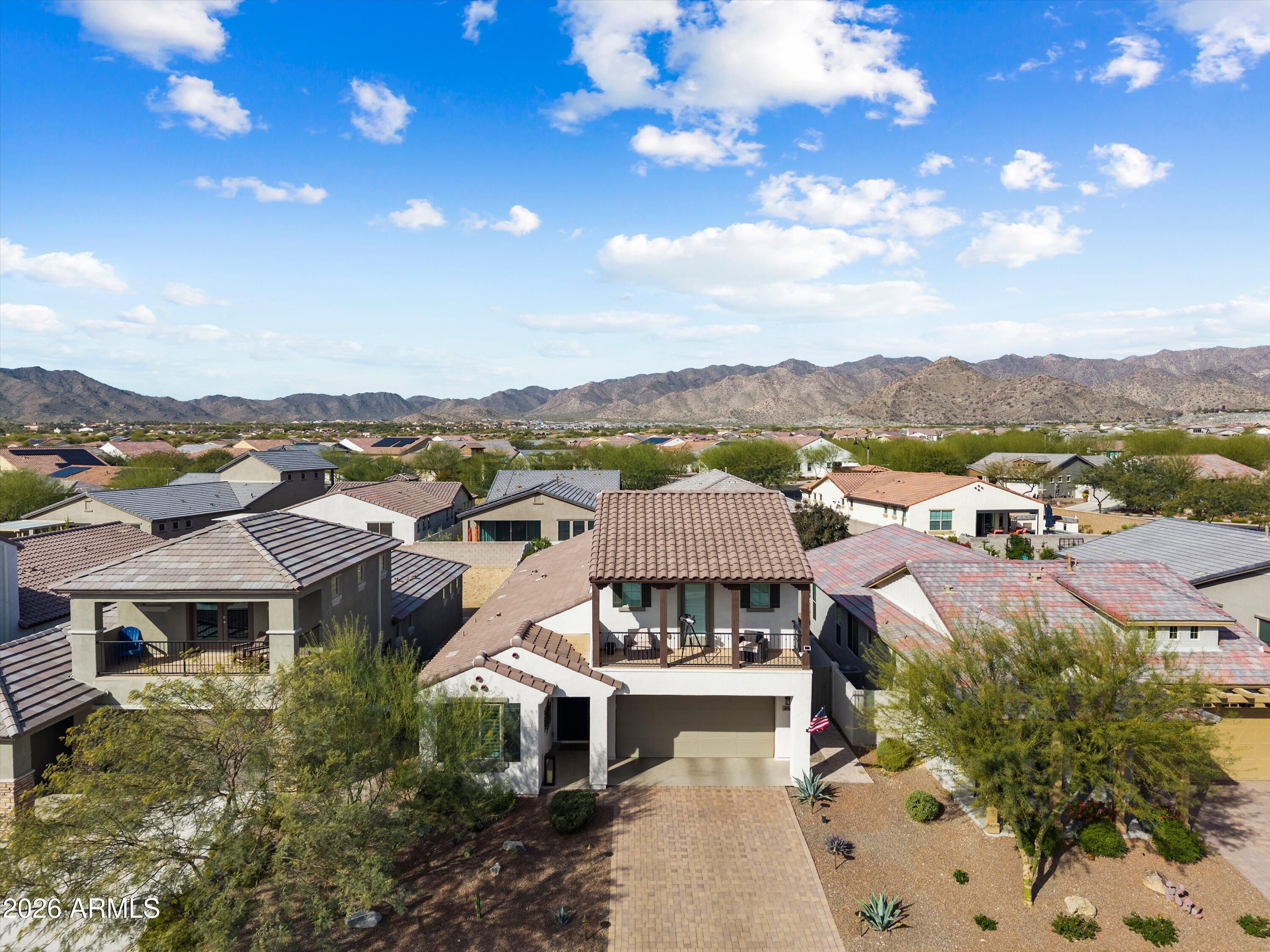 Welcome to your stunning retreat, showcasing breathtaking city lights and mountain views from your private balcony. The highly sought-after Inspire floor plan offers a thoughtfully designed layout with a timeless neutral palette throughout. Extensively upgraded, this home features leathered granite countertops, elegant white cabinetry, top-of-the-line kitchen appliance package with warming drawer , plantation shutters, and designer feature walls. The home is also equipped with an air purifier. The primary suite includes a custom closet system with a built-in linen cabinet for added storage and organization. The private Bonus Room serves as an ideal guest retreat or personal sanctuary, complete with its own entrance, mini split, full bath, upgraded white cabinetry with quart countertops, a large sink, and a private balcony with sweeping views of Phoenix and the Estrella Mountains. Step outside to your backyard oasis, beautifully landscaped with lush foliage and ambient lighting. Relax by the firepit and enjoy the tiered design that enhances both functionality and ambiance. The covered patio is equipped with two motorized sunshades. The garage is equally impressive with epoxy floors and custom storage solutions. If you're looking for an active park look no further Paseo Park is the one!! Live beautifully in Victory at Verrado -- home to The Founders Course and The Victory Course -- where championship golf and resort-style amenities are just outside your door.