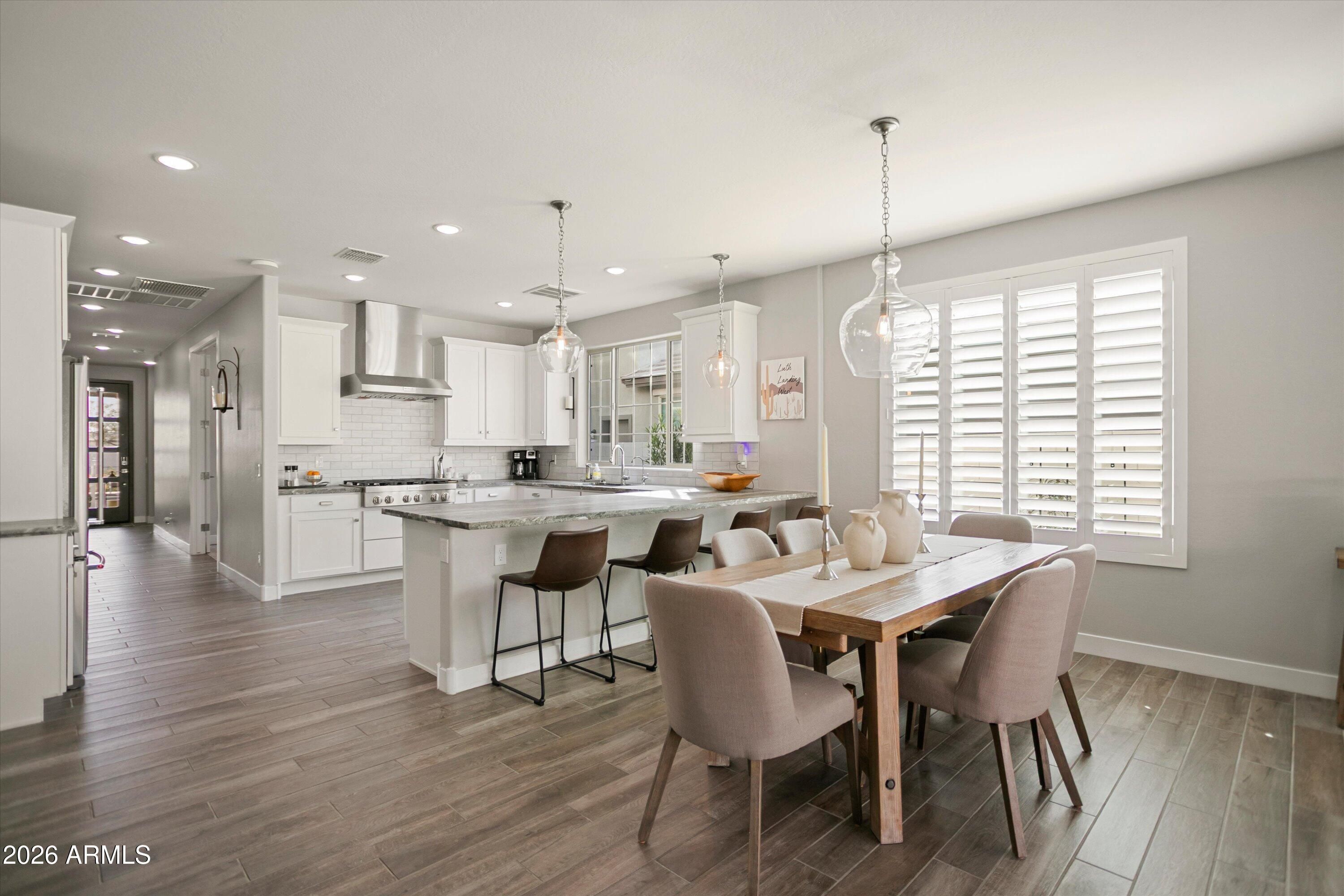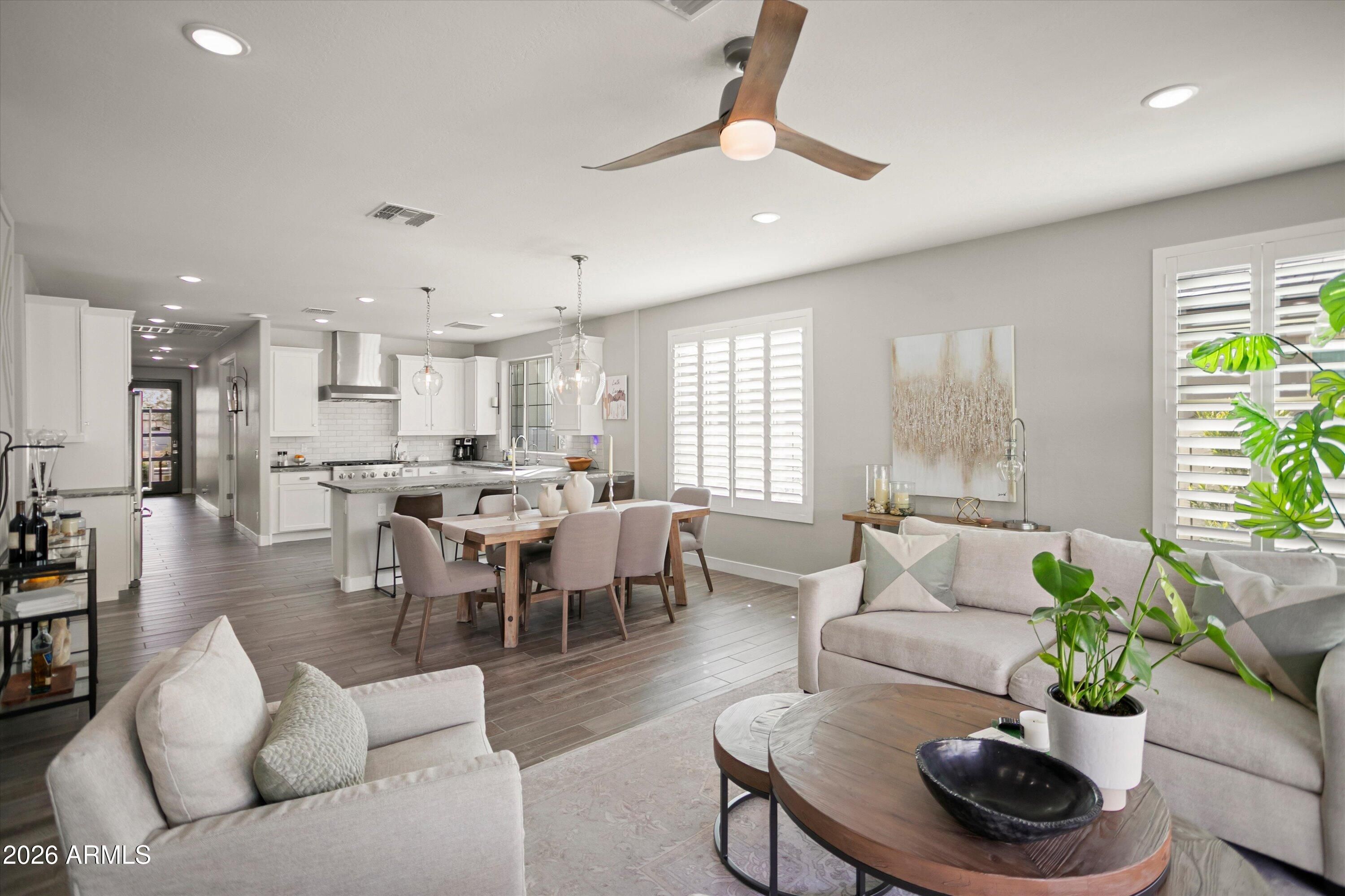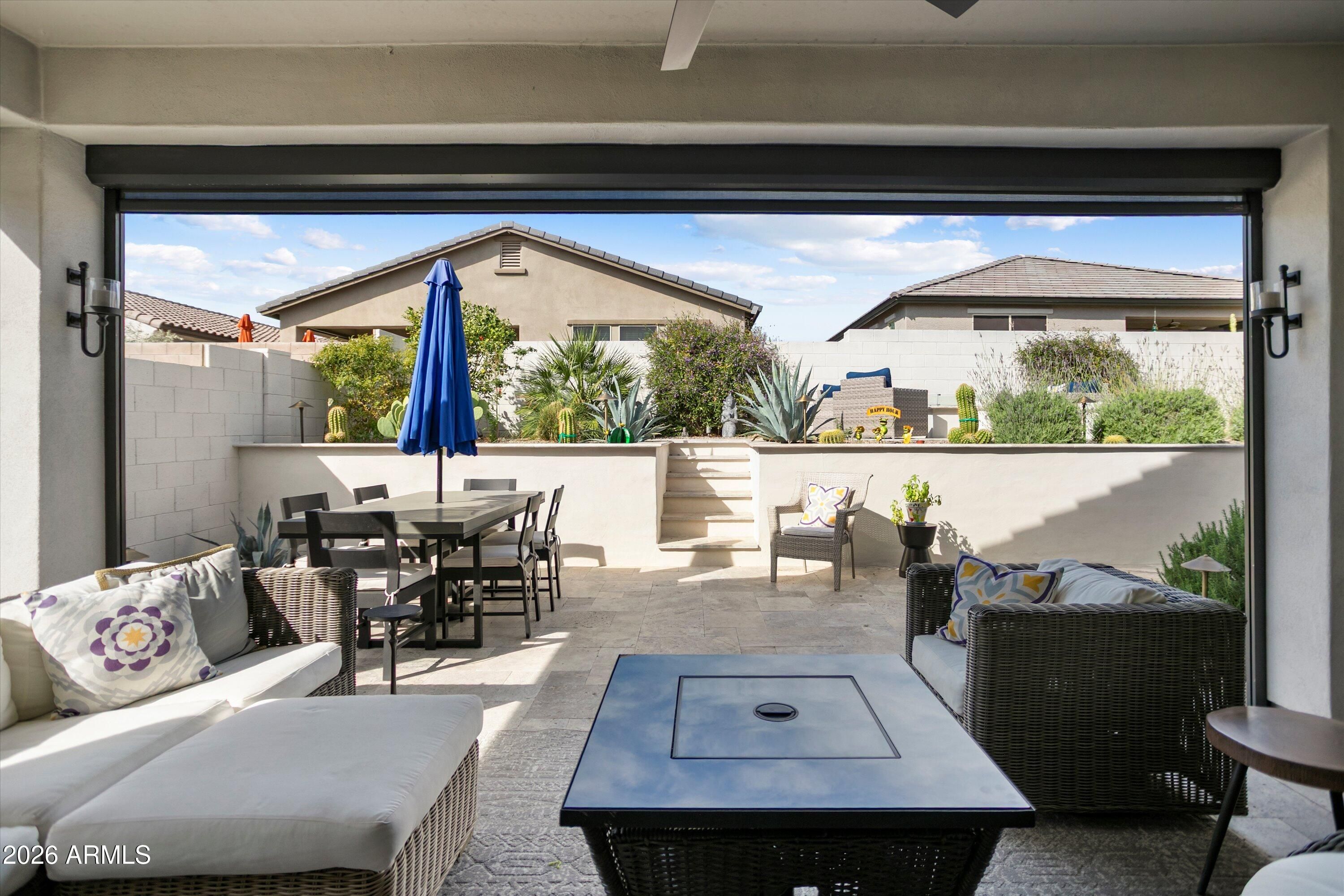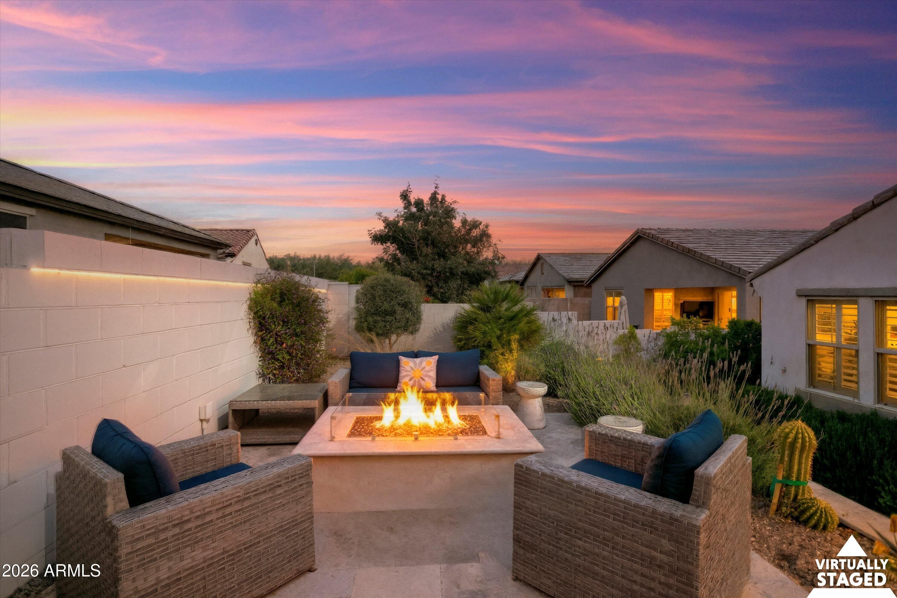 Welcome to your stunning retreat, showcasing breathtaking city lights and mountain views from your private balcony. The highly sought-after Inspire floor plan offers a thoughtfully designed layout with a timeless neutral palette throughout. Extensively upgraded, this home features leathered granite countertops, elegant white cabinetry, top-of-the-line kitchen appliance package with warming drawer , plantation shutters, and designer feature walls. The home is also equipped with an air purifier. The primary suite includes a custom closet system with a built-in linen cabinet for added storage and organization. The private Bonus Room serves as an ideal guest retreat or personal sanctuary, complete with its own entrance, mini split, full bath, upgraded white cabinetry with quart countertops, a large sink, and a private balcony with sweeping views of Phoenix and the Estrella Mountains. Step outside to your backyard oasis, beautifully landscaped with lush foliage and ambient lighting. Relax by the firepit and enjoy the tiered design that enhances both functionality and ambiance. The covered patio is equipped with two motorized sunshades. The garage is equally impressive with epoxy floors and custom storage solutions. If you're looking for an active park look no further Paseo Park is the one!! Live beautifully in Victory at Verrado -- home to The Founders Course and The Victory Course -- where championship golf and resort-style amenities are just outside your door.