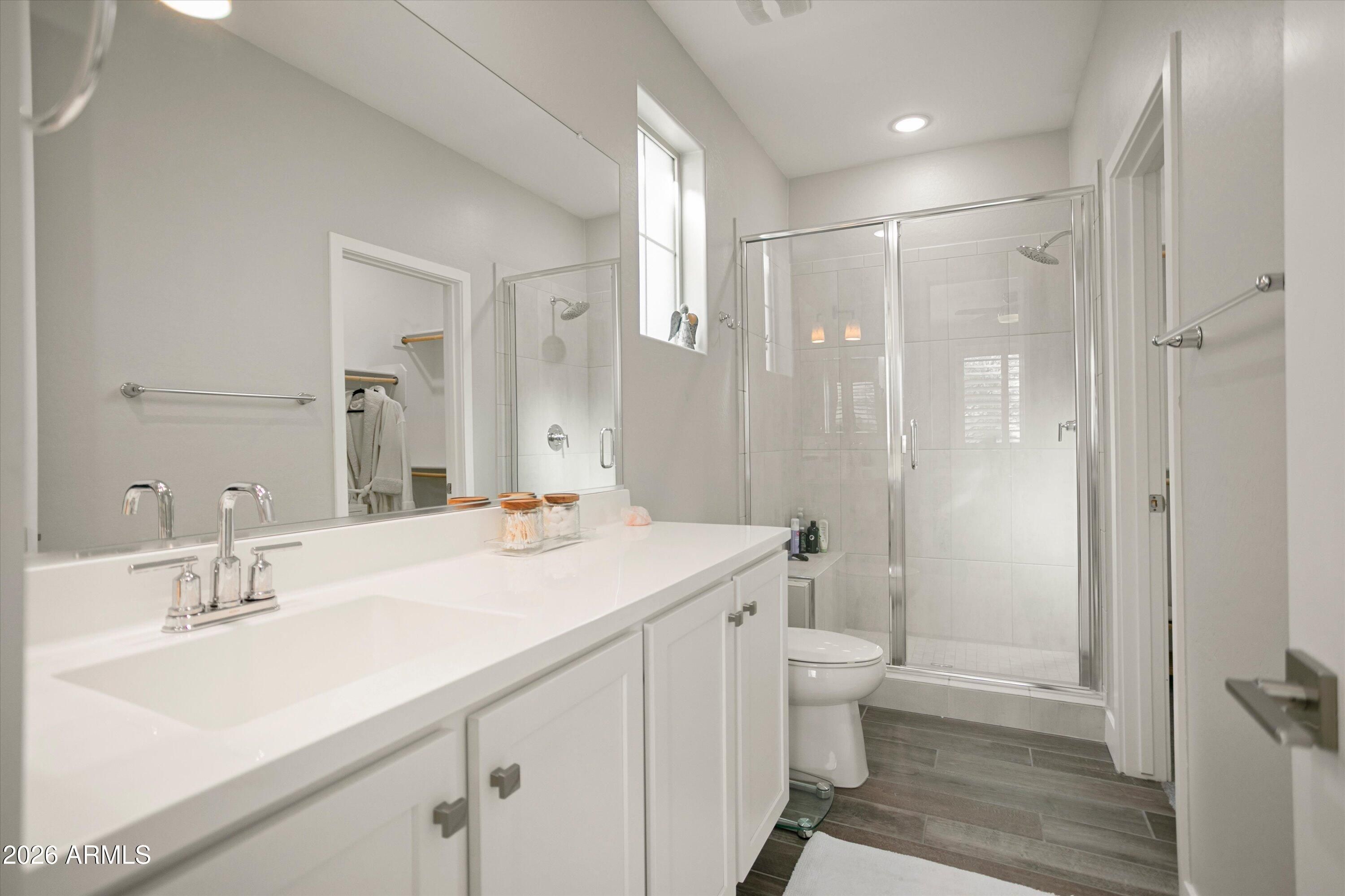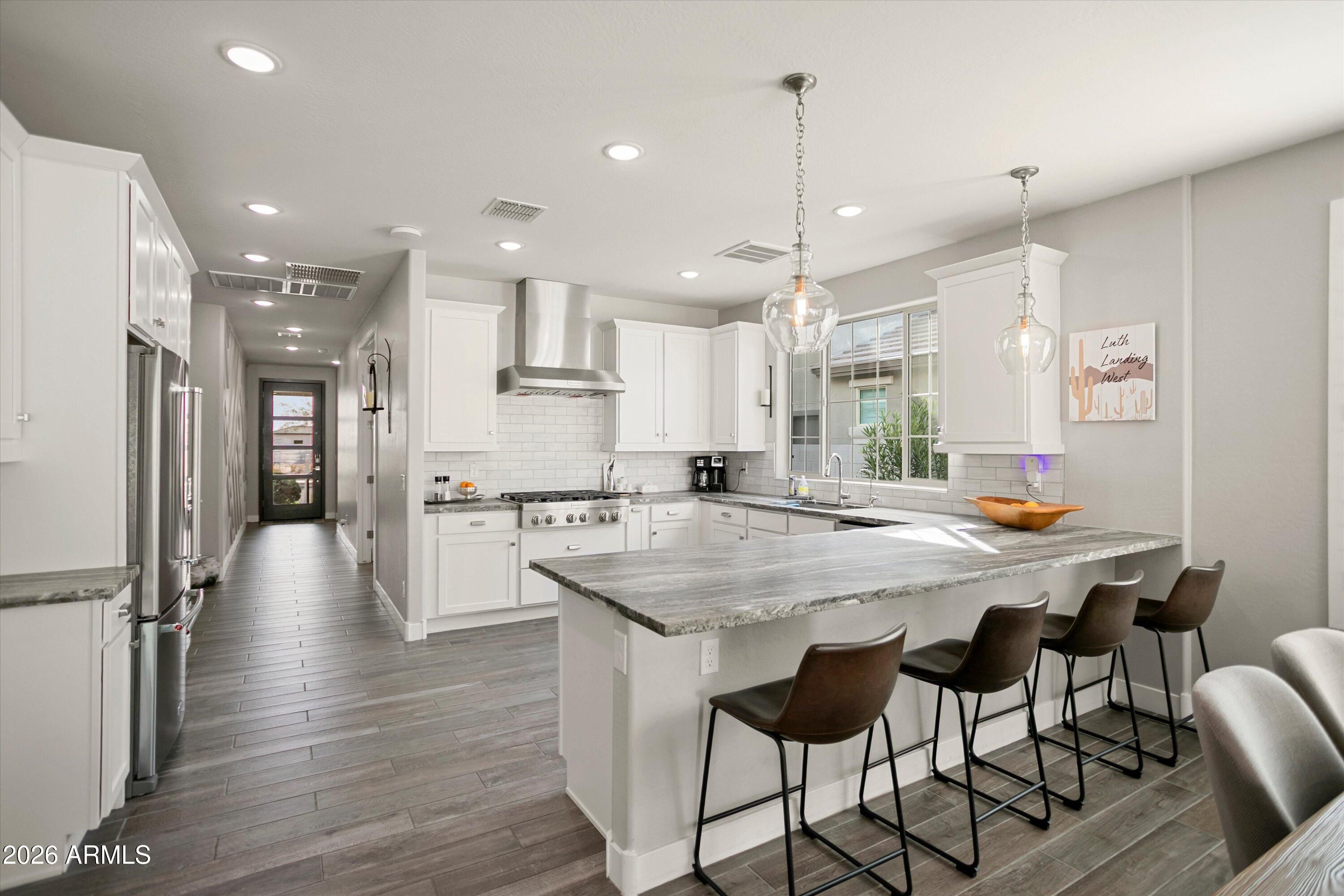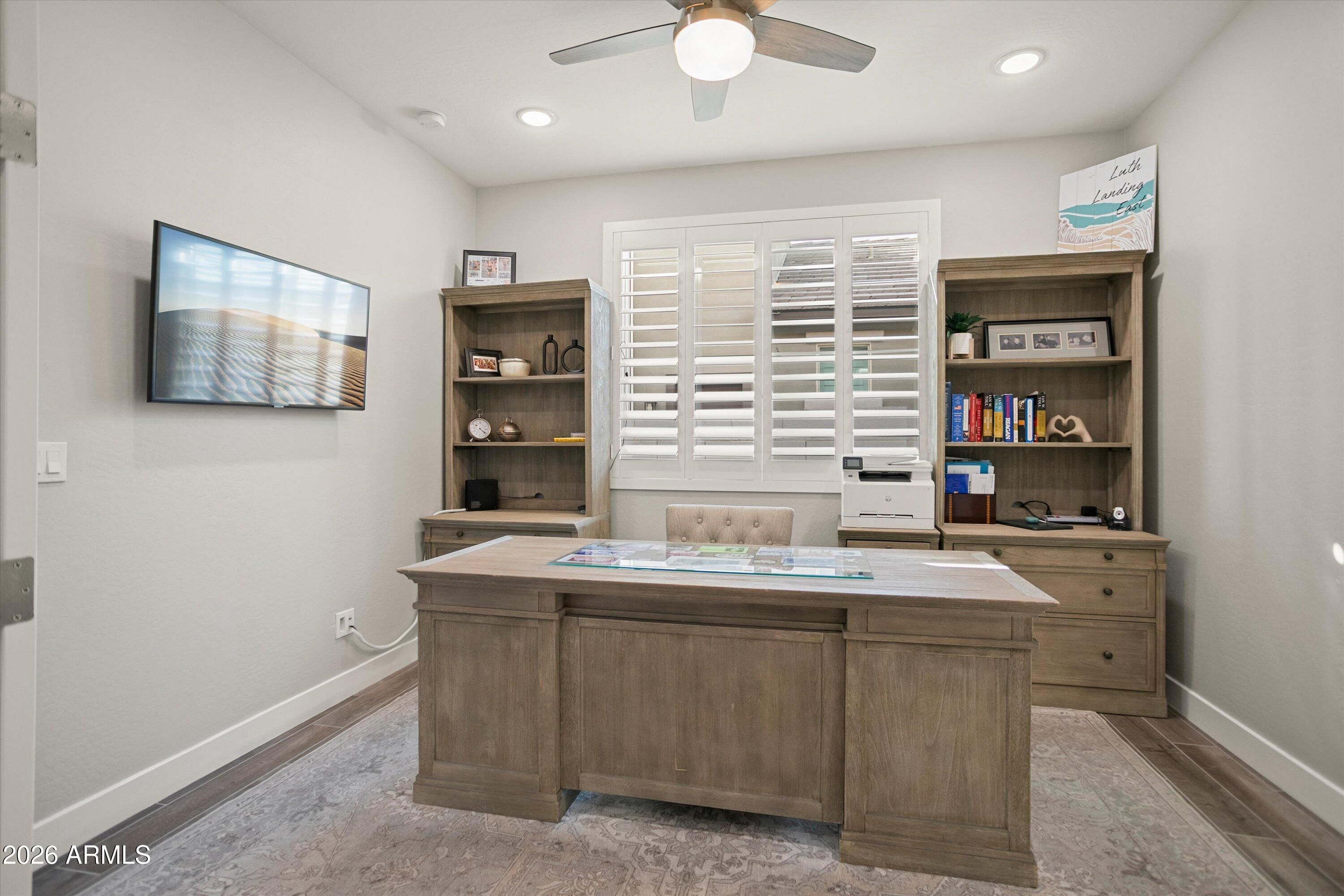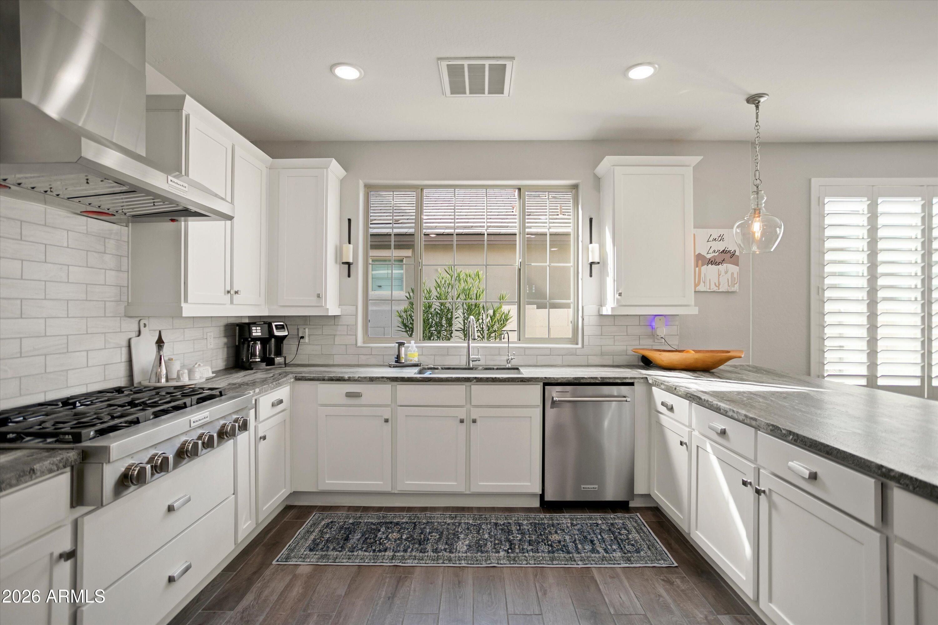 Welcome to your stunning retreat, showcasing breathtaking city lights and mountain views from your private balcony. The highly sought-after Inspire floor plan offers a thoughtfully designed layout with a timeless neutral palette throughout. Extensively upgraded, this home features leathered granite countertops, elegant white cabinetry, top-of-the-line kitchen appliance package with warming drawer , plantation shutters, and designer feature walls. The home is also equipped with an air purifier. The primary suite includes a custom closet system with a built-in linen cabinet for added storage and organization. The private Bonus Room serves as an ideal guest retreat or personal sanctuary, complete with its own entrance, mini split, full bath, upgraded white cabinetry with quart countertops, a large sink, and a private balcony with sweeping views of Phoenix and the Estrella Mountains. Step outside to your backyard oasis, beautifully landscaped with lush foliage and ambient lighting. Relax by the firepit and enjoy the tiered design that enhances both functionality and ambiance. The covered patio is equipped with two motorized sunshades. The garage is equally impressive with epoxy floors and custom storage solutions. If you're looking for an active park look no further Paseo Park is the one!! Live beautifully in Victory at Verrado -- home to The Founders Course and The Victory Course -- where championship golf and resort-style amenities are just outside your door.