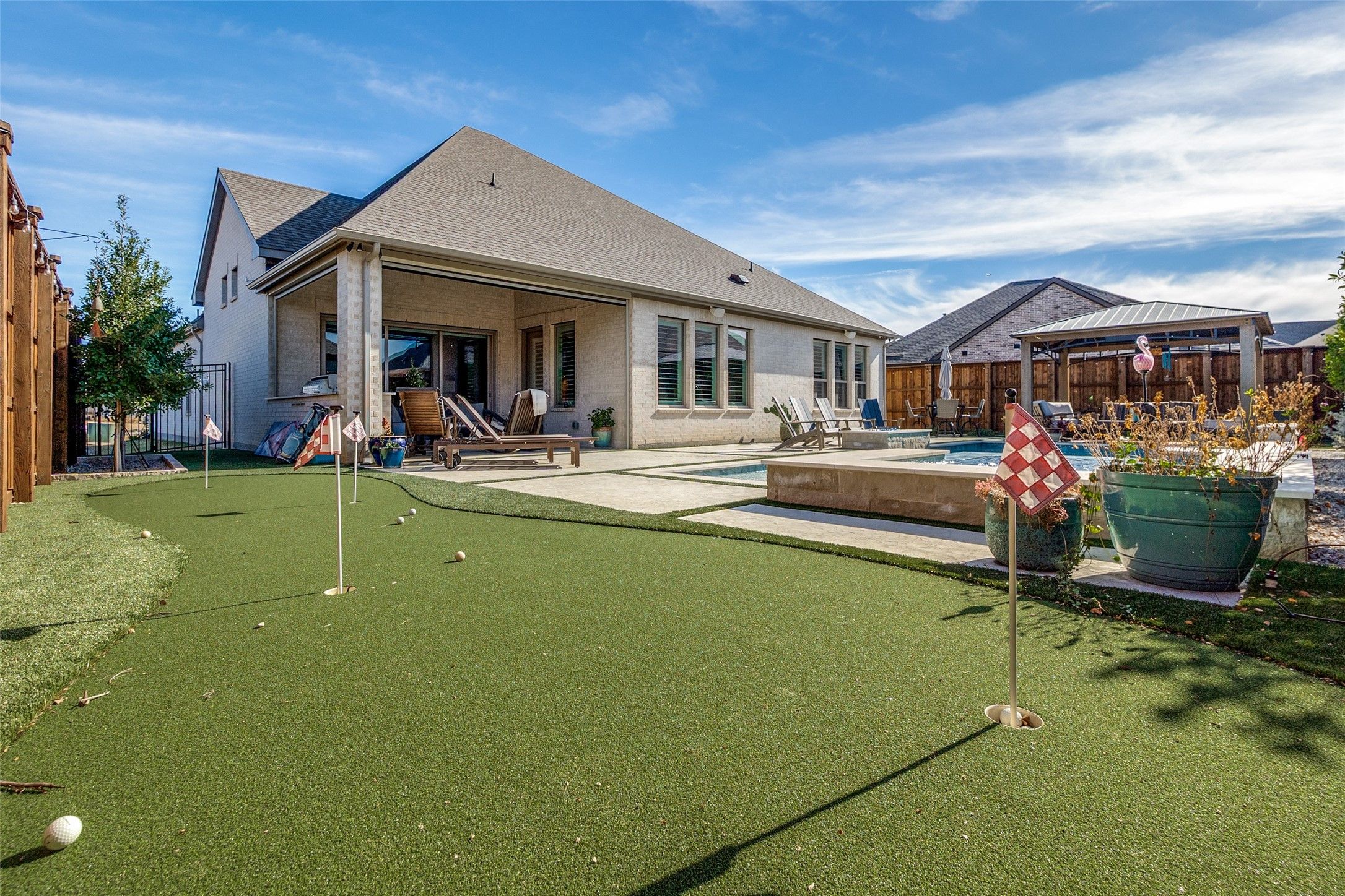 Welcome to an exceptional Drees custom-built residence in The Elements at Viridian, a premier 55+ community offering refined, resort-style living. This stunning home features 3 bedrooms and 3.5 bathrooms, with all bedrooms offering private en-suite baths, along with a front-facing office ideal for work or quiet retreat.The expansive living room showcases electric blinds and pocket doors that open effortlessly to the outdoor oasis, creating seamless indoor-outdoor living. A striking gas fireplace serves as a focal point while offering picturesque views of the patio and resort-style pool.Designed for elevated entertaining, the chef’s kitchen is equipped with double ovens, a large island, and flows beautifully into the dining area overlooking the extraordinary backyard. A dedicated media room with a dramatic barn door provides the perfect space for movie nights or hosting guests.The backyard is truly spectacular, thoughtfully designed as a private resort-style retreat featuring a custom pool with cascading waterfalls, a gazebo for outdoor gatherings, and a private putting green—perfect for relaxation, entertaining, and everyday enjoyment. Residents of The Elements at Viridian enjoy an exceptional lifestyle with access to a community pool, pickleball courts, fitness center, and a vibrant social calendar. Ideally located between Dallas and Fort Worth, with easy access to major highways and just 15 minutes from AT&T Stadium, Globe Life Park, and Arlington’s Entertainment District, this home offers the perfect blend of luxury, comfort, and convenience.A rare opportunity to own a premier Drees-built home in one of Viridian’s most sought-after communities.