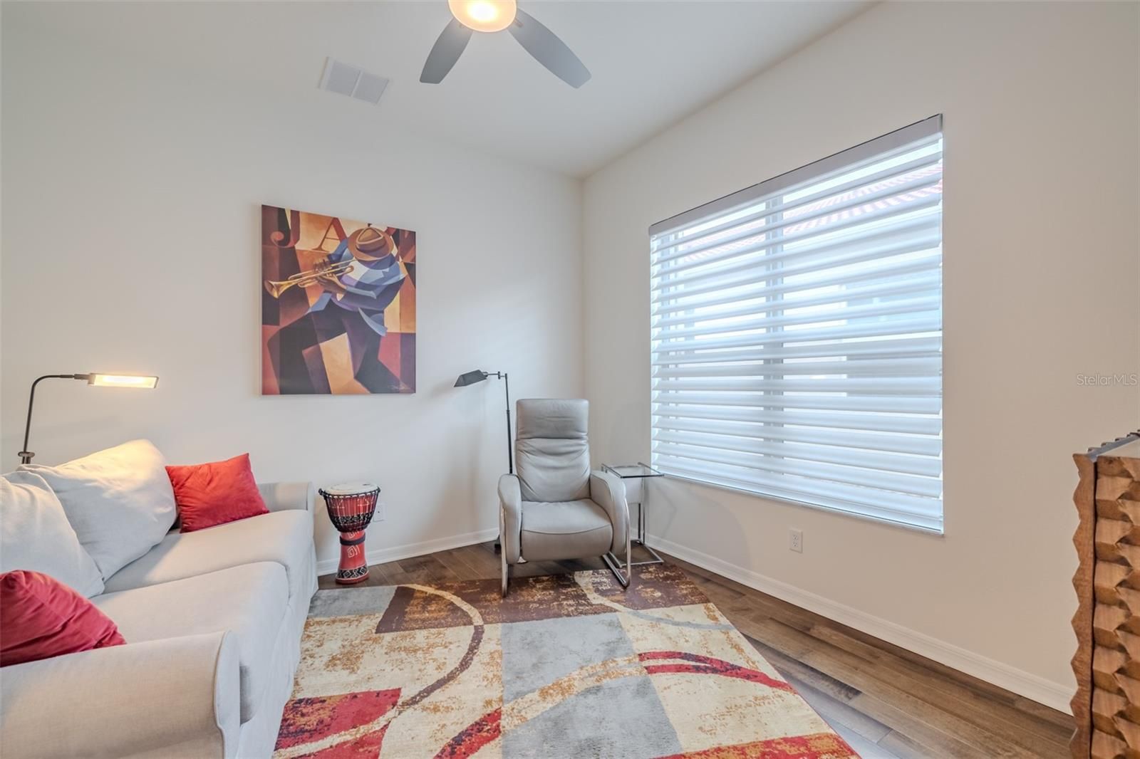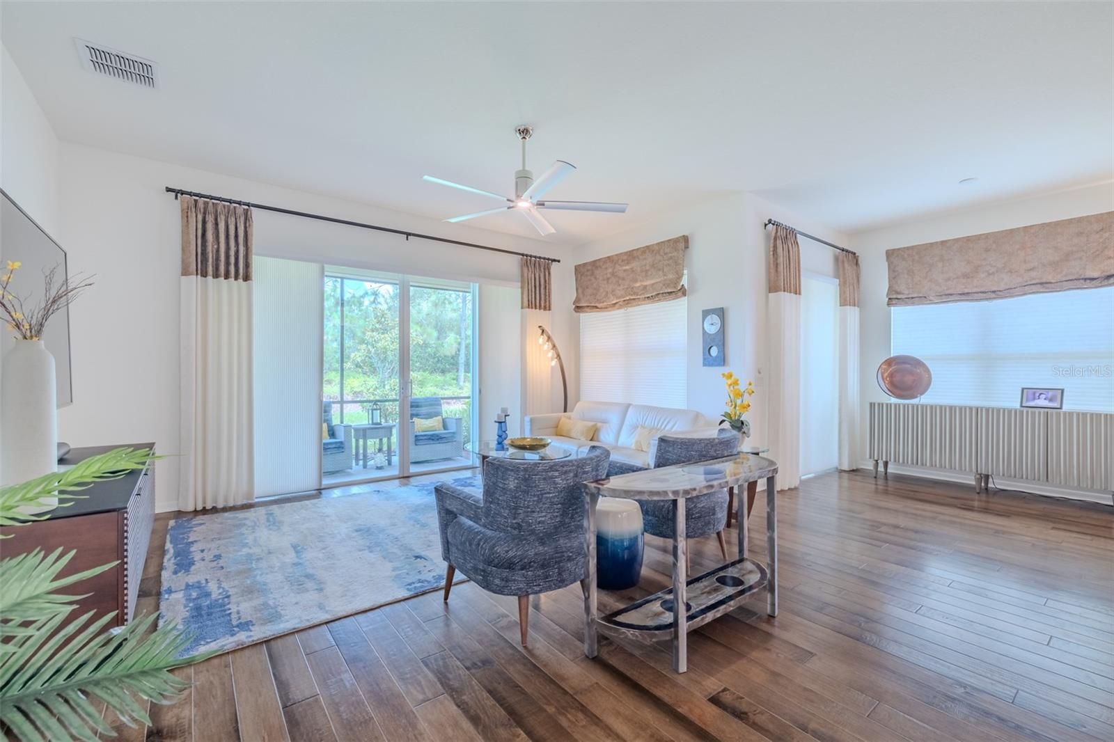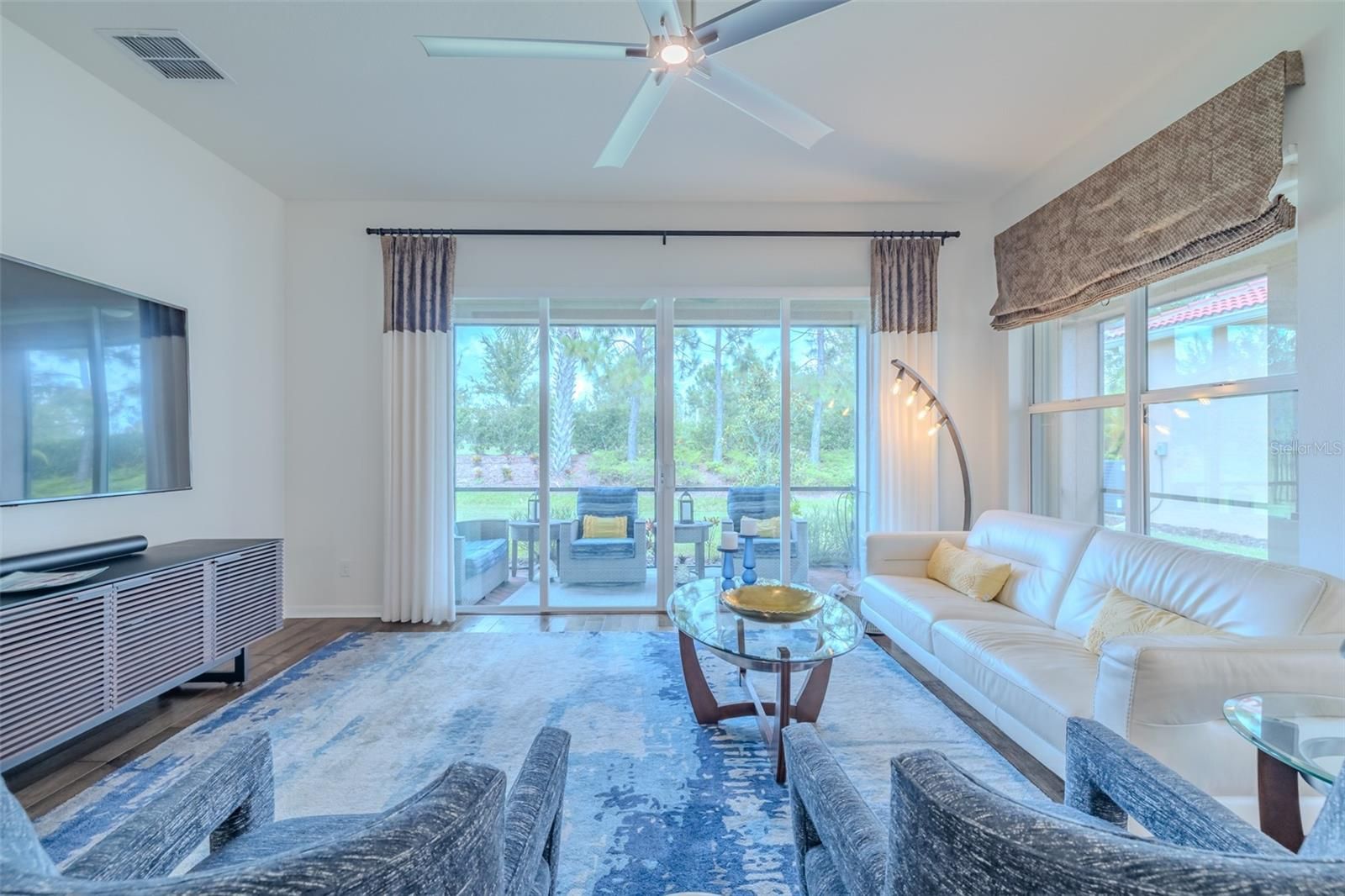 Seize the day! This beautiful GENOVA is now available in Valencia Lakes, Tampa Bay's premier 55+ Active Adult Community. Built in 2018, this GENOVA is 2,107SF under air, and features 2 Bedrooms, an Office, 2 full Bathrooms, an expansive 18’ x 15’ Great Room, Chef's Kitchen, Dining Room, Dinette, an L-shaped screened in Lanai and a 2-car Garage. As you enter, you will be welcomed into a large Foyer with a 14'-to-'15' tray ceiling and gorgeous engineered hardwood flooring throughout, save for the wet areas. Right of the Foyer and at the front of the home is the Guest Bedroom with a double closet and Hunter-Douglas shades offering your guests comfort and privacy. The Guest Bathroom features a with a walk-in shower, granite countertops, and the window has privacy glass. The Laundry Room offers an LG Washer and Dryer, a cabinet utility sink, lower cabinets and storage racks above. Forward of the Foyer is the inviting open floorplan. The Dining Room features a Cosmopolitan Linear chandelier and will comfortably accommodate 8 persons. The Chef’s Kitchen features stainless-steel appliances, a double-sink with a RO faucet, Pantry, 42” solid-wood chiffon white cabinetry capped by granite counters and a glass subway tile backsplash. Just off the kitchen, the Dinette is a great spot to enjoy a leisurely meal and has access to the lanai via two sliding glass doors. The 15’x18’ Great Room features a 60” Minka ceiling fan and it feels expansive and cozy at the same time. Abundant windows and a 4-panel 12’ sliding-glass door leads to the Lanai providing a bright living space when desired and the custom Hunter-Douglas silhouette shades ensure privacy. The sprawling L-shaped Lanai with 2 ceilings fans allows you to bring the outdoors, indoors. The Primary Bedroom with Ensuite Bathroom is at the rear of the home. It is 20’x13’ with a 10’-to-11’ tray ceiling and has three windows, two walk-in closets, one is finished, and a wonderful Ensuite Bathroom. The Ensuite Bathroom features 18”x18” porcelain tile on the diagonal, separated vanities with granite counters, a Roman Bathtub, a large Walk-In Shower and a Water Closet for the Commode. The home’s interior has been freshly painted throughout. The 2-car Garage has exquisite epoxy flooring, an insulated door powered by a quiet belt-drive opener, a 4’x8’overhead storage racks and three additional wall-mounted storage racks. Interior environmental comforts are assured by a RUUD HVAC (2021). The exterior features Accordion Hurricane Shutters on all openings, and whole-home Gutters. Valencia Lakes is an amazing community that has a 40,000SF Clubhouse offering entertainment shows, dances, myriad clubs, a state-of-the heart 24/7 Fitness Center, resort-style pool, lap pool, two multi-purpose fitness studios, card rooms, craft rooms, pickleball, tennis and much more. Conveniently located near two new hospitals, the brand new Moffit Cancer Center, Downtown Tampa, Tampa airport, and a short drive to Disney, Cruise Ports, Sarasota and some of the best beaches in the country! Seize the day and begin living your idyllic life in this special home.
