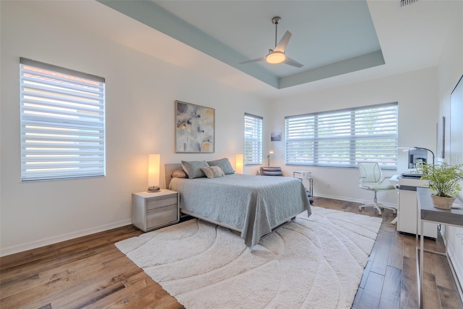 - Ceiling Fan(s), Eat-in Kitchen, High Ceilings, Open Floorplan, Main Level Primary, Solid-Wood Cabinets, Split Bedrooms, Stone Counters, Tray Ceiling(s), Walk-In Closet(s), Window Treatments