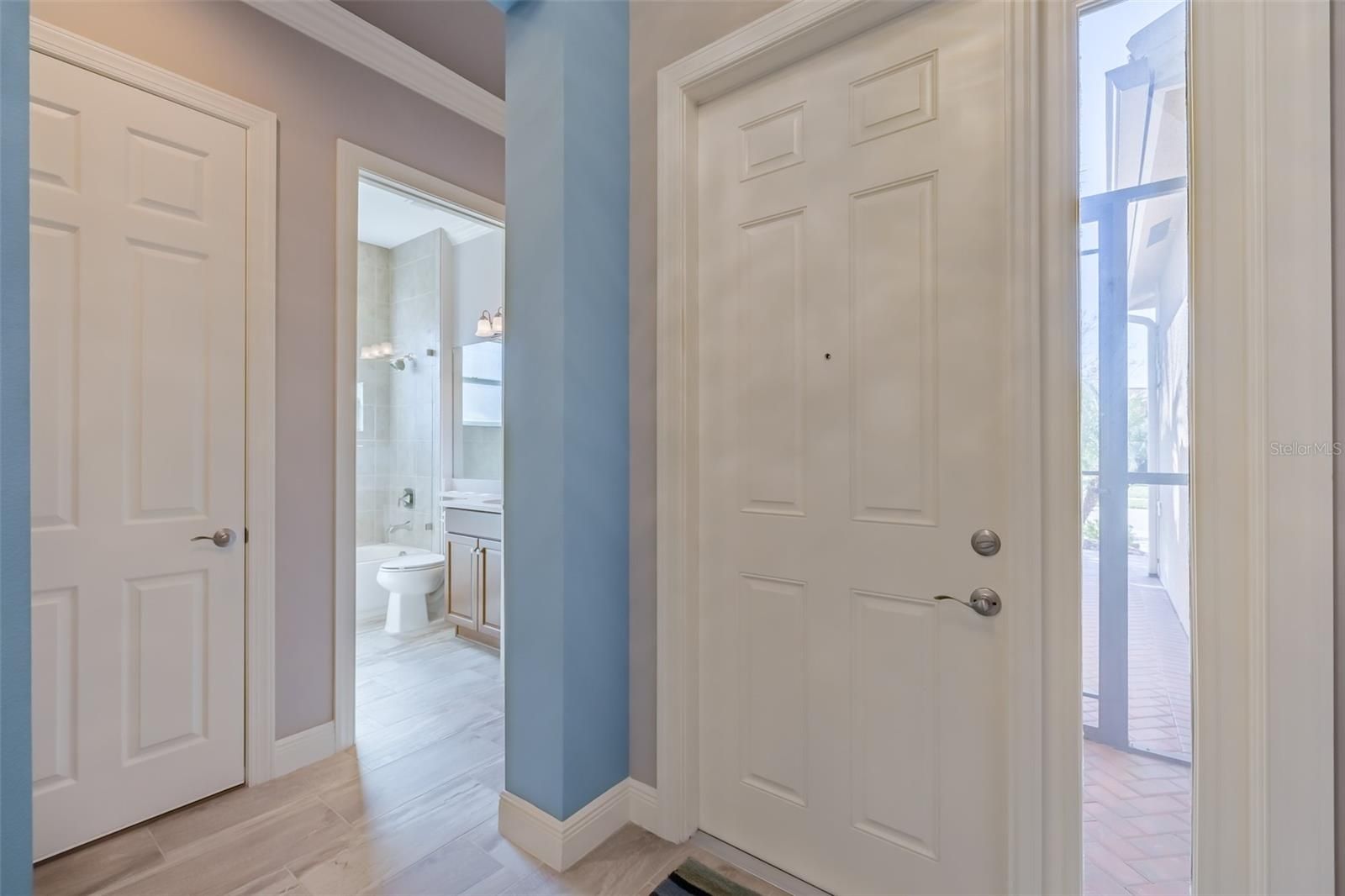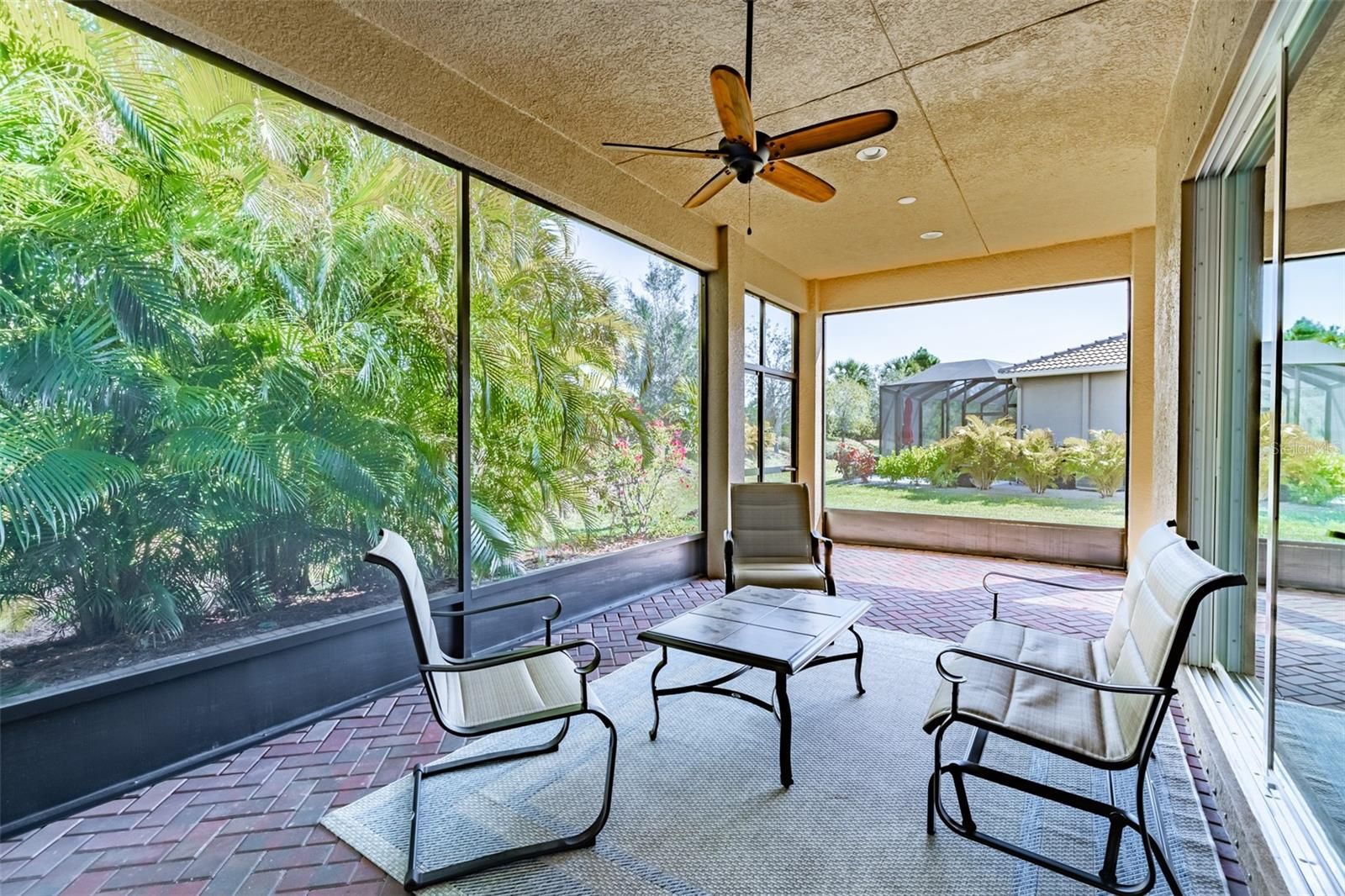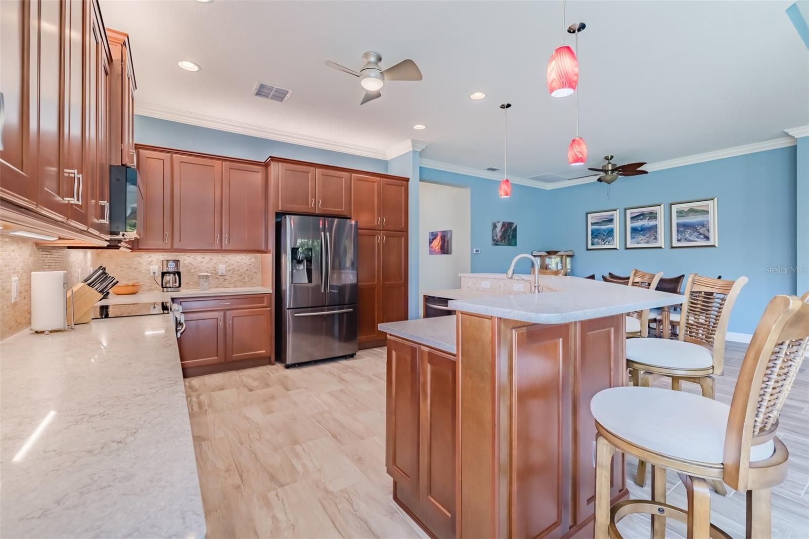 Make your dream your reality in this beautifully upgraded BARBADOS model located in Valencia Lakes, Tampa Bay’s premier 55+ active adult community. Built in 2018 by GL Homes, this well-maintained home offers 2,271 SF with 3 bedrooms, 2.5 baths, formal dining, great room, dinette, covered lanai, and an exceptional 3-car tandem garage. The exterior features a barrel tile roof, whole-house gutters, hurricane shutters, and a full-width paver driveway. The upgraded garage boasts 10’ ceilings, two overhead storage racks, a custom floor-to-ceiling storage rack, and luxe epoxy flooring—perfect for hobbies or prized vehicles. Inside, the welcoming foyer showcases a dramatic 13-14’ tray ceiling with designer pendant lighting. Bedroom 2 offers comfort and privacy at the front of the home with a ceiling fan, recessed lighting, plantation shutters, and a large window for natural light while Bedroom 3—currently used as an office—features double French doors, porcelain tile, walk-in closet, and custom lighted wall unit. The spacious primary suite includes dual walk-in closets, recessed lighting, ceiling fan, plentiful windows, plantation shutters and a luxurious ensuite bath with separate quartz vanities, Kohler fixtures, a large glass walk-in shower with bench, linen closet, and private water closet with KOHLER Sterling comfort-height commode. The dining room is perfect for entertaining, seats eight and the chef’s kitchen features cherry-stained solid maple cabinetry, 42” uppers with under/over lighting, pull-out shelving, quartz counters an additional RO faucet, DELRAY brick mosaic backsplash, and a large island with seating for four. The great room impresses with a 10’-11’tray ceiling, ceiling fan, recessed lighting and 14’ sliders to the roomy private L-shaped lanai which is pre-plumbed for an outdoor kitchen and surrounded by natural greenery - a great way to start and end your day! Additional highlights include 24” x 12” STRATA tile in main areas, crown molding throughout, plantation shutters, and the windows feature JT Home Design valences adorning pull-down blinds, a spacious laundry room with abundant cabinetry, counter top and laundry sink. Major system upgrades include a 15 SEER HVAC with UV light and enhanced filtration, Culligan water softener, 50-gallon water heater with expansion tank, and whole-home surge protection. This move-in ready upgraded home delivers the quality and lifestyle discerning buyers expect located in Valencia Lakes, a highly desired 55+ community that offers exceptional amenities, including live shows, over 100 clubs, full size softball field, pickleball courts, Har-Tru Tennis Courts, Bocce Ball, Shuffleboard, Basketball half court, miles of walking paved paths, card rooms, poker & billiard rooms, craft room (pottery, glass, painting, wood working and more), a community garden, dog park, resort pool, resistance pool, lap pool, sauna/steam rooms, 24/7 State of the Heart 5000 sq ft fitness center, professional fitness classes, and still more! Valencia Lakes is close to downtown Tampa, Sarasota, St. Petersburg, and offers excellent shopping and exceptional medical services, and some of Florida’s finest beaches. Seize this day and begin to live your idyllic life today.