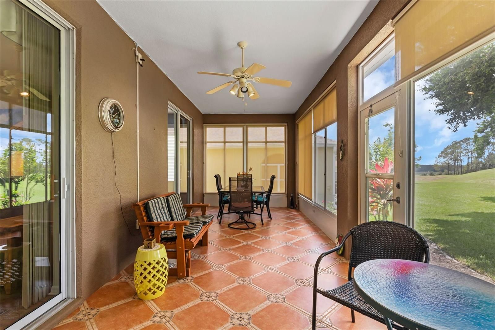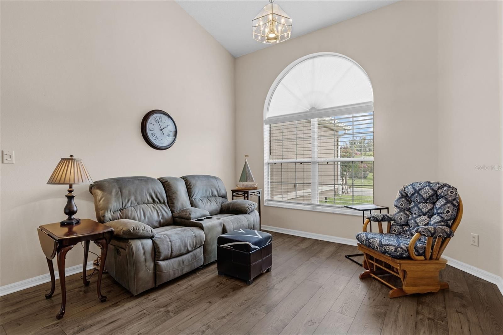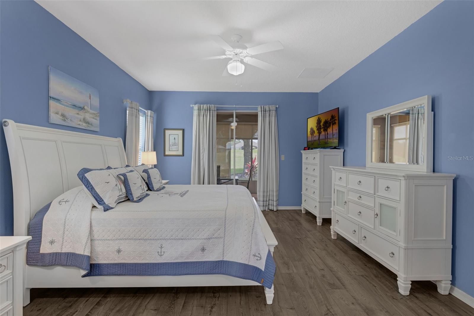 SELLER MOTIVATED & PRICE REDUCED, ON THE GOLF COURSE and GREAT CURB APPEAL are only three of the reasons you will love this well-maintained Monterey model! Some of the UPGRADES/UPDATES INCLUDE ENGINEERED HARDWOOD FLOORS, EXTERIOR PAINT and HIGH KNOCKDOWN CEILINGS. The GREAT ROOM COMBINES LIVING AND DINING SPACES and the KITCHEN has 42” CABINETS, SOLID-SURFACE COUNTERS, and an EAT-IN SPACE in a cozy bay of windows. There are HIGH, VAULTED CEILINGS and CEILING FANS strategically placed throughout the home. The MAIN BEDROOM has a spacious WALK-IN CLOSET, and an EN SUITE BATHROOM with BEAUTIFUL GRANITE, COMFORT-HEIGHT SPLIT VANITIES, a SHOWER, a SOAKER TUB, A SEPARATE WATER CLOSET and a WINDOW. The home has a SPLIT BEDROOM floorplan and there are TWO GUEST BEDROOMS, or use one for an office. The guest bath includes a TUB/ SHOWER COMBO, a sink with a SOLID-SURFACE COUNTER, and a window. Enjoy GOLF VIEWS from the SPACIOUS, BEAUTIFULLY-TILED, screened-in LANAI with SLIDING WINDOWS. The OVERSIZED 24X26 GARAGE has a pull-down for ATTIC ACCESS and an EPOXY FLOOR SURFACE. ROOF was replaced in 2021 and a new HVAC SYSTEM was installed in 2020. Make an appointment today to see this lovely home. Located in the premier GOLF COURSE, 55-plus community of THE PLANTATION AT LEESBURG, residents enjoy a full range of amenities, two gated entrances with attendants, two (2) golf courses, a restaurant and grill, tennis, pickleball, softball, three (3) outdoor pools, secured RV storage, bocce, shuffleboard, fitness rooms, a library, arts and crafts, billiards, catch-and-release fishing, and a variety of clubs