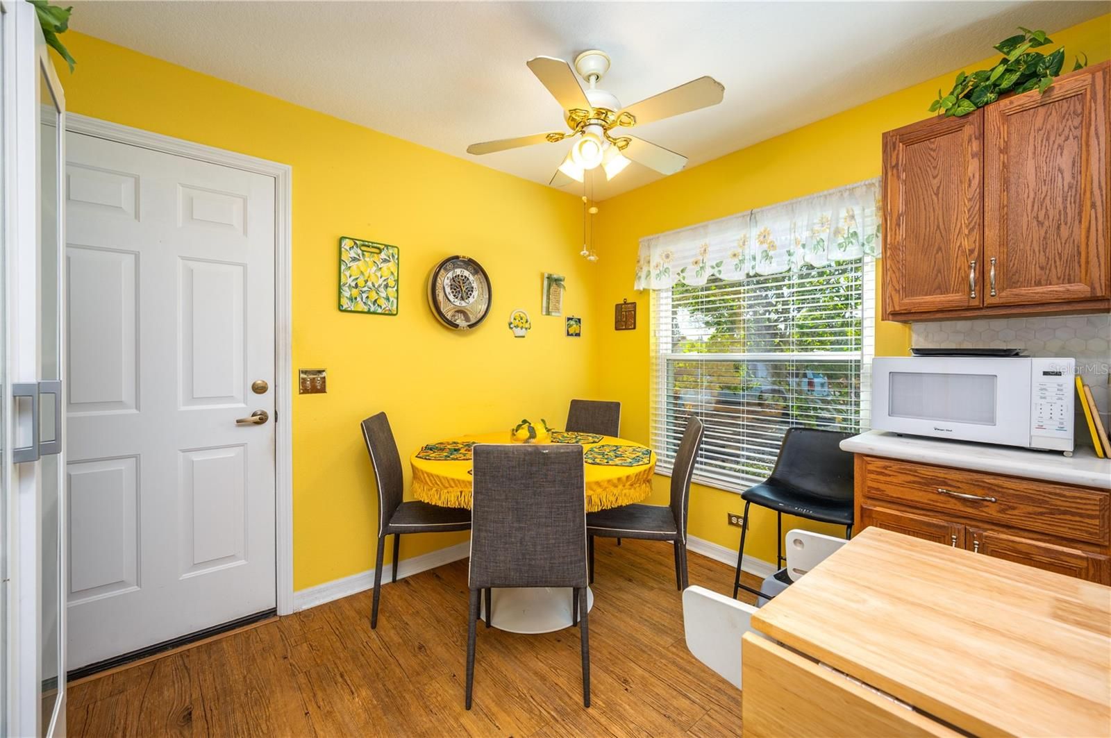 - Ceiling Fan(s), Eat-in Kitchen, High Ceilings, Living/Dining Room, Solid-Wood Cabinets, Split Bedrooms, Thermostat, Walk-In Closet(s), Window Treatments