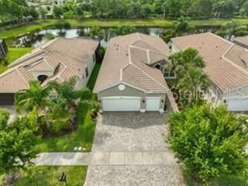 One or more photo(s) has been virtually staged. Experience the epitome of craftsmanship and elegance in this GL Homes Palazzo Model. The custom-designed landscaping welcomes you to a screened entry, leading into a charming foyer. Just off the entry, behind double French glass doors, lies a fully furnished custom home office, complete with built-in bookcases, a two-person desk, and three large windows. All of the windows and doors are impact-resistant and hurricane rated for up to 150 mile per hour winds which means that one never has to put up or take down windows, screens or shutters. The expansive living room boasts a tray ceiling with crown molding, adjustable recessed lighting, and the impact-resistant hurricane rated sliders that open to a stunning screened lanai with views of the tree-lined lake. The newly upgraded kitchen is a chef's dream, featuring quartz countertops with bronze glass tile backsplashes, two-tone Tuxedo-style custom cabinetry, soft-close drawers, pull-out pantry shelves, under/over-cabinet lighting, a GE Profile refrigerator, an induction glass cooktop stove, a convection oven, an outside-vented convection/microwave oven, and an oversized sink with a Moen spray faucet. New porcelain tile flooring extends through the breakfast nook, kitchen, and adjoining dining room. The master suite offers an 11-foot trayed ceiling with recessed lighting, a ceiling fan, three bay windows overlooking the lake, a locking door to the lanai, and two custom-designed walk-in closets. The primary bathroom features a large walk-in, fully tiled shower with dual shower heads, a bench-style seat, a built-in toiletry nook, two grab bars, spacious quartz countertops with dual vanities, built-in cabinetry, wall-to-wall mirrors with designer lighting, and an enclosed toilet area. All toilets are comfort height. The first guest bedroom includes a built-in queen-sized Murphy bed/sofa combo, while the second guest bedroom is spacious enough for a queen bed. The guest bathroom offers a tub/shower combo and quartz countertops. The powder room features a quartz-topped vanity and a linen cabinet with pull-out drawers. Engineered hardwood flooring graces the foyer, hall, office, living room, master bedroom, and both customized master closets. Hunter Douglas powered shades or plantation shutters adorn every impact-resistant hurricane rated window and the exterior door, with powered Kevlar hurricane screens protecting the lanai. The laundry room is equipped with an LG front-loading washer and dryer, custom cabinets, and shelving. The HVAC system includes humidity controls and a UV air purification system, while the 2024 50-gallon hot water heater comes with a 10-year warranty. The original builder's warranty is transferable. Additional features include an Aquarius brand water softener system, reverse osmosis filtration in the kitchen and master bath, rain gutters throughout, insulated garage doors, and two smartphone-powered 4x9 ft, 350-pound capacity overhead storage racks. The HOA fee in this 55+ community covers irrigation and lawn care. An installed ADT security system ensures peace of mind. Valencia Lakes residents enjoy a state-of-the-art fitness center, resort-style swimming pool, spa services, and a soon-to-be-added restaurant and cafe. Outdoor amenities include tennis, pickleball, shuffleboard, bocce ball courts, beautifully landscaped walking and biking trails, a dog park, lakes for fishing and boating, and much more.
