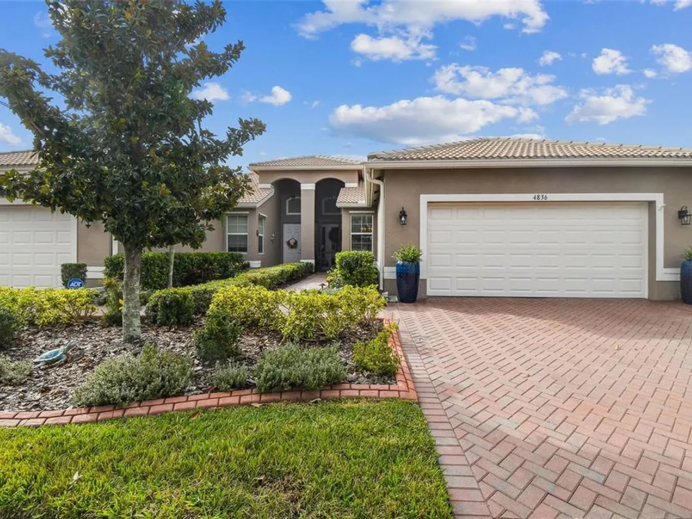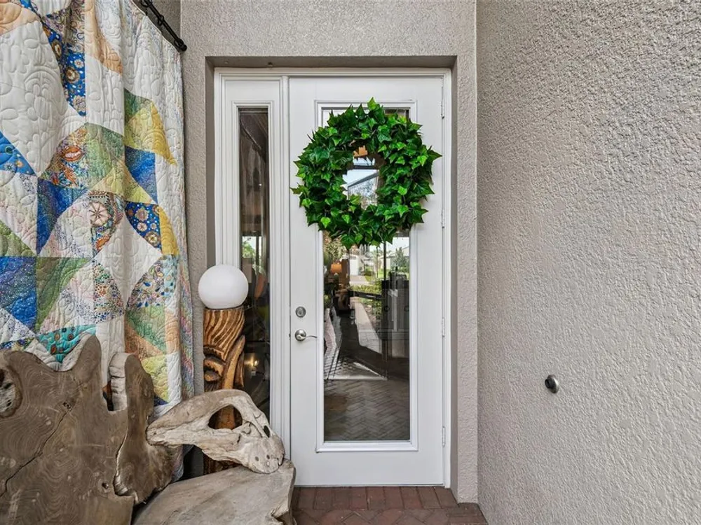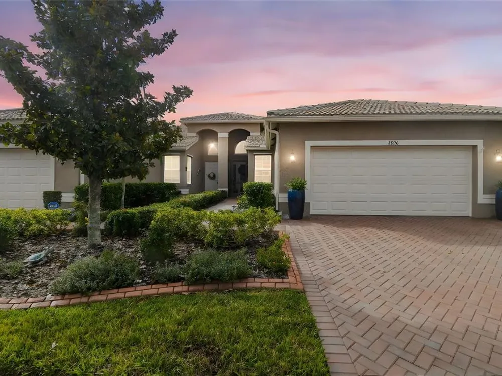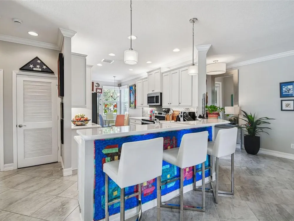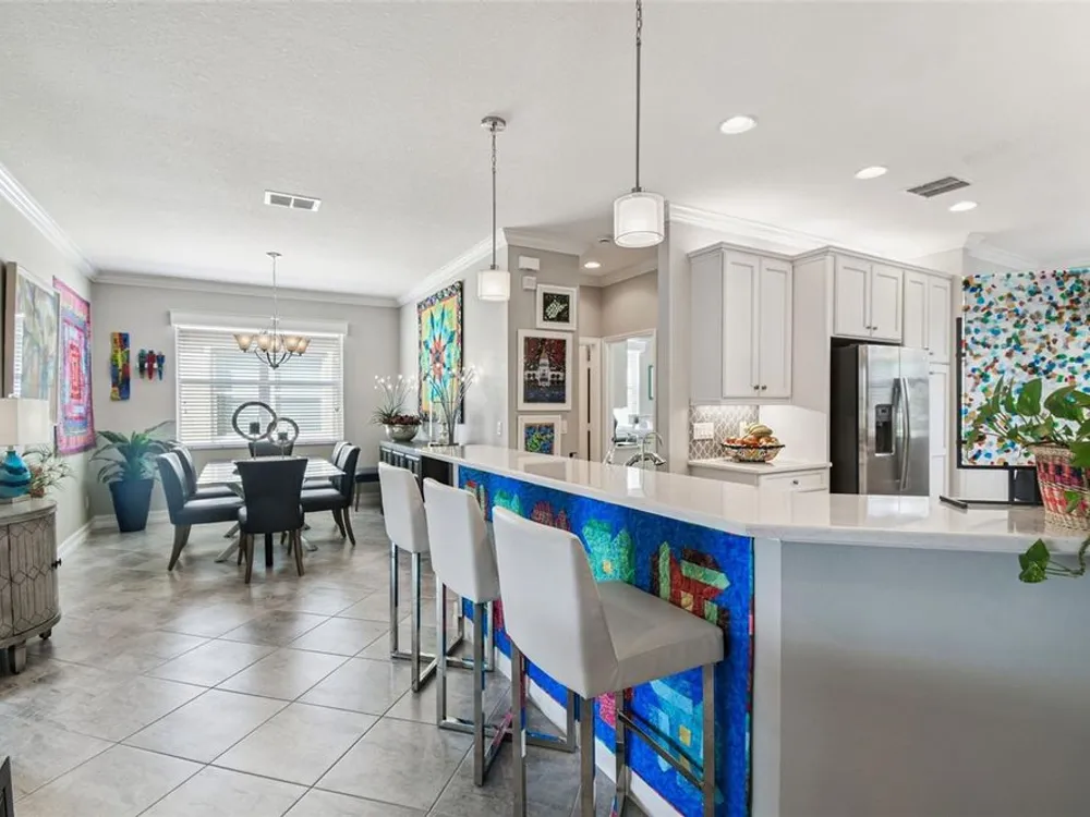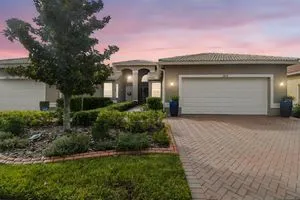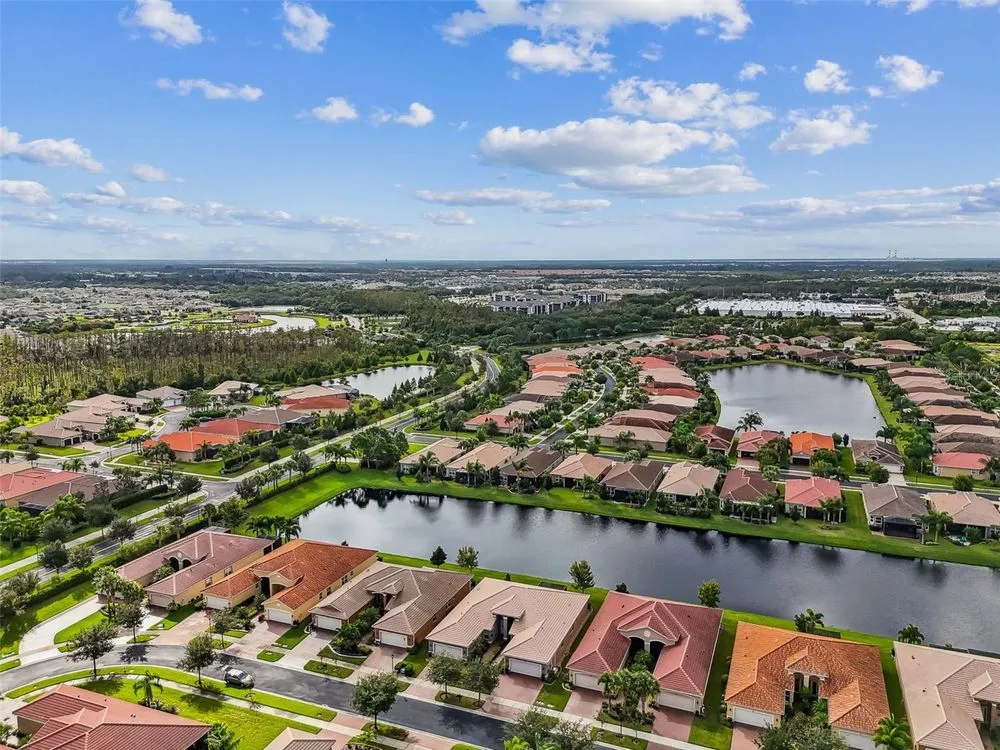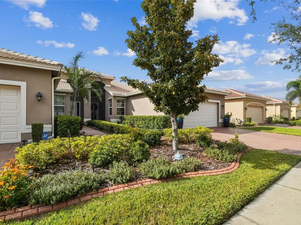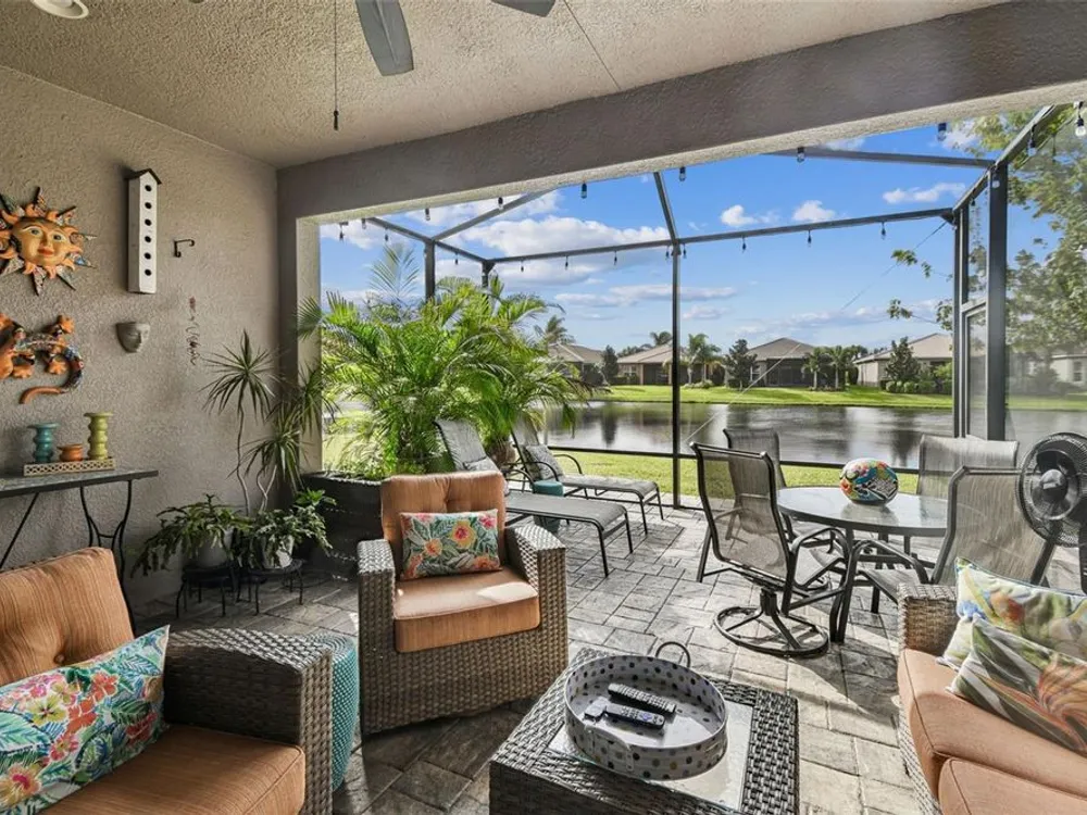 Nestled in one of the newest sections of Valencia Lakes, this exceptional Isabella Grande Model villa offers a serene, sought-after water view and that unmistakable “new home feel”—even though it was built just a few years ago! This is a rare opportunity, as villas on Marble Springs rarely come on the market. Your experience begins before you even step inside. The inviting, manicured landscaping and ornamental borders framing the walkway create superb curb appeal. The extended driveway easily accommodates two cars, and the sealed pavers add a polished touch. A screened front patio offers a private outdoor retreat to enjoy Florida’s beautiful days. Designed with exceptional care and taste, this home combines premium GL Homes upgrades with thoughtful owner enhancements to create a showcase of quality and comfort. Inside, an open split-bedroom floor plan and 9-foot ceilings welcome you with an airy, elegant ambiance. The hurricane-resistant glass front door allows soft natural light to fill the entryway, and 18x18 ceramic tiles, laid diagonally throughout (including both bedrooms), provide seamless sophistication. Elegant crown molding, 5¼-inch baseboards, and custom window valances accent every room. The gourmet kitchen is a chef’s delight, featuring quartz countertops, a high-quality infusion glass backsplash, and an extended raised breakfast bar offering additional seating. Upgraded GE stainless steel appliances include a range, microwave, double-door refrigerator, whisper-quiet dishwasher, and a recently replaced garbage disposal. The 42-inch wood cabinetry features soft-close drawers, pullout shelving, crown molding, under- and over-cabinet lighting, and a custom built-in pantry with rollout drawers. A cozy breakfast nook provides space for informal dining, and a Culligan reverse osmosis system ensures pure, crystal-clear water for drinking and cooking. The formal dining room easily accommodates large gatherings, perfect for entertaining. The primary suite is a tranquil retreat, offering a spacious walk-in closet designed by Closets by Design, and a fully remodeled ensuite bath with a double vanity, maple cabinetry, pullout shelving, and quartz countertops. The walk-in shower features a frameless glass door, floor-to-ceiling tile, a decorative infusion glass listello, and a built-in corner bench for comfort and accessibility. 2nd bdrm, currently used as an office/art studio, includes custom built-in cabinetry and a Murphy bed—both included in the sale. The second bath features a quartz countertop with an elegant banjo-style extension. The spacious living room opens through triple 8-foot sliding glass doors to an extended screened lanai, offering breathtaking water views and spectacular sunsets. Enjoy peaceful moments watching birds and wildlife from the privacy of your own home. Behind the lanai, extended pavers create the perfect grilling area for outdoor dining. Additional upgrades include: additional lighting and upgraded ceiling fans throughout, water softener system, hurricane shutters, rain-flow gutters, epoxy-coated garage flooring, separate A/C unit in the garage, extra shelving in the laundry, new water heater, well-maintained HVAC system, recently power-washed roof. It is move-in-ready home truly stands out for its quality, style, and attention to detail. Enjoy resort-style living in Valencia Lakes —where comfort, community, and Florida’s natural beauty come together perfectly.