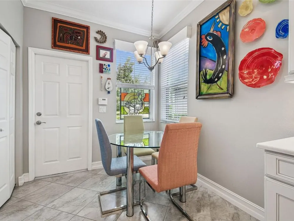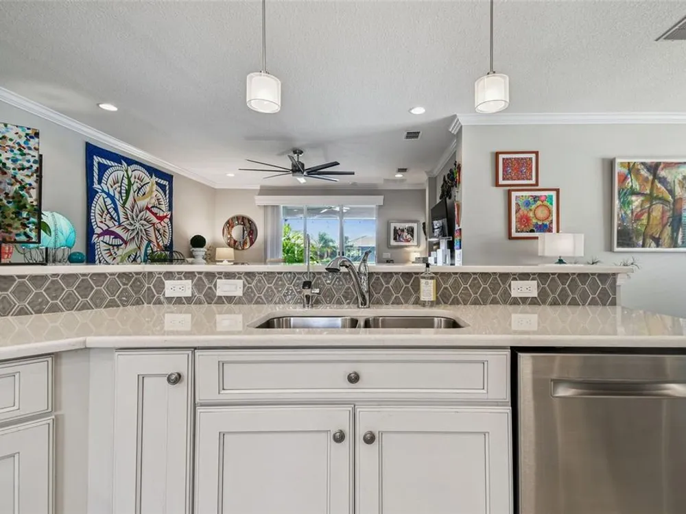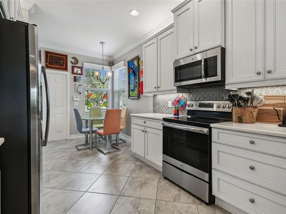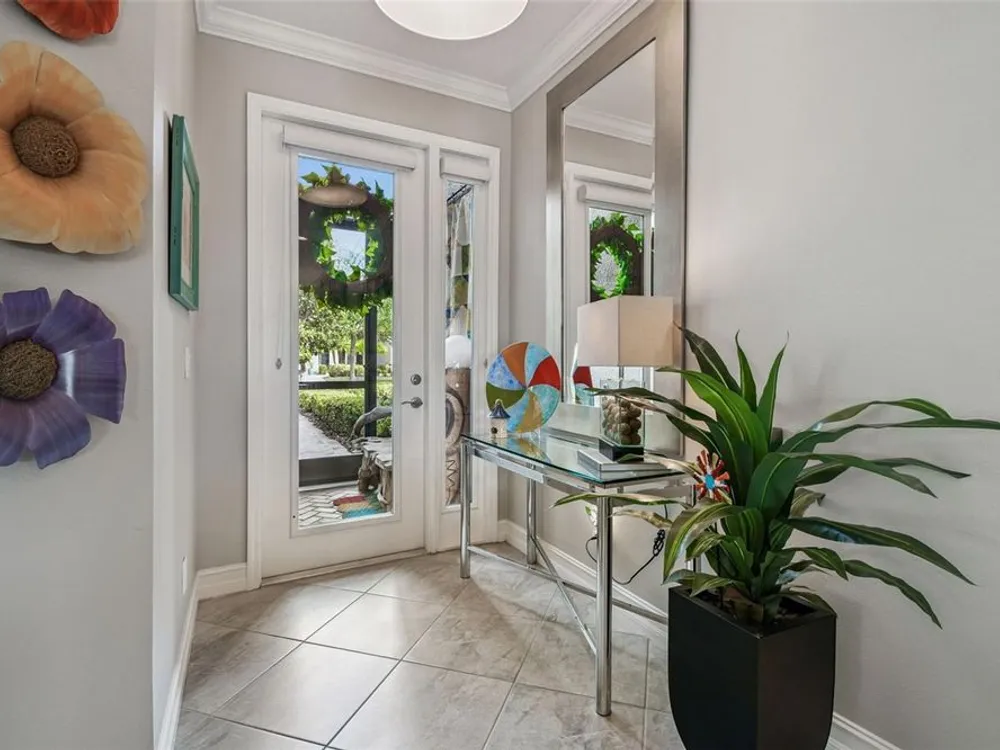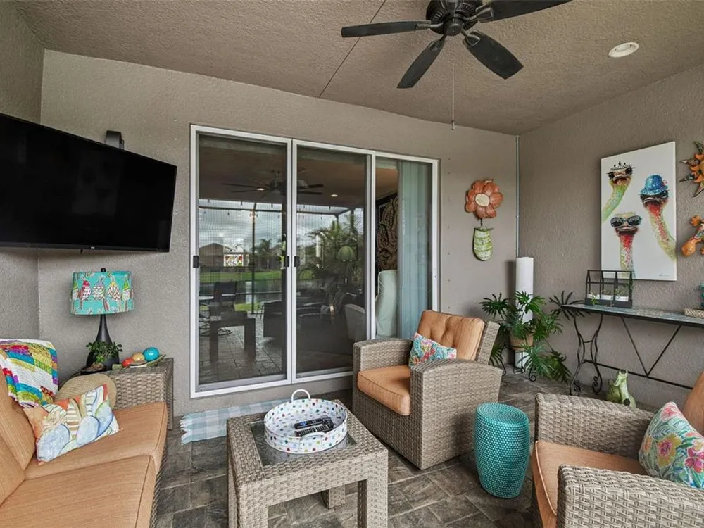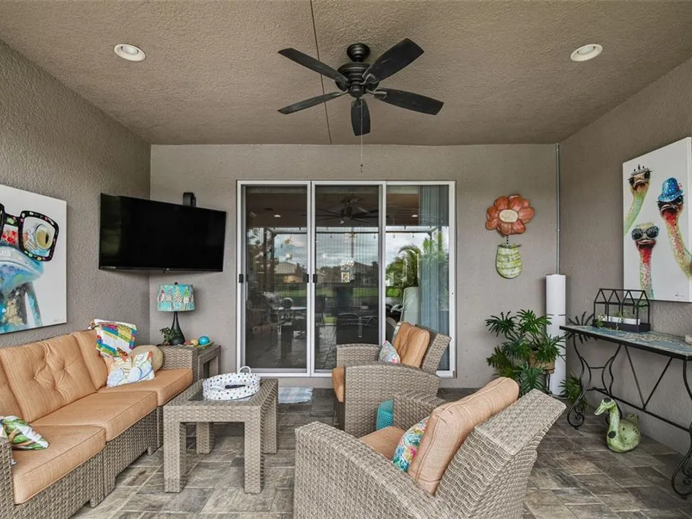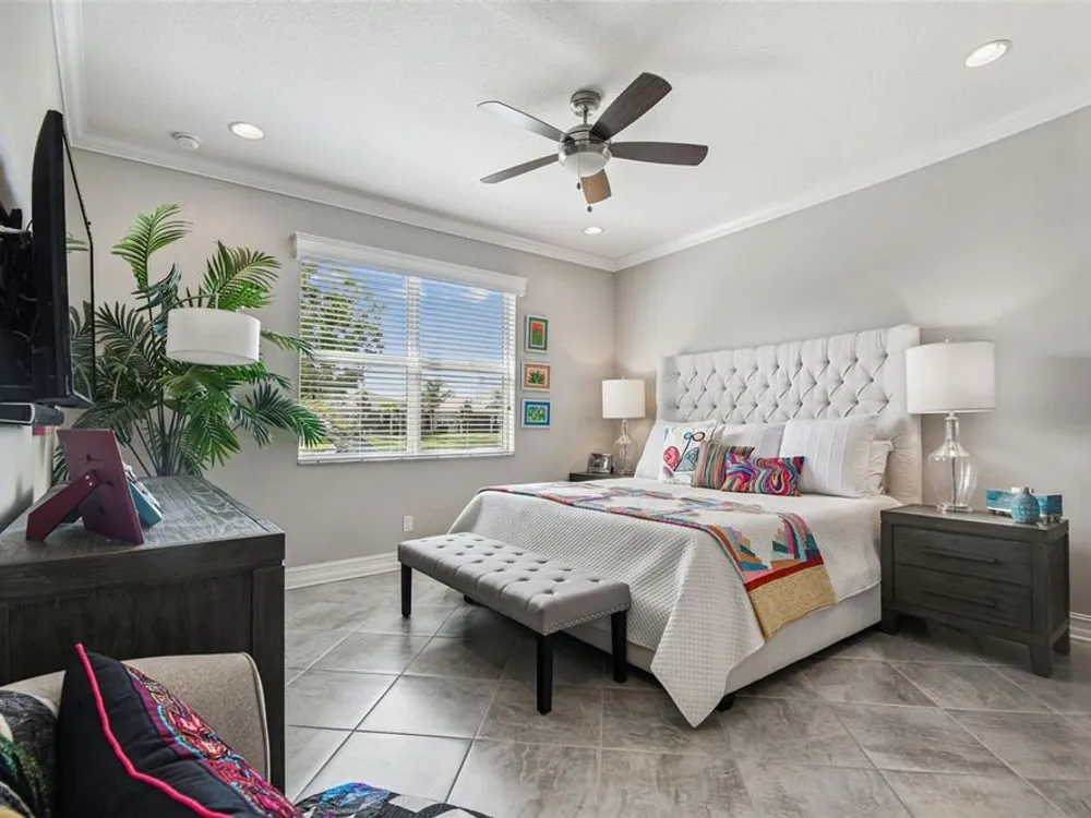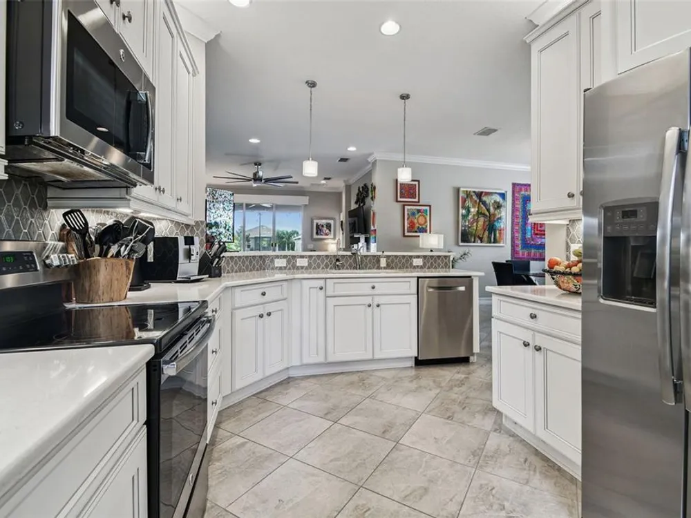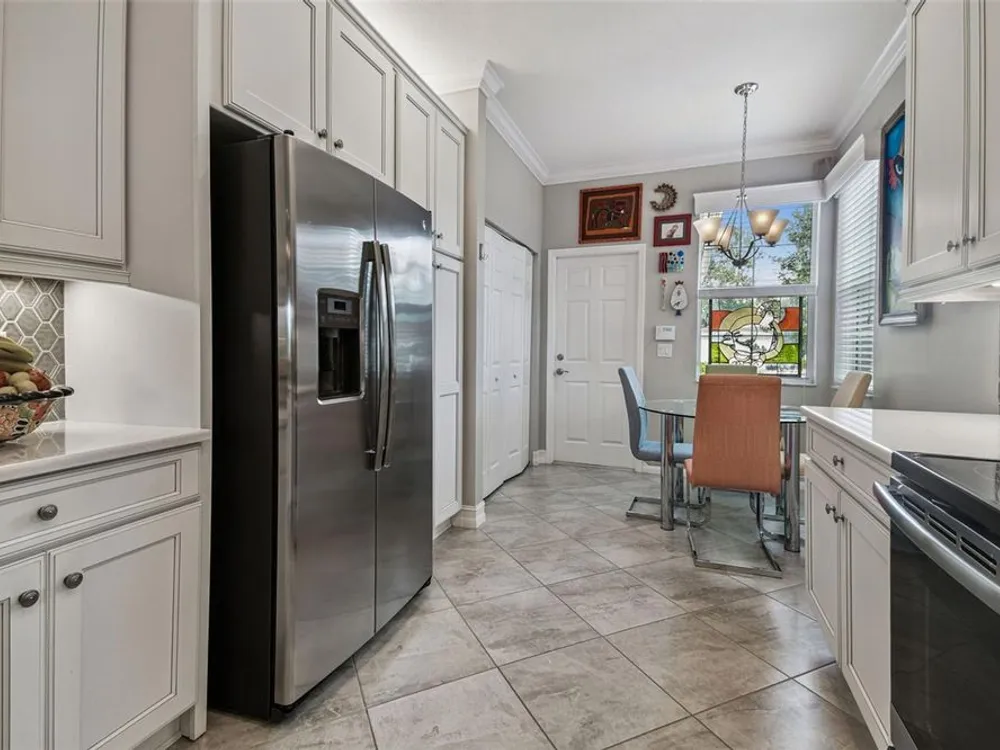 Nestled in one of the newest sections of Valencia Lakes, this exceptional Isabella Grande Model villa offers a serene, sought-after water view and that unmistakable “new home feel”—even though it was built just a few years ago! This is a rare opportunity, as villas on Marble Springs rarely come on the market. Your experience begins before you even step inside. The inviting, manicured landscaping and ornamental borders framing the walkway create superb curb appeal. The extended driveway easily accommodates two cars, and the sealed pavers add a polished touch. A screened front patio offers a private outdoor retreat to enjoy Florida’s beautiful days. Designed with exceptional care and taste, this home combines premium GL Homes upgrades with thoughtful owner enhancements to create a showcase of quality and comfort. Inside, an open split-bedroom floor plan and 9-foot ceilings welcome you with an airy, elegant ambiance. The hurricane-resistant glass front door allows soft natural light to fill the entryway, and 18x18 ceramic tiles, laid diagonally throughout (including both bedrooms), provide seamless sophistication. Elegant crown molding, 5¼-inch baseboards, and custom window valances accent every room. The gourmet kitchen is a chef’s delight, featuring quartz countertops, a high-quality infusion glass backsplash, and an extended raised breakfast bar offering additional seating. Upgraded GE stainless steel appliances include a range, microwave, double-door refrigerator, whisper-quiet dishwasher, and a recently replaced garbage disposal. The 42-inch wood cabinetry features soft-close drawers, pullout shelving, crown molding, under- and over-cabinet lighting, and a custom built-in pantry with rollout drawers. A cozy breakfast nook provides space for informal dining, and a Culligan reverse osmosis system ensures pure, crystal-clear water for drinking and cooking. The formal dining room easily accommodates large gatherings, perfect for entertaining. The primary suite is a tranquil retreat, offering a spacious walk-in closet designed by Closets by Design, and a fully remodeled ensuite bath with a double vanity, maple cabinetry, pullout shelving, and quartz countertops. The walk-in shower features a frameless glass door, floor-to-ceiling tile, a decorative infusion glass listello, and a built-in corner bench for comfort and accessibility. 2nd bdrm, currently used as an office/art studio, includes custom built-in cabinetry and a Murphy bed—both included in the sale. The second bath features a quartz countertop with an elegant banjo-style extension. The spacious living room opens through triple 8-foot sliding glass doors to an extended screened lanai, offering breathtaking water views and spectacular sunsets. Enjoy peaceful moments watching birds and wildlife from the privacy of your own home. Behind the lanai, extended pavers create the perfect grilling area for outdoor dining. Additional upgrades include: additional lighting and upgraded ceiling fans throughout, water softener system, hurricane shutters, rain-flow gutters, epoxy-coated garage flooring, separate A/C unit in the garage, extra shelving in the laundry, new water heater, well-maintained HVAC system, recently power-washed roof. It is move-in-ready home truly stands out for its quality, style, and attention to detail. Enjoy resort-style living in Valencia Lakes —where comfort, community, and Florida’s natural beauty come together perfectly.
