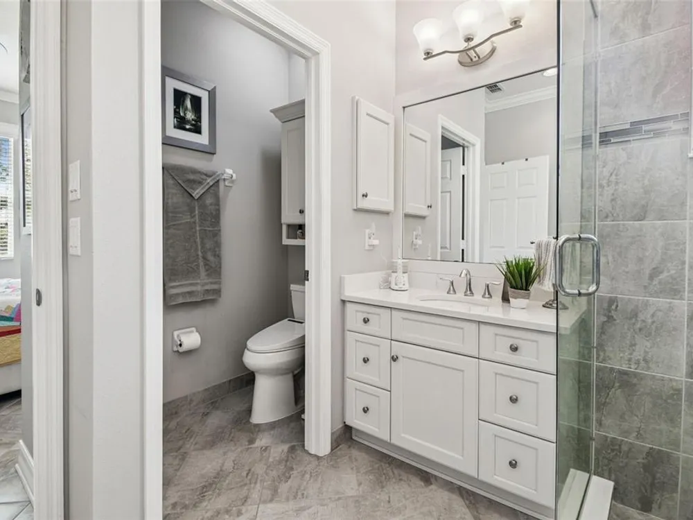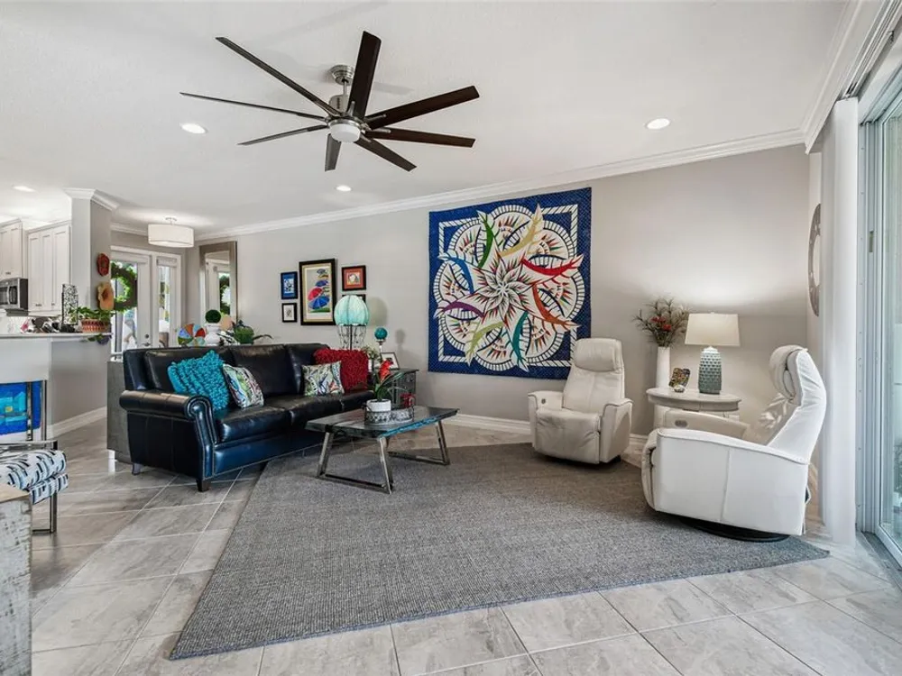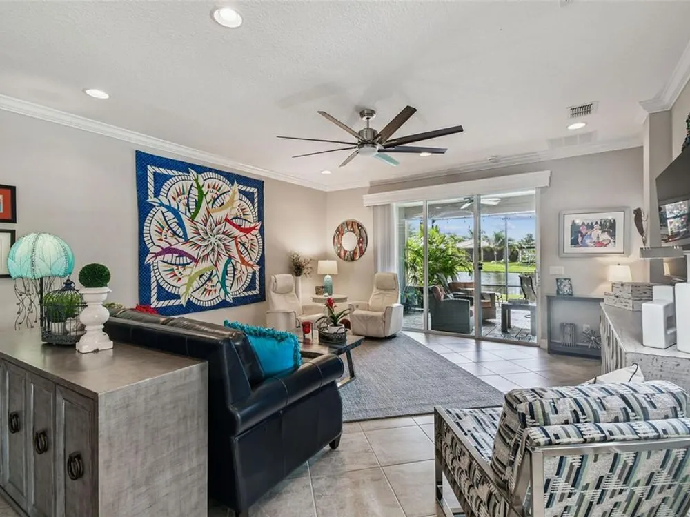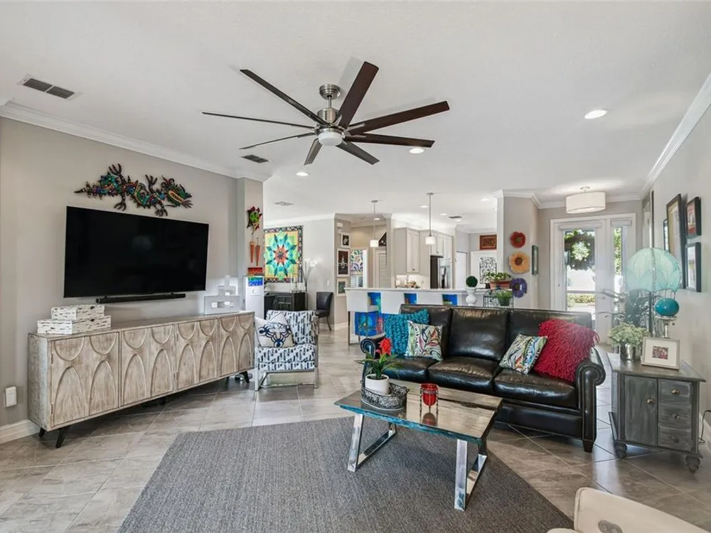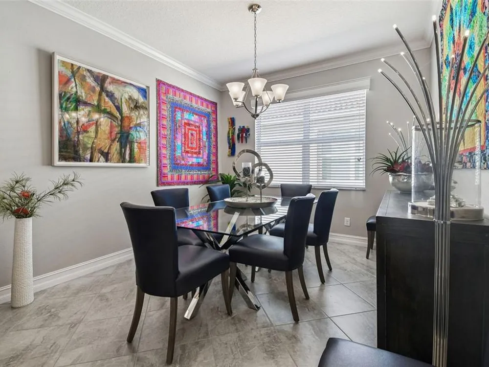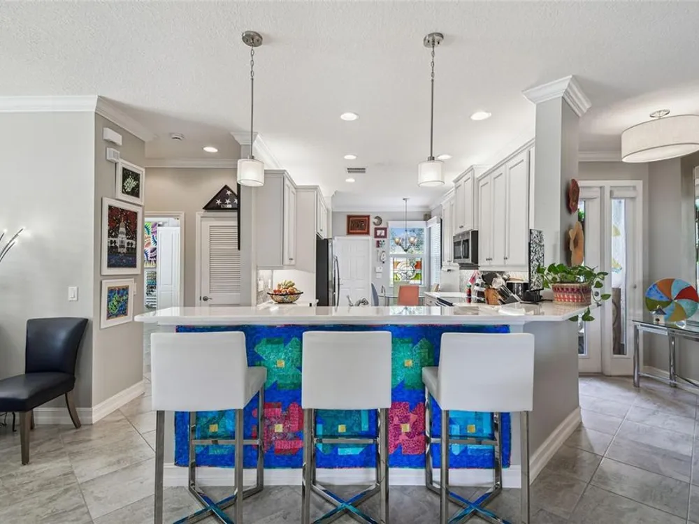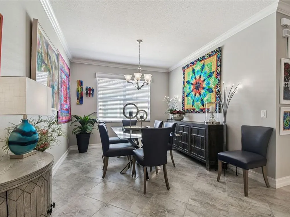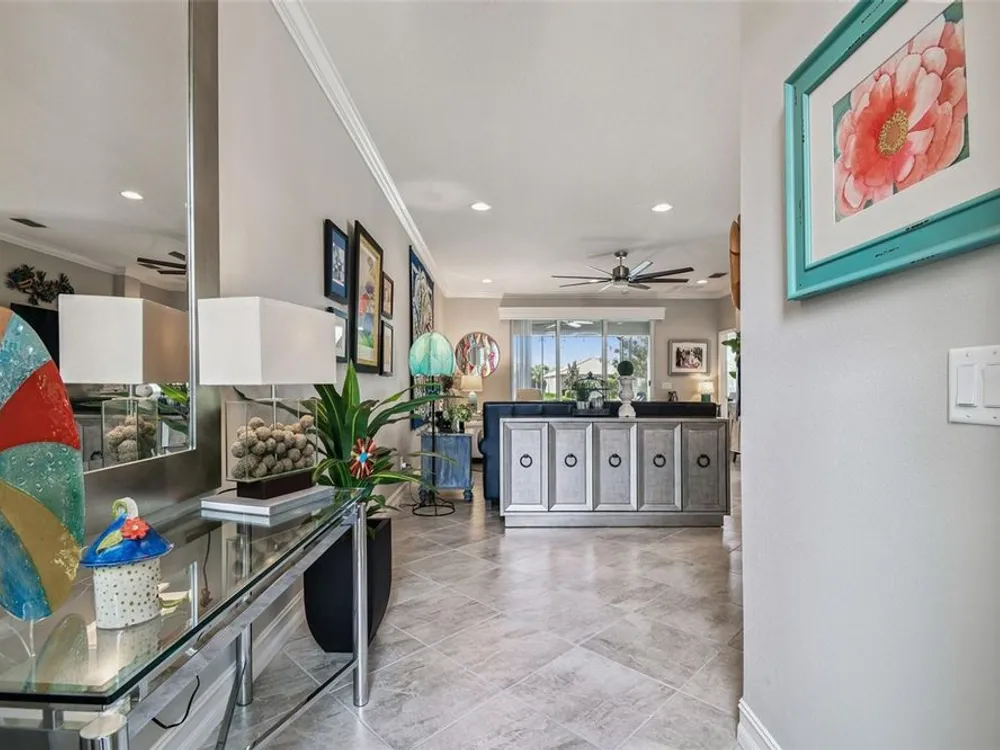 Nestled in one of the newest sections of Valencia Lakes, this exceptional Isabella Grande Model villa offers a serene, sought-after water view and that unmistakable “new home feel”—even though it was built just a few years ago! This is a rare opportunity, as villas on Marble Springs rarely come on the market. Your experience begins before you even step inside. The inviting, manicured landscaping and ornamental borders framing the walkway create superb curb appeal. The extended driveway easily accommodates two cars, and the sealed pavers add a polished touch. A screened front patio offers a private outdoor retreat to enjoy Florida’s beautiful days. Designed with exceptional care and taste, this home combines premium GL Homes upgrades with thoughtful owner enhancements to create a showcase of quality and comfort. Inside, an open split-bedroom floor plan and 9-foot ceilings welcome you with an airy, elegant ambiance. The hurricane-resistant glass front door allows soft natural light to fill the entryway, and 18x18 ceramic tiles, laid diagonally throughout (including both bedrooms), provide seamless sophistication. Elegant crown molding, 5¼-inch baseboards, and custom window valances accent every room. The gourmet kitchen is a chef’s delight, featuring quartz countertops, a high-quality infusion glass backsplash, and an extended raised breakfast bar offering additional seating. Upgraded GE stainless steel appliances include a range, microwave, double-door refrigerator, whisper-quiet dishwasher, and a recently replaced garbage disposal. The 42-inch wood cabinetry features soft-close drawers, pullout shelving, crown molding, under- and over-cabinet lighting, and a custom built-in pantry with rollout drawers. A cozy breakfast nook provides space for informal dining, and a Culligan reverse osmosis system ensures pure, crystal-clear water for drinking and cooking. The formal dining room easily accommodates large gatherings, perfect for entertaining. The primary suite is a tranquil retreat, offering a spacious walk-in closet designed by Closets by Design, and a fully remodeled ensuite bath with a double vanity, maple cabinetry, pullout shelving, and quartz countertops. The walk-in shower features a frameless glass door, floor-to-ceiling tile, a decorative infusion glass listello, and a built-in corner bench for comfort and accessibility. 2nd bdrm, currently used as an office/art studio, includes custom built-in cabinetry and a Murphy bed—both included in the sale. The second bath features a quartz countertop with an elegant banjo-style extension. The spacious living room opens through triple 8-foot sliding glass doors to an extended screened lanai, offering breathtaking water views and spectacular sunsets. Enjoy peaceful moments watching birds and wildlife from the privacy of your own home. Behind the lanai, extended pavers create the perfect grilling area for outdoor dining. Additional upgrades include: additional lighting and upgraded ceiling fans throughout, water softener system, hurricane shutters, rain-flow gutters, epoxy-coated garage flooring, separate A/C unit in the garage, extra shelving in the laundry, new water heater, well-maintained HVAC system, recently power-washed roof. It is move-in-ready home truly stands out for its quality, style, and attention to detail. Enjoy resort-style living in Valencia Lakes —where comfort, community, and Florida’s natural beauty come together perfectly.