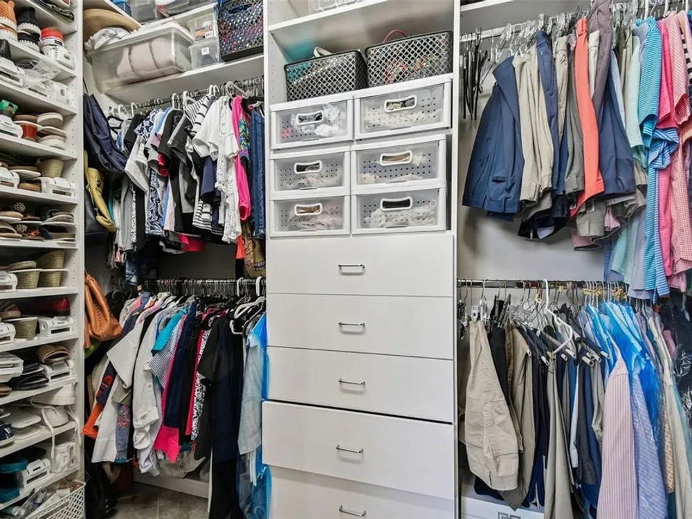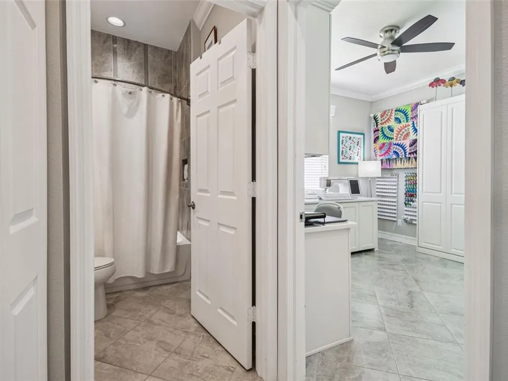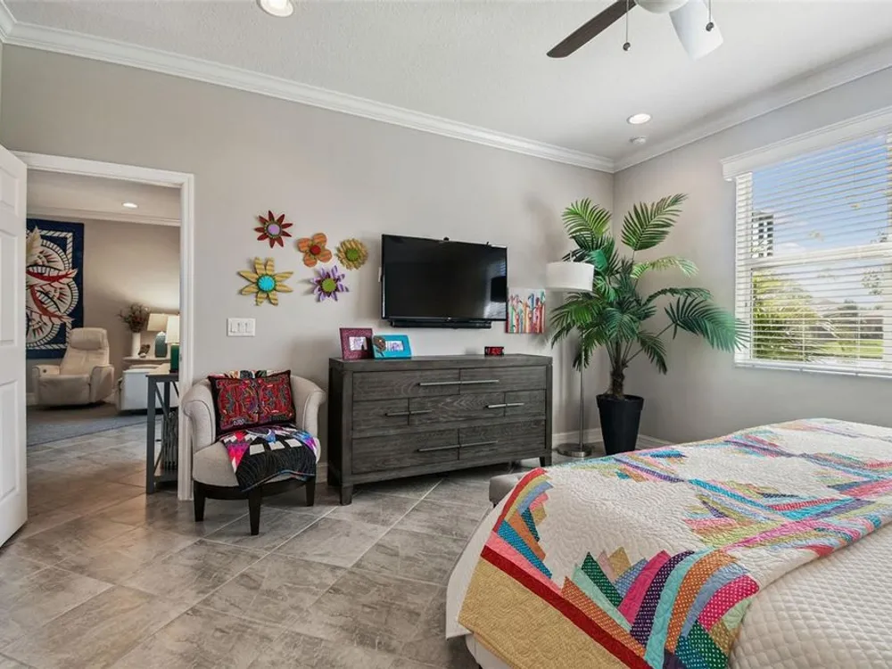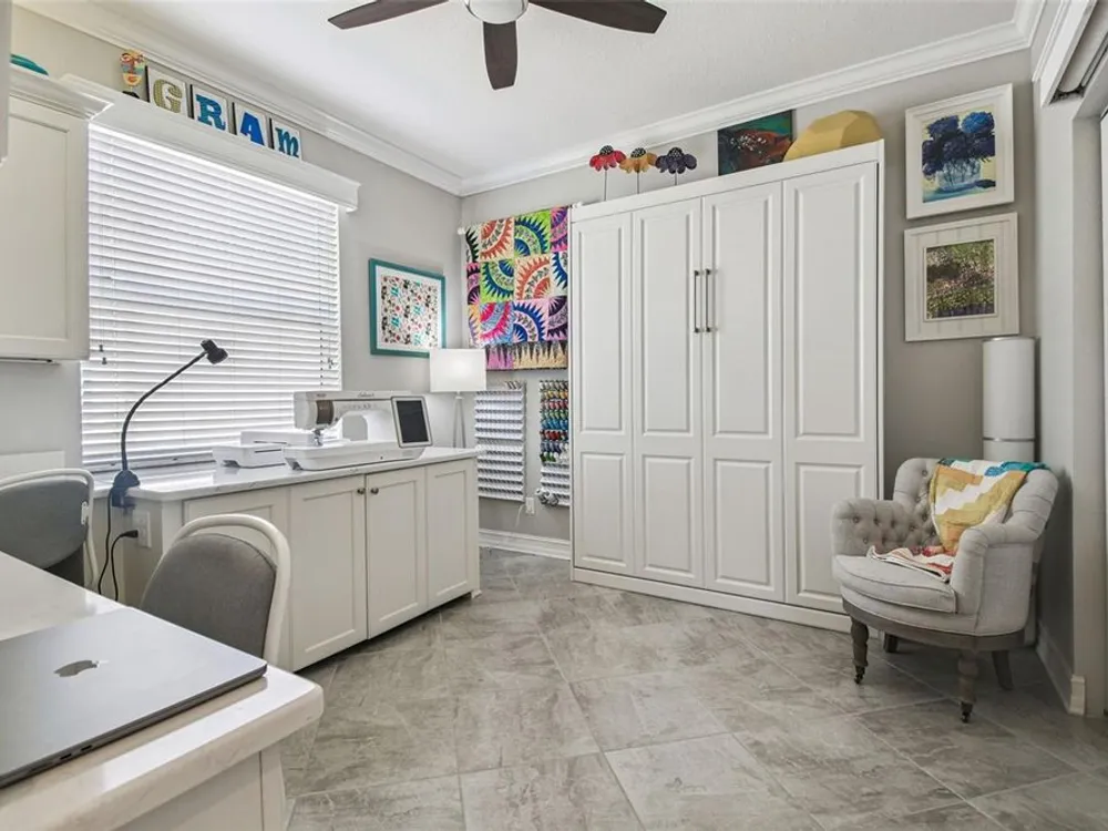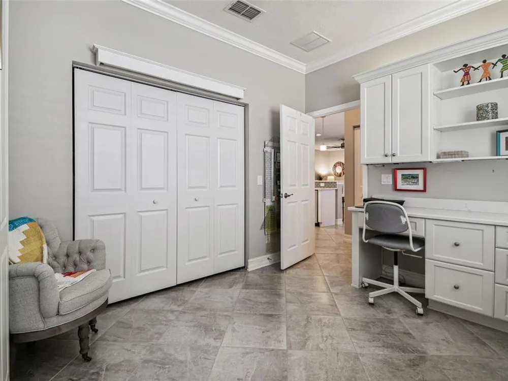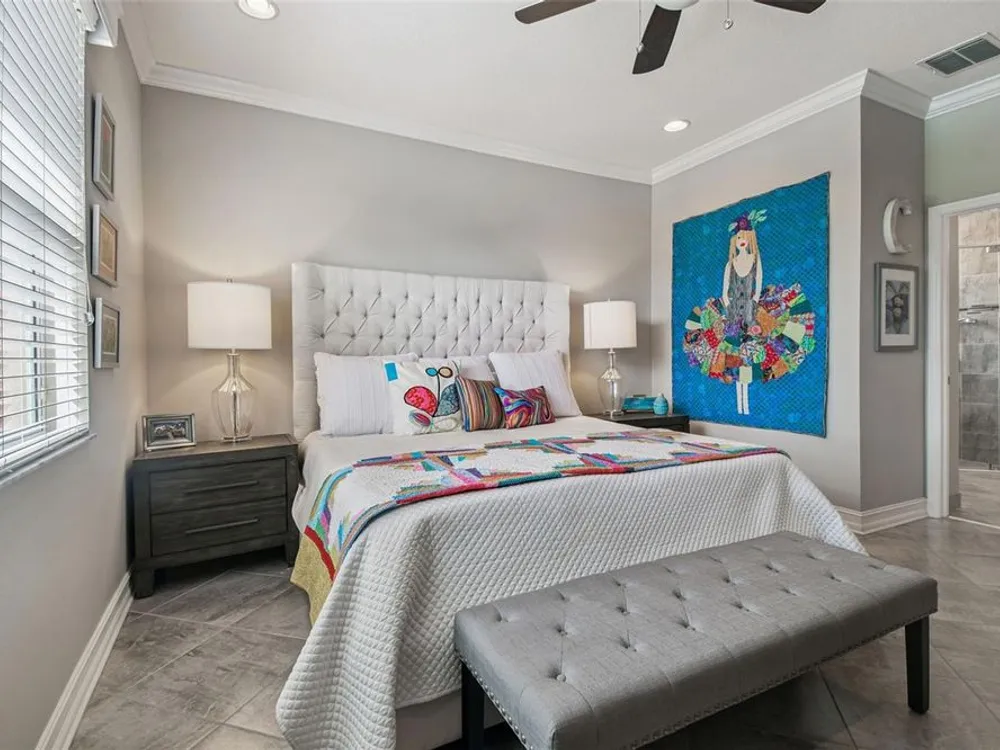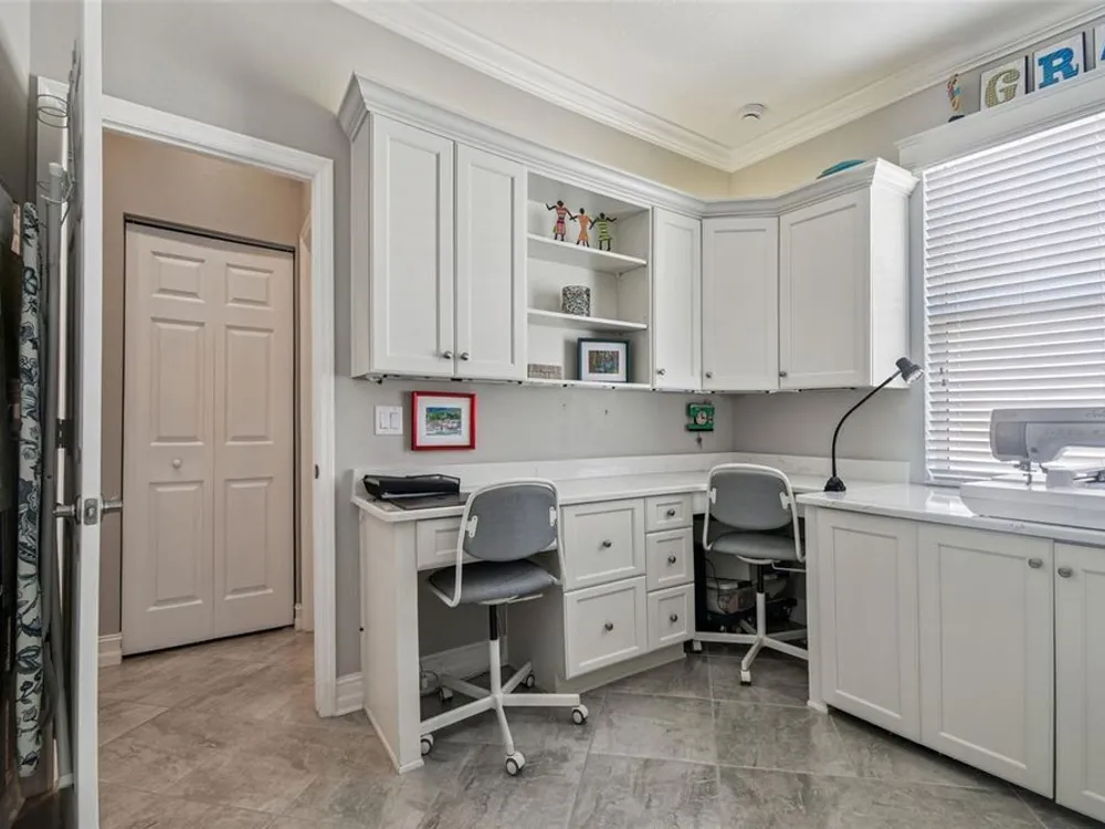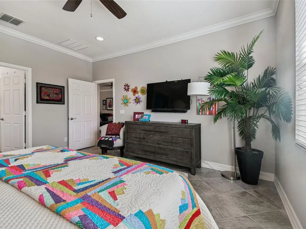 - Built-in Features, Ceiling Fan(s), Crown Molding, Eat-in Kitchen, High Ceilings, Open Floorplan, Main Level Primary, Solid Surface Counters, Solid-Wood Cabinets, Split Bedrooms, Stone Counters, Thermostat, Walk-In Closet(s), Window Treatments