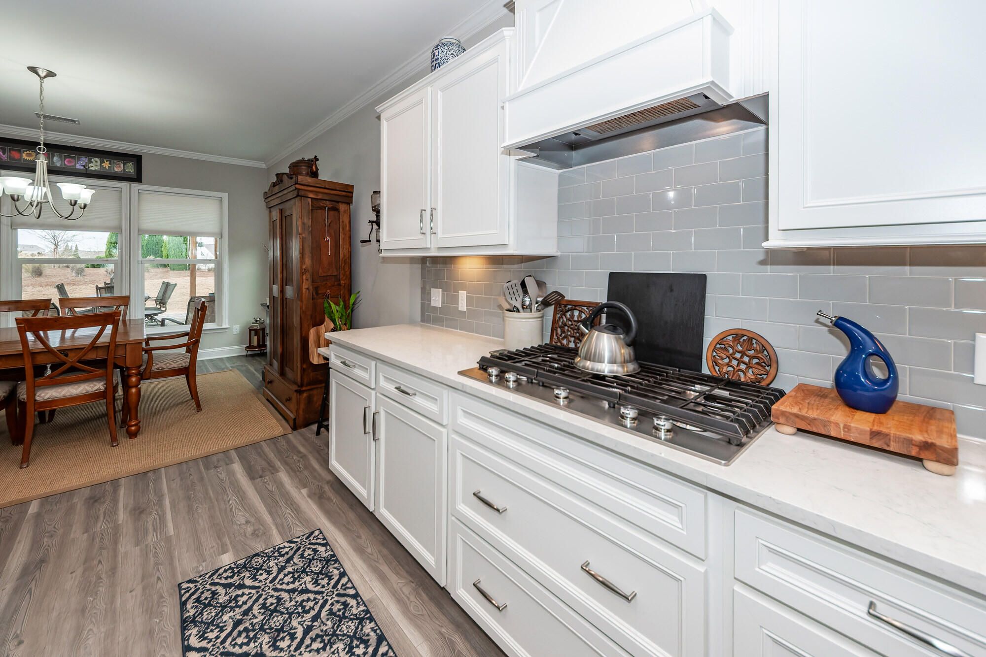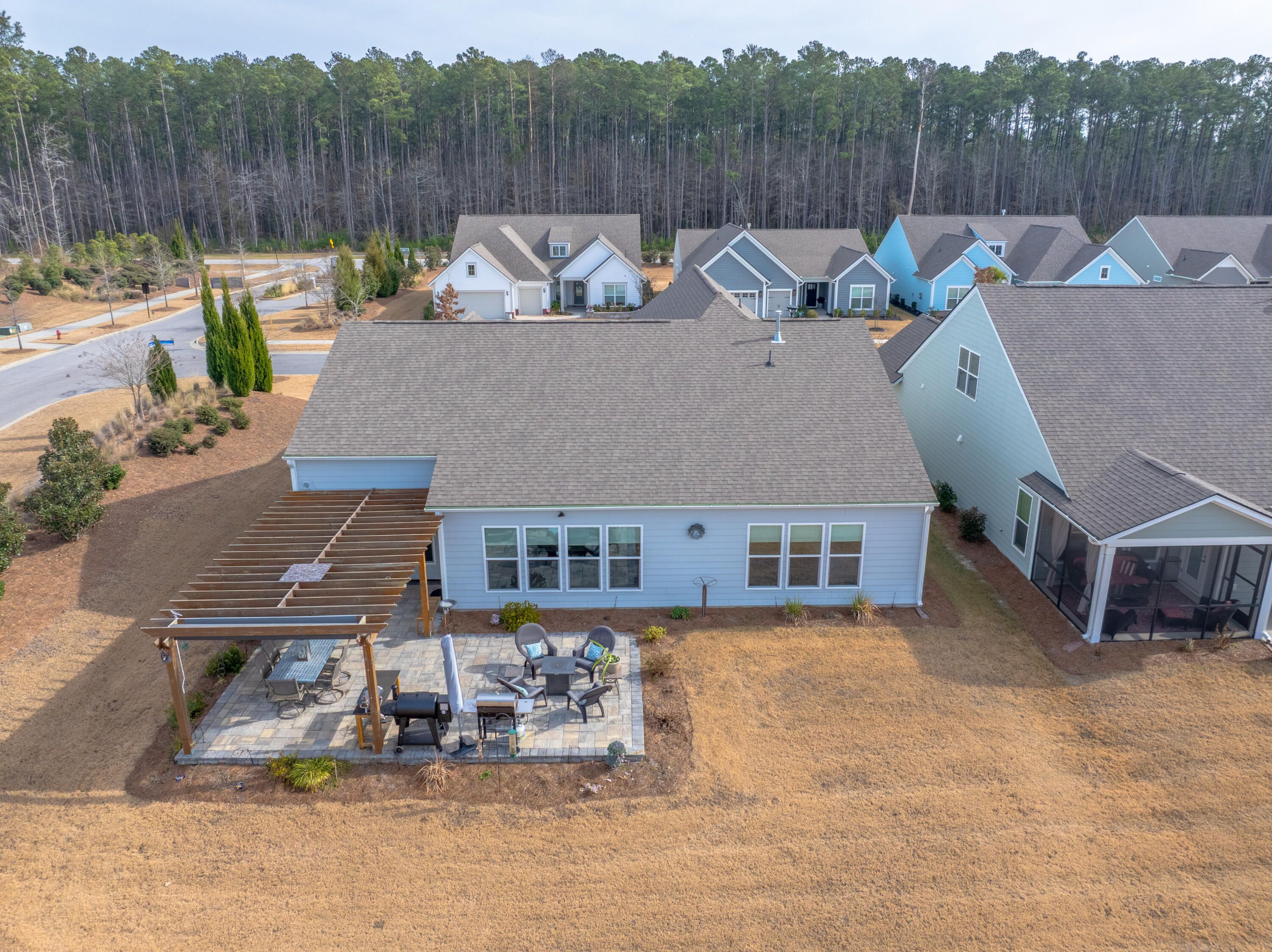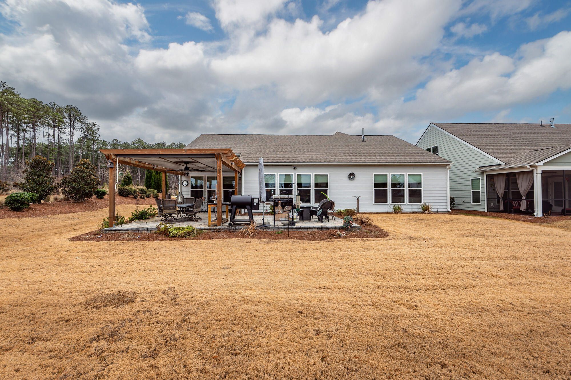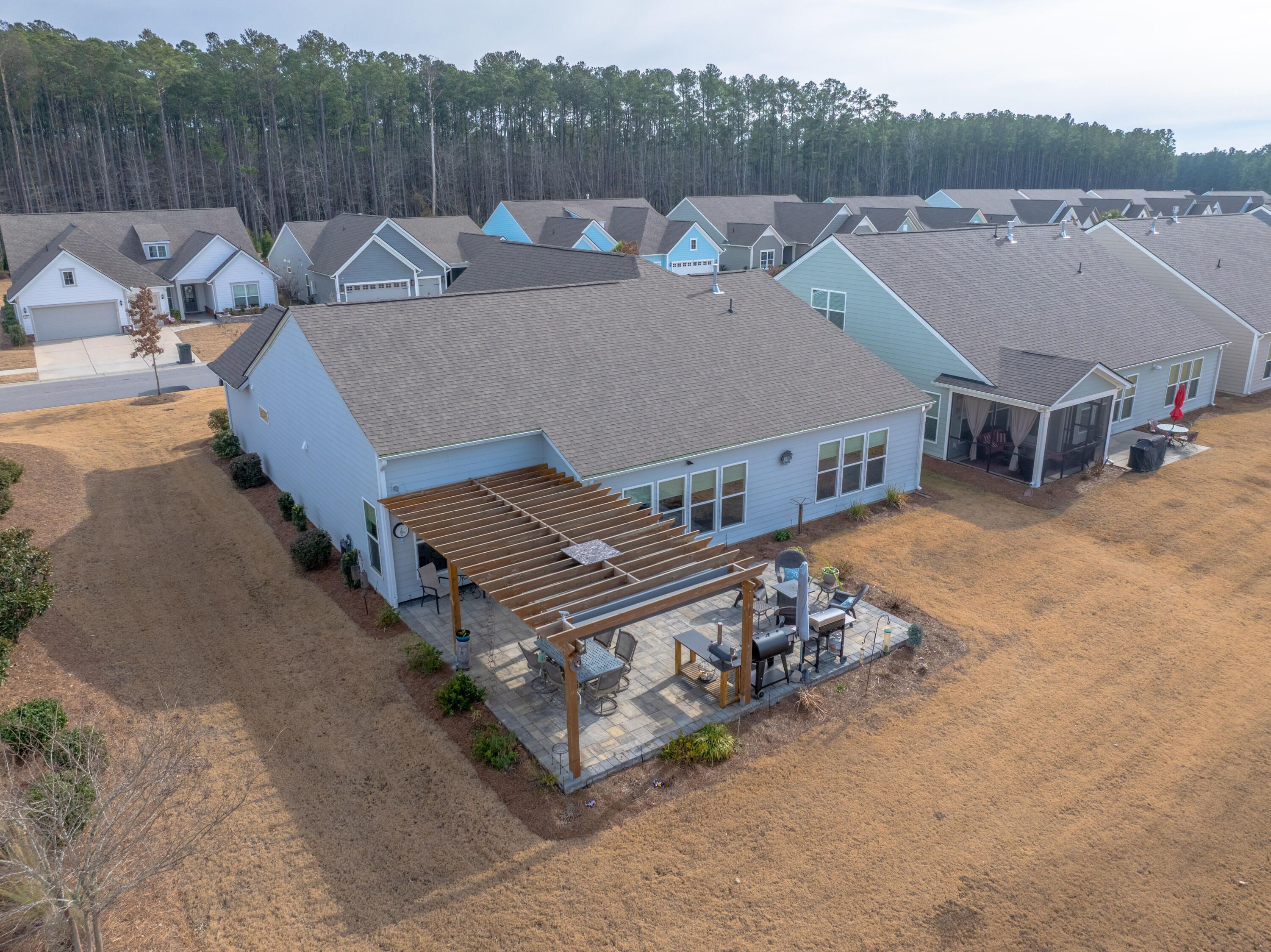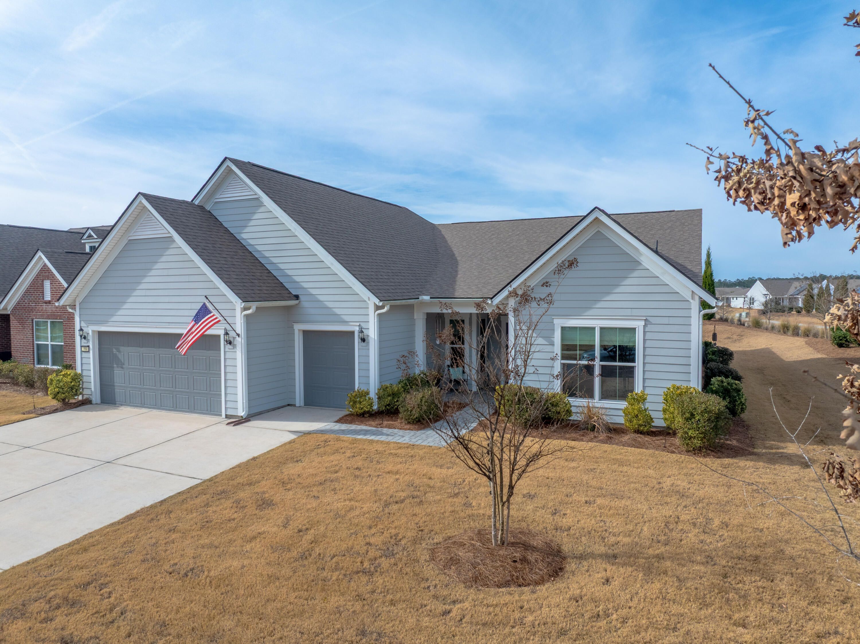 Discover sophisticated open-concept living in this stunning Dunwoody Way floor plan, perfectly tailored for both entertaining and quiet enjoyment. The heart of the home showcases a chef's gourmet kitchen that is as beautiful as it is functional, featuring a spacious island, KitchenAid appliances, quartz countertops, and thoughtful upgrades like soft-close cabinets, pull-out shelves, under cabinet lighting and a walk-in pantry. This beautifully designed 3-bedroom, 3-bathroom home seamlessly connects a large living room, formal dining room, and an expansive sunroom. A dedicated office provides a quiet space for productivity. The generously sized primary bedroom serves as a true private retreat, offering a bright, airy sanctuary.Indulge in the spa-like ensuite bathroom, which highlights a zero-entry shower complete with both a rain shower head and a convenient handheld shower head, all complemented by a massive walk-in closet. For uninterrupted comfort and peace of mind, this exceptional home also includes a whole-home generator and whole house surge protection. The convenience continues in the climate-controlled 2.5-car garage. Thoughtfully designed with a 4-foot extension, it includes specific, dedicated space for your golf cart, making community travel easy. Step outside to your private backyard oasis, designed for relaxation and entertaining. This corner lot features extensive patio pavers, natural berm features for privacy, and a beautiful 12x14 pergola with adjustable sun shades. This home stands out with numerous additional upgrades designed for comfort and style. The interior boasts crown molding, recessed lighting, custom window shades, and ceiling fans throughout. Enjoy low-maintenance living with beautiful laminate wood and tile flooring (no carpet). Further enhancements include an energy-efficient tankless water heater and a full lawn irrigation system. Located within the private, gated community of Del Webb Nexton, residents enjoy a premier resort-style lifestyle. Full access is granted to an impressive array of amenities, including both indoor and outdoor pools, as well as dedicated tennis and pickleball courts, complemented by a state-of-the-art fitness center. Completed in 2022, this home includes the balance of its 10-year builder structural warranty, with approximately six years of coverage still in place. Schedule your showing today and fall in love with this incredible home.