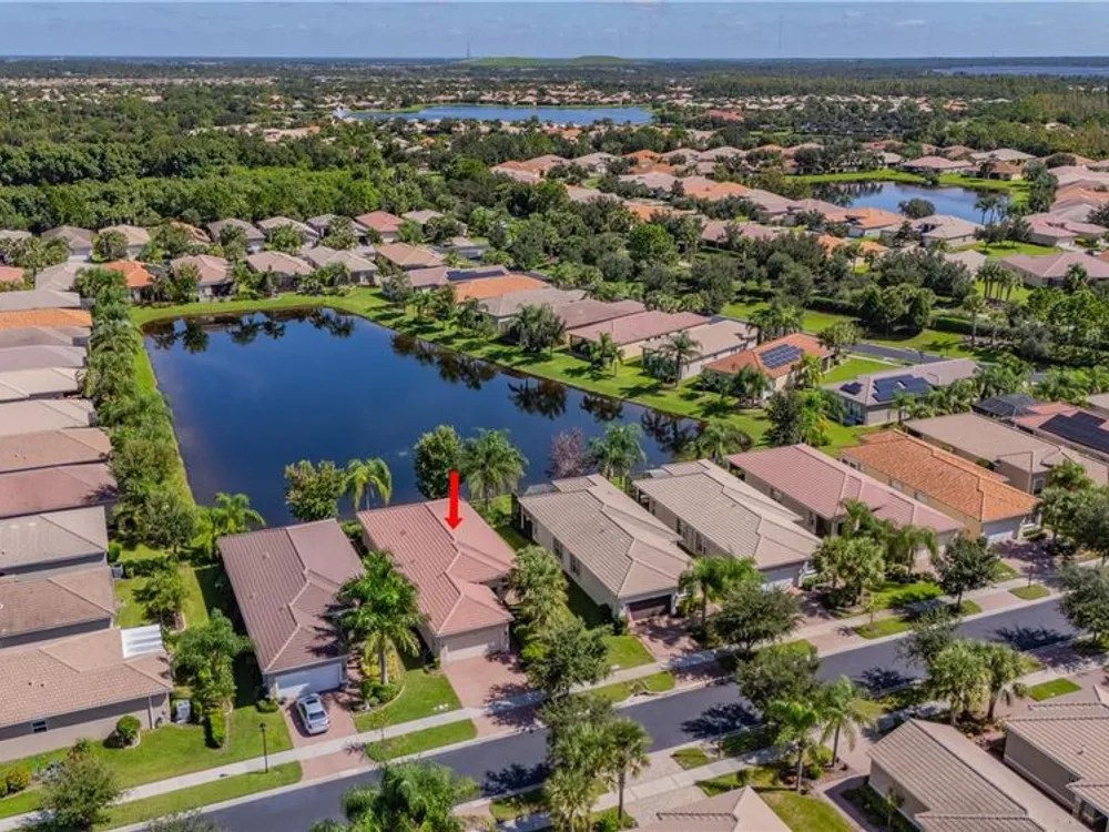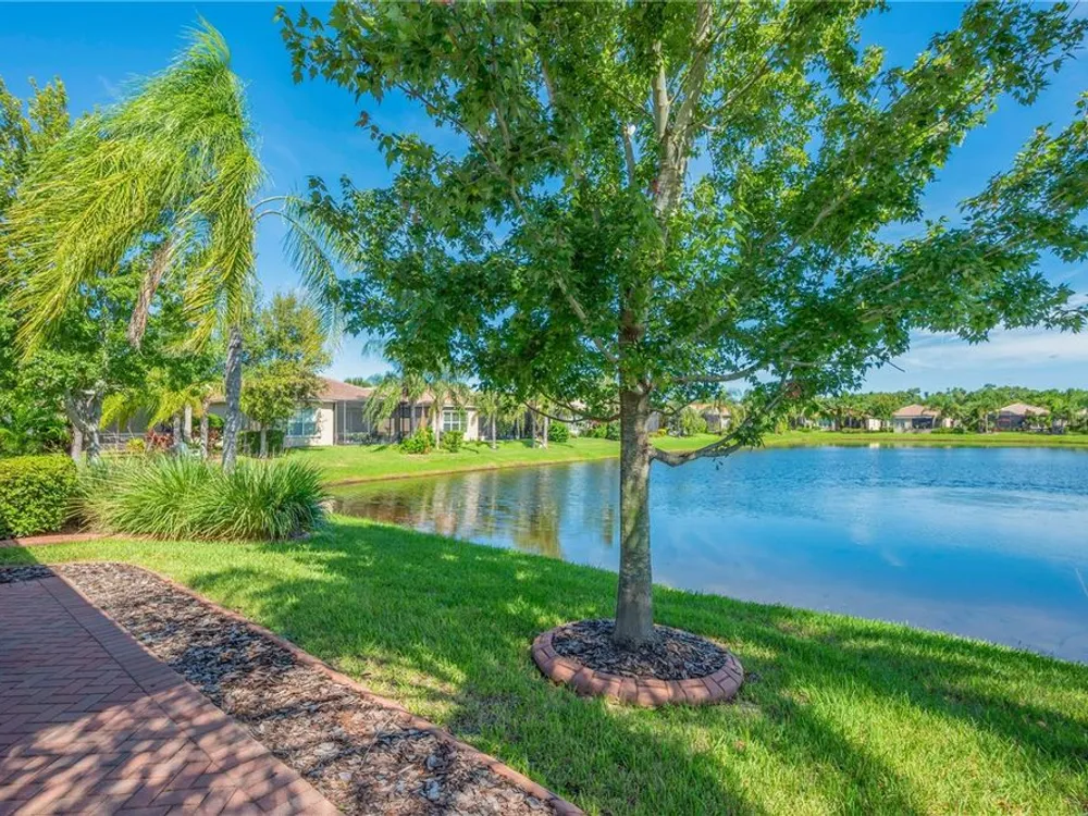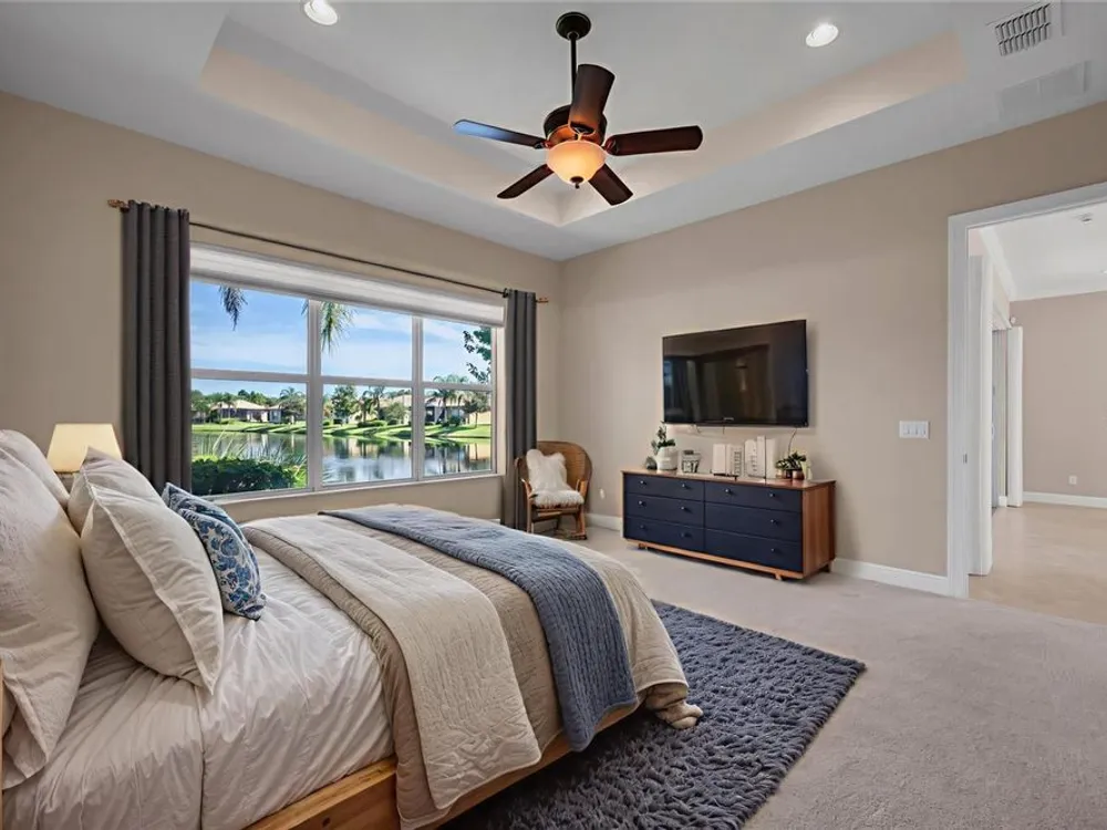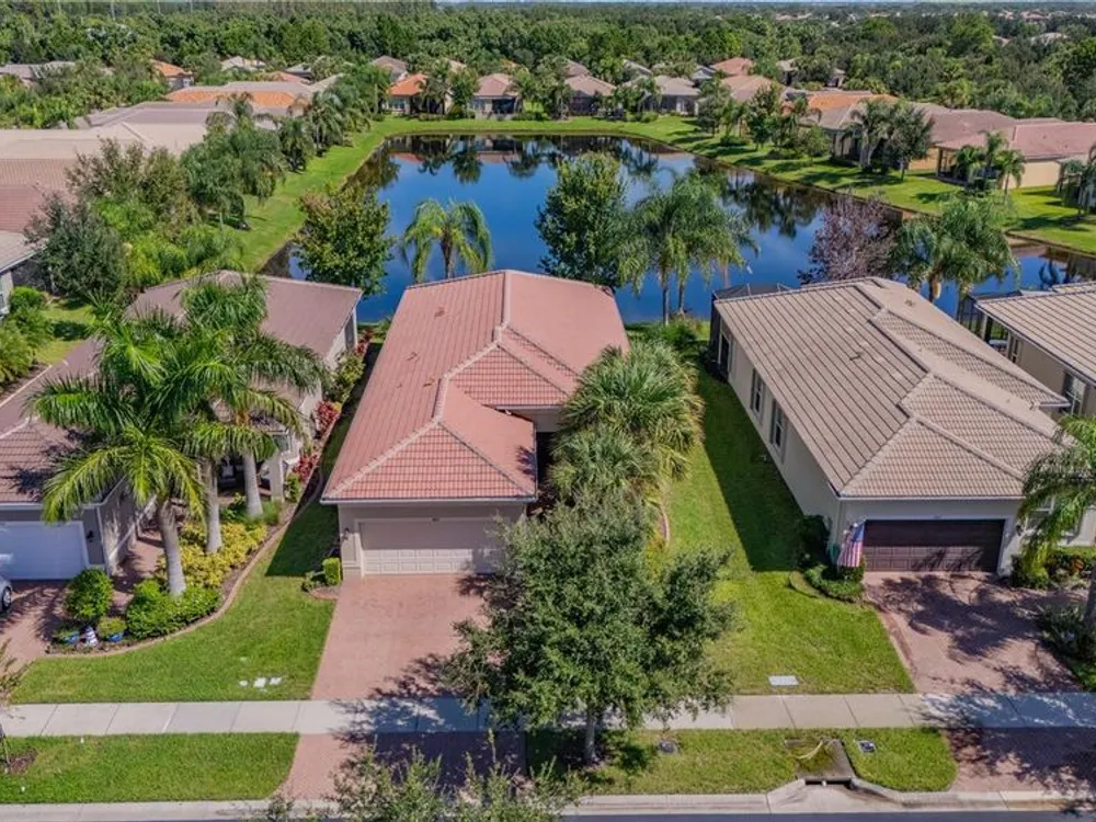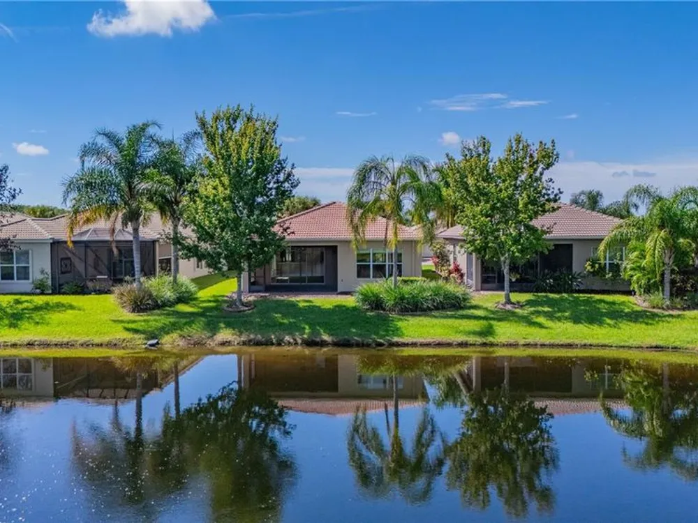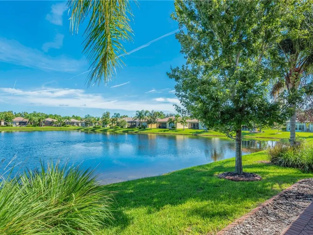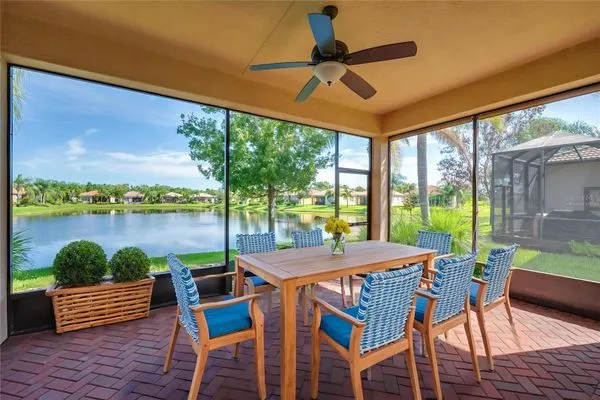 One or more photo(s) has been virtually staged. Welcome to this spectacular move-in-ready home, where elegance meets comfort in one of Tampa Bay’s premier 55+ communities, Valencia Lakes. This stunning Capri model, part of the coveted Signature Collection, offers one of the most sought-after floor plans in the community and showcases breathtaking water views from the moment you step inside. The home’s curb appeal is unmatched, featuring a brick paver driveway and walkway, a beautiful barrel tile roof, and professionally maintained landscaping. Step through the front door and you’ll be greeted by a 12-foot coffered ceiling in the foyer with crown molding, setting the tone for the open and airy design throughout. Large floor tiles, laid diagonally, span the main living areas and the spacious den, which can easily function as a third bedroom and features elegant double glass French doors. The great room is an entertainer’s dream, with triple 8-foot sliding glass doors that lead to a covered, screened lanai offering a peaceful and picturesque water view. Whether you're enjoying your morning coffee or hosting friends, this tranquil outdoor space is sure to become your favorite retreat. The gourmet kitchen is equally impressive, boasting upgraded quartz countertops, an undermount stainless steel sink with an R/O system, 42" soft-close maple cabinets with roll-out shelving, a pantry cabinet, under and over-cabinet lighting, a designer backsplash, and upgraded stainless steel appliances. A charming breakfast bay window floods the space with natural light, while the adjacent informal dining room provides a cozy spot for special meals. Retreat to the primary suite where comfort and luxury blend seamlessly. The bedroom features a coffered ceiling, newly installed plush carpet, and two large walk-in closets with custom built-ins. The en-suite bath is your private oasis, complete with dual vanities topped with quartz, maple cabinetry, a spacious walk-in shower, and a separate Roman tub for soaking. Guests will enjoy their own private space with a generously sized second bedroom and a well-appointed second bath featuring a tub/shower combo, full tile surround, quartz countertop with extended “banjo” top, and maple cabinetry. A separate laundry room adds to the home’s functionality with an upgraded GE front-load washer and dryer, utility sink, and additional cabinetry for storage. Thoughtful upgrades continue throughout the home, including luxury window treatments and plantation shutters, extra recessed lighting, an insulated garage door with epoxy flooring, a water softener system, whole-home surge protector, hurricane shutters, landscape curbing, gutters, a new water heater (2022), a brand-new HVAC system installed in 2024 and more. Valencia Lakes is known for its vibrant lifestyle and top-tier amenities, including a 40,000 square-foot clubhouse, 24-hour fitness center, resort-style pools, on-site bistro, tennis and pickleball courts, bocce ball, dozens of clubs, live entertainment, arts and crafts studios, cooking classes, walking trails, and more. This is not just a home—it’s a lifestyle. Don’t miss the opportunity to make this immaculate, move-in-ready residence your own. Come experience the best of 55+ living at Valencia Lakes today.